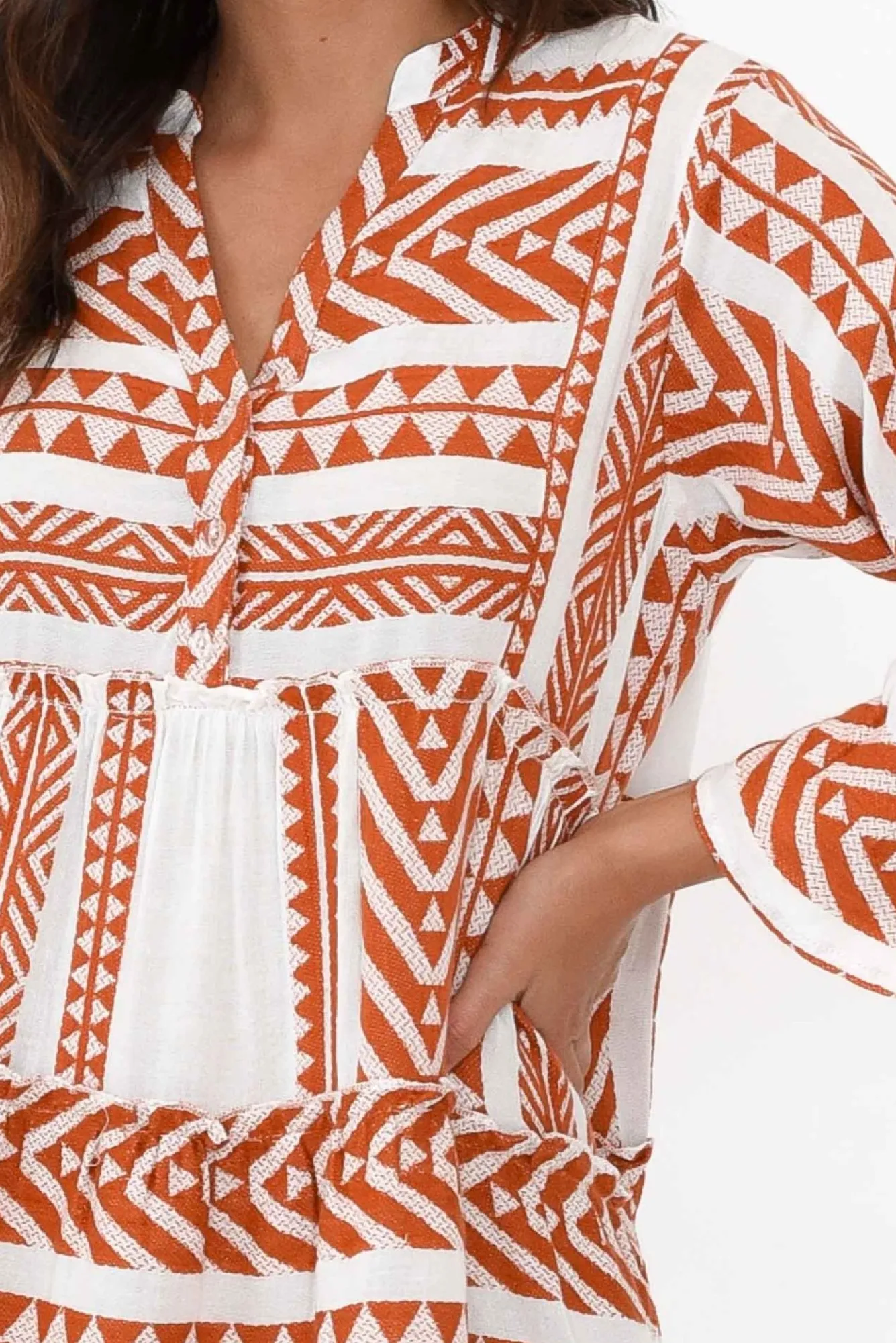 Fit: True To Size. Refer To Size & Fit Tab Below For Specific Size RecommendationNNfabric: 100% CottonNconstructed From Lightweight, Breathable And Non-Stretch Textured Cotton Fabric Nbanded V-Split Neckline Elevated With Functional Button Down The BustNN3/4 Length Sleeves With Statement Frill Cuff Detail Nrelaxed Tiered A-Line Silhouette NNtwo Discreet Side Seam Pockets NNstraight Hemline Falls Above Knee Length NNcare: Cool Gentle Hand Wash RecommendedNNcolour: White Base With Intricate Rust Embroidery NNstyle Tip: Fabric Can Appear Slightly Sheer, We Recommend Pairing With A Slip For Additional Coverage.