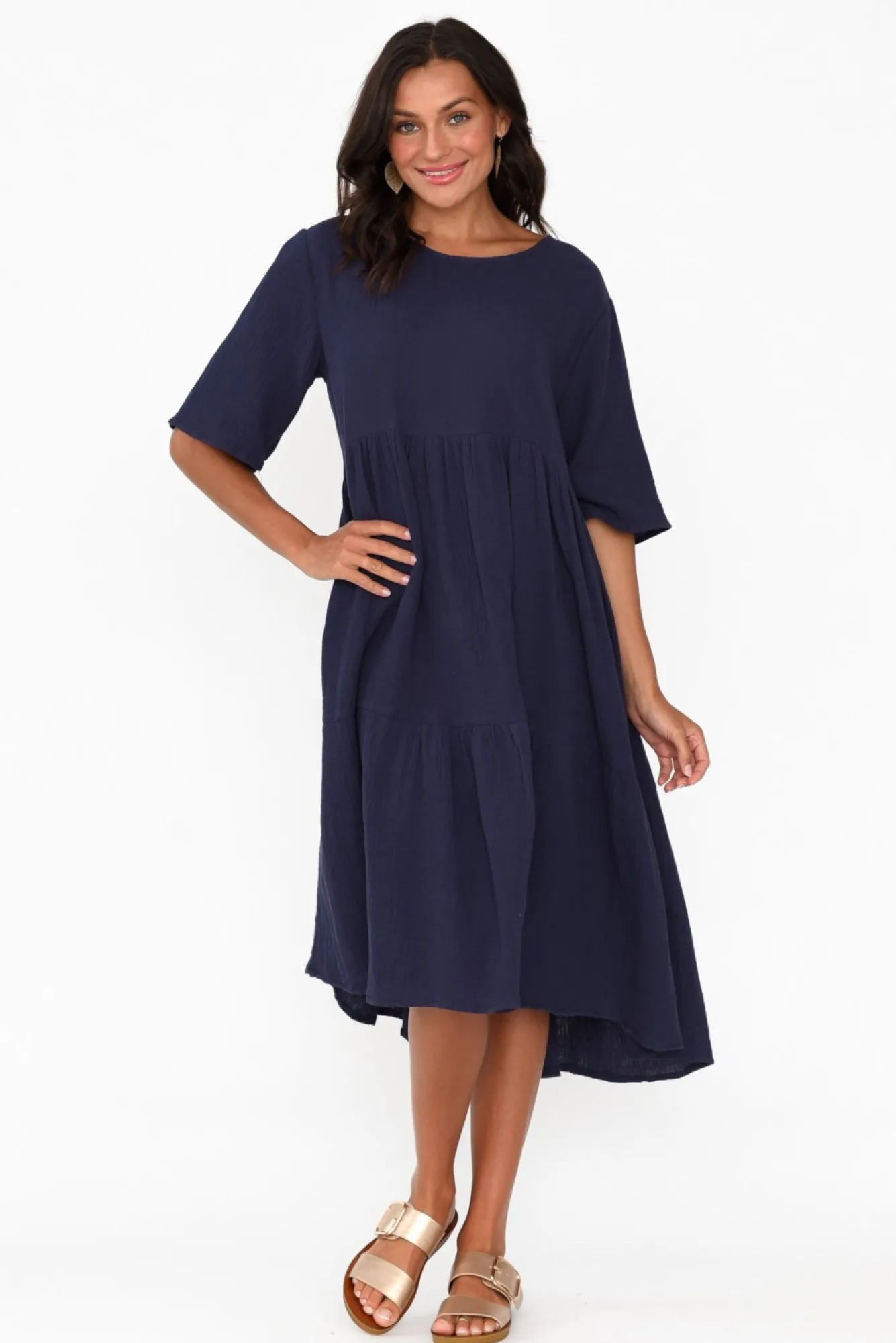 Fit: True To Size. Refer To Size & Fit Tab Below For Specific Size RecommendationNNfabric: 100% CottonNlightweight, Breathable And Soft Cotton With A Lovely Cheesecloth Finish NNtimeless Round Neckline Skims Below The Collarbones NNstraight Half-Length Sleeves NNbreezy, Tiered A-Line Silhouette NNhemline Falls Below Knee Length For A Versatile Look NNNcare: Cool Gentle Machine Wash RecommendedNNcolour: Deep Oceanic Navy