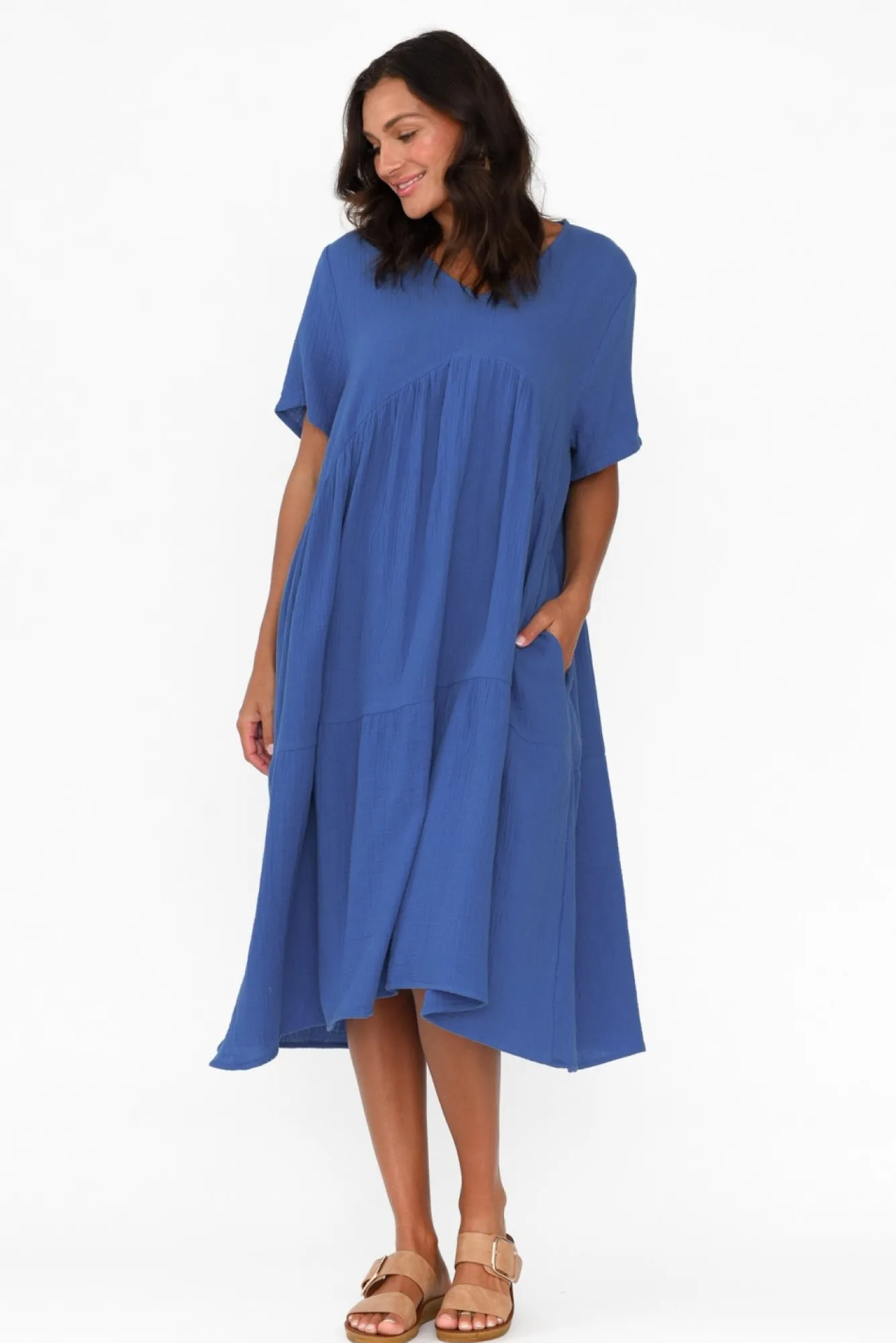 Fit: True To Size. Refer To Size & Fit Tab Below For Specific Size RecommendationNNfabric: 100% CottonNlightweight, Breathable And Non-Stretch Cotton With A Lovely Cheesecloth FinishNNsoft V-Neckline Frames The Collarbones NNstraight Half Length Sleeves NNbreezy A-Line Silhouette Enhanced By Feature Peak Detail Under The BustNNtwo Discreet Pockets Located In Side Seams NNsubtle Hi-Lo Hemline Falls Below Knee LengthNNNcare: Cool Gentle Machine Wash RecommendedNNcolour: Deep Cobalt Hue