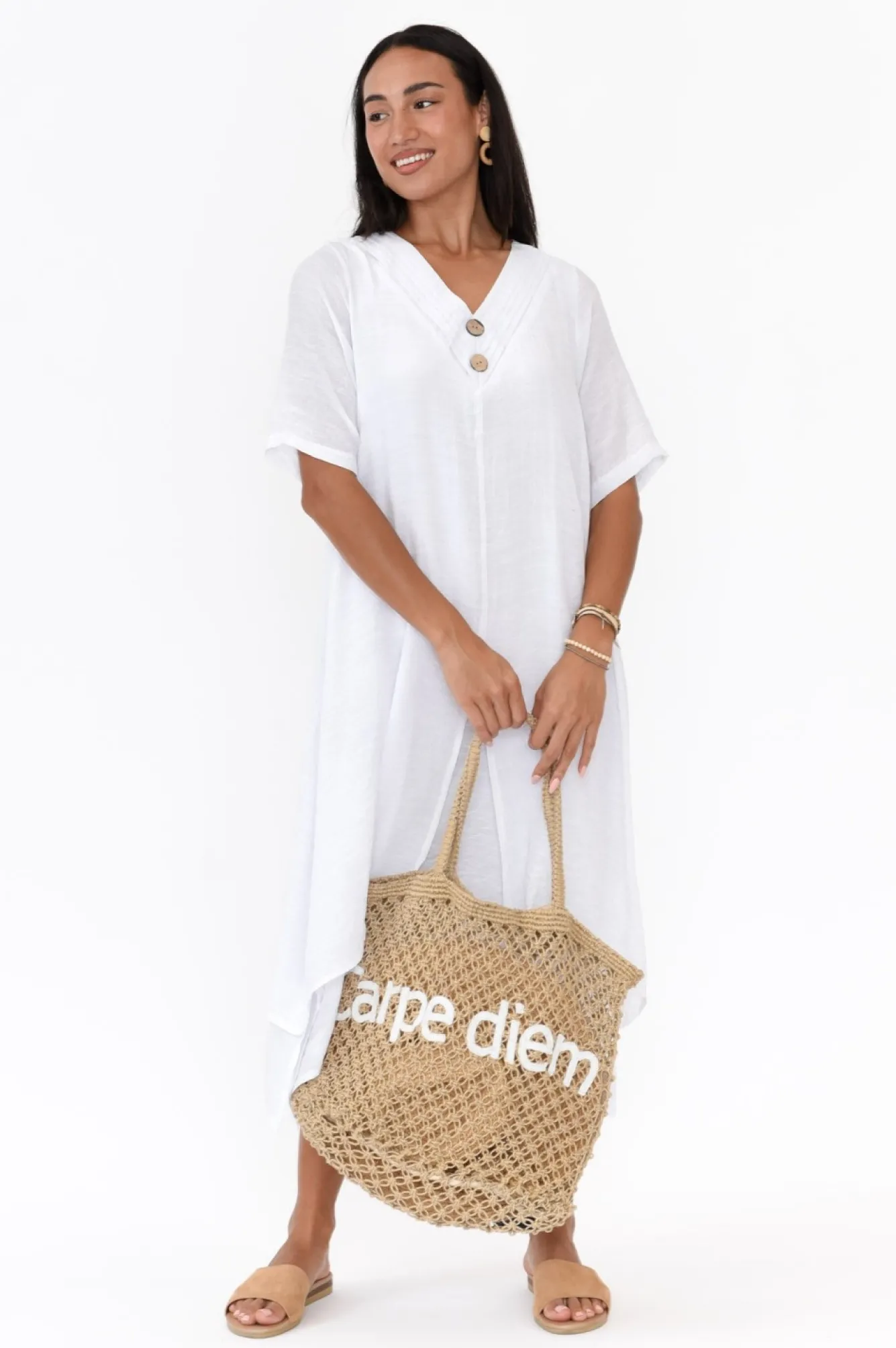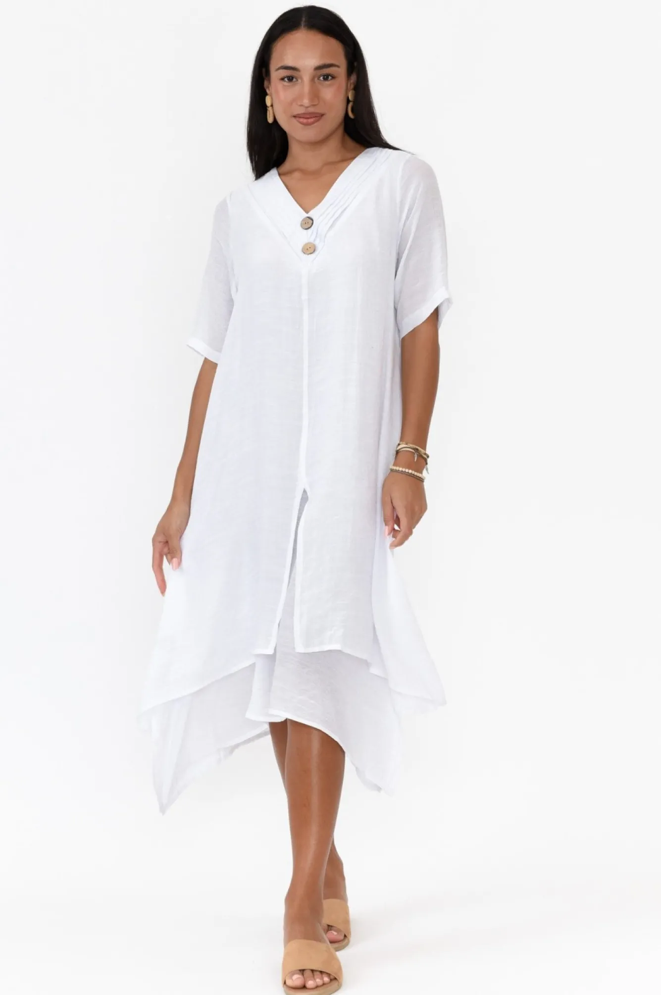 Fit: True To Size. Refer To Size & Fit Tab Below For Specific Size RecommendationNNfabric: 60% Polyester, 40% CottonNNlightweight, Non-Stretch Fabric With A Subtle Woven Hand Feel NNstriking V-Neckline With Layer DetailNtwo Wooden Feature Buttons Cascading From BustNNsimple Half-Length SleevesNNflattering A-Line SilhouetteNfeature Front Split On The Outer LayerNasymmetric Layered Hemline Falls To A Midi LengthNNNcare: Cool Gentle Hand Wash RecommendedNNcolour: Fresh White Shade