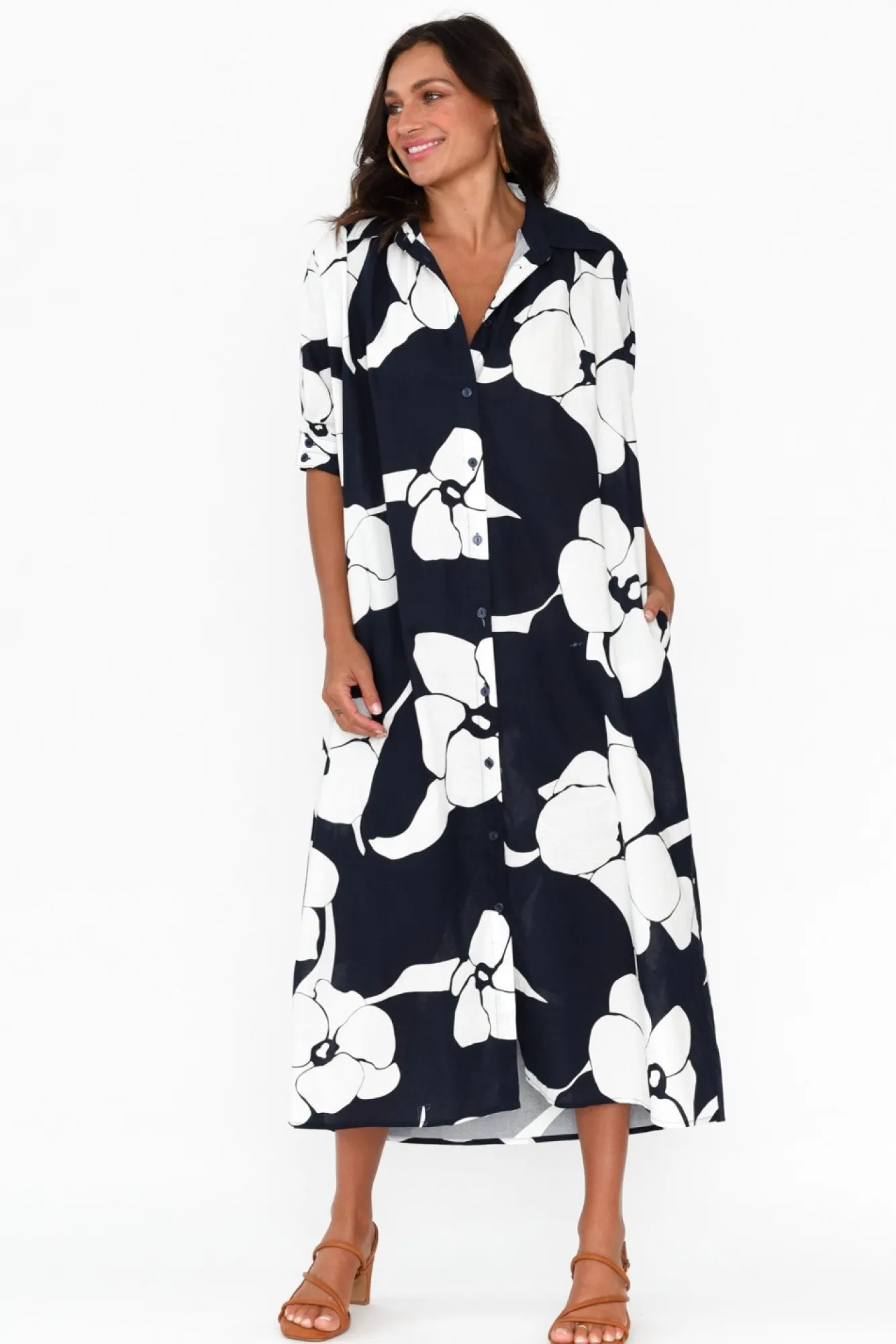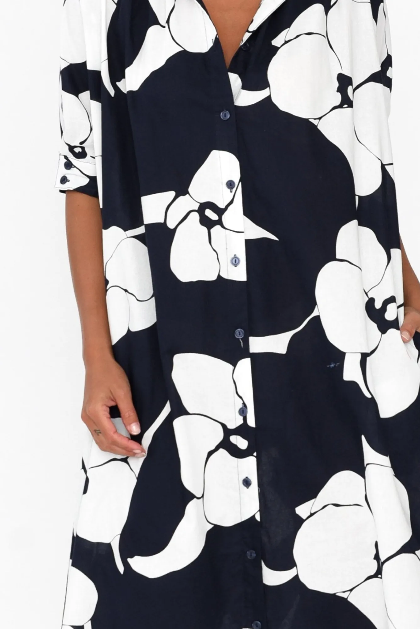 Fit: True To Size. Refer To Size & Fit Tab Below For Specific Size RecommendationNNfabric: 100% CottonNcrafted From Lightweight, Breathable And Non-Stretch Cotton With A Classic Smooth Woven Finish NNelegant Collared Neckline Leads To A Classic Button-Down Front NNhalf-Length Sleeves With An Elasticated Button Cuff To Create A Puff Look NNversatile Straight Shirt Dress SilhouetteNmatching Fabric Double D-Ring Belt Ntwo Hip Pockets Located In Side Seams NNstraight Hemline Falls To Midi Length NNNcare: Cool Gentle Hand Wash RecommendedNNcolour: Deep Navy With A Lush White Flower Print Overlay