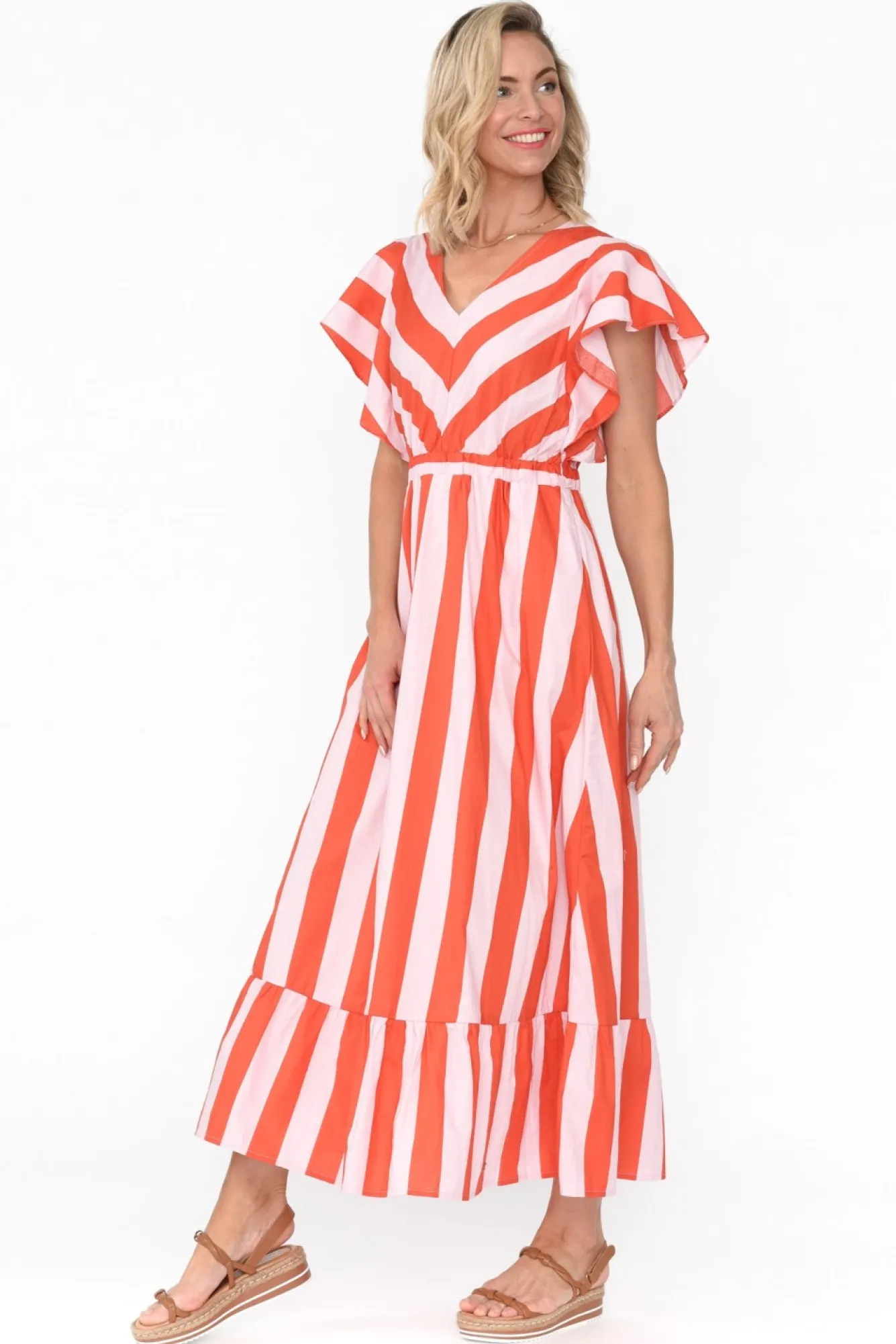 Fit: True To Size. Refer To Size & Fit Tab Below For Specific Size RecommendationNNfabric: 100% CottonNlightweight, Breathable And Non-Stretch Cotton With A Crisp Poplin FeelNNsharp V-Neckline Enhanced By Chevron Style Stripe Print NNkey Hole Detail At The Back With Three Button Closures Nsinglet Style Arm Opening With A Flutter Sleeve Overlay NNruched Elasticated WaistbandNoptional Fabric Belt With A Rectangular Buckle And Silver Eyelets Ntimeless A-Line Silhouette Featuring Two Hip PocketsNNfrill Hemline Falls To A Maxi LengthNNcare: Cool Gentle Hand Wash RecommendedNNcolour: Musk Pink And Orange Stripe Print