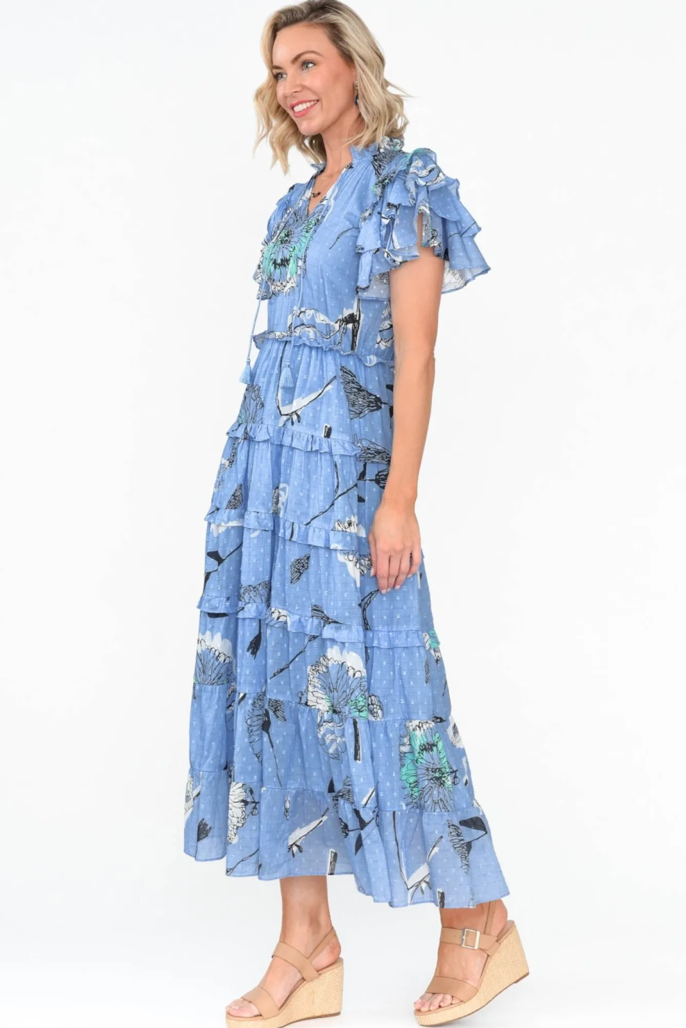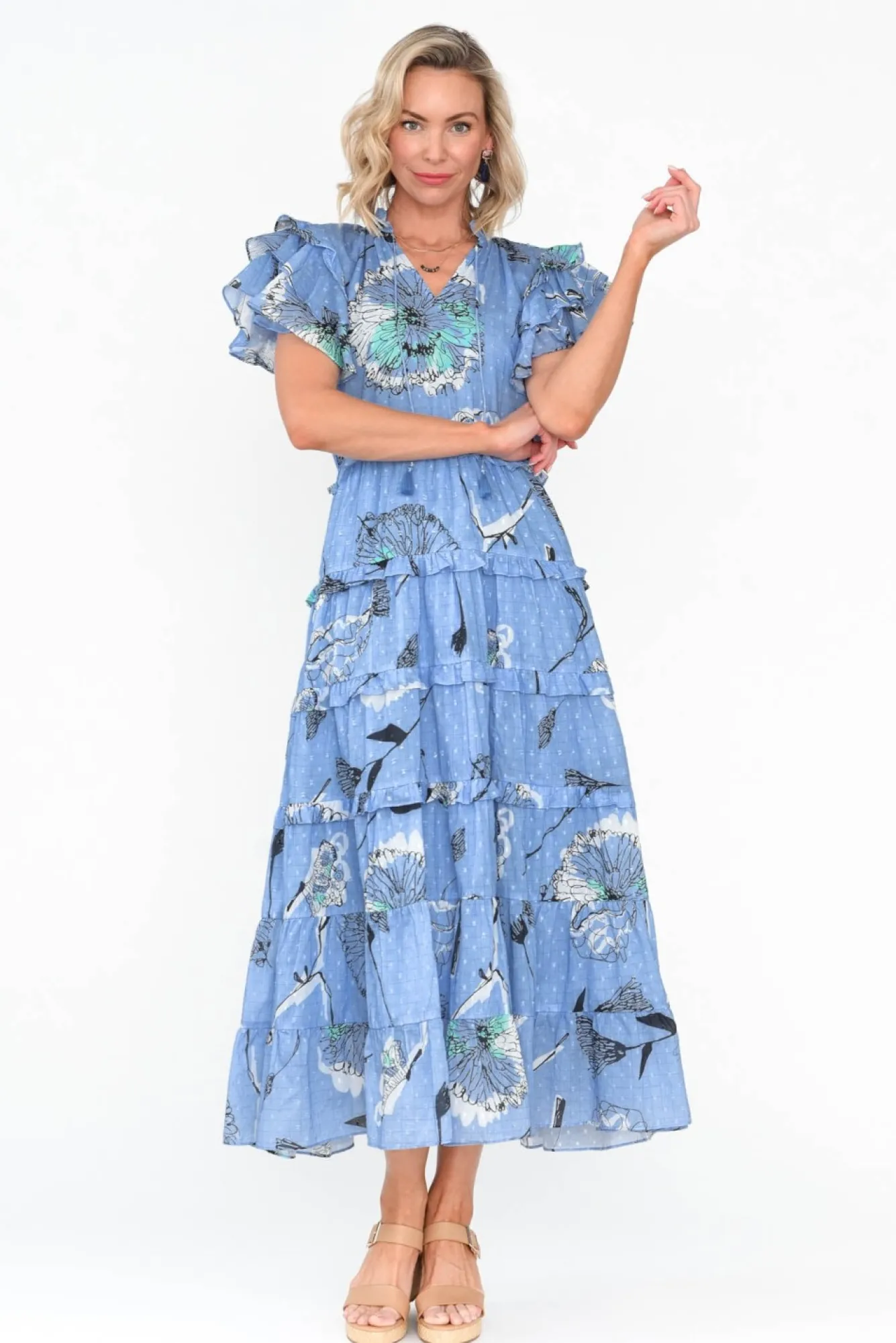 Fit: True To Size. Refer To Size & Fit Tab Below For Specific Size RecommendationNNfabric: 100% CottonNluxuriously Soft Cotton With An Ultra-Breathable, Lightweight Finish And A Raised Swiss Dot TextureNNsleeveless, Full-Length Lining For Ultimate Coverage Nfrill Neckline With A V-Split And Tassel TieNNshort, Triple-Layer Frill Sleeve Creates A Statement Look NNa-Line Silhouette With A Stretchy Waist Accentuates The Midline Without Sacrificing ComfortNtiered Skirt With Soft Pleating DetailsNtimeless Midi Length NNNcare: Cool Gentle Hand Wash RecommendedNNcolour: Baby Blue Base With A Dainty Floral Overlay NNfit Tip: Fabric Is Non-Stretch. We Recommend Checking The Bust Measurements Sizing Up If You Have A Larger Bust.