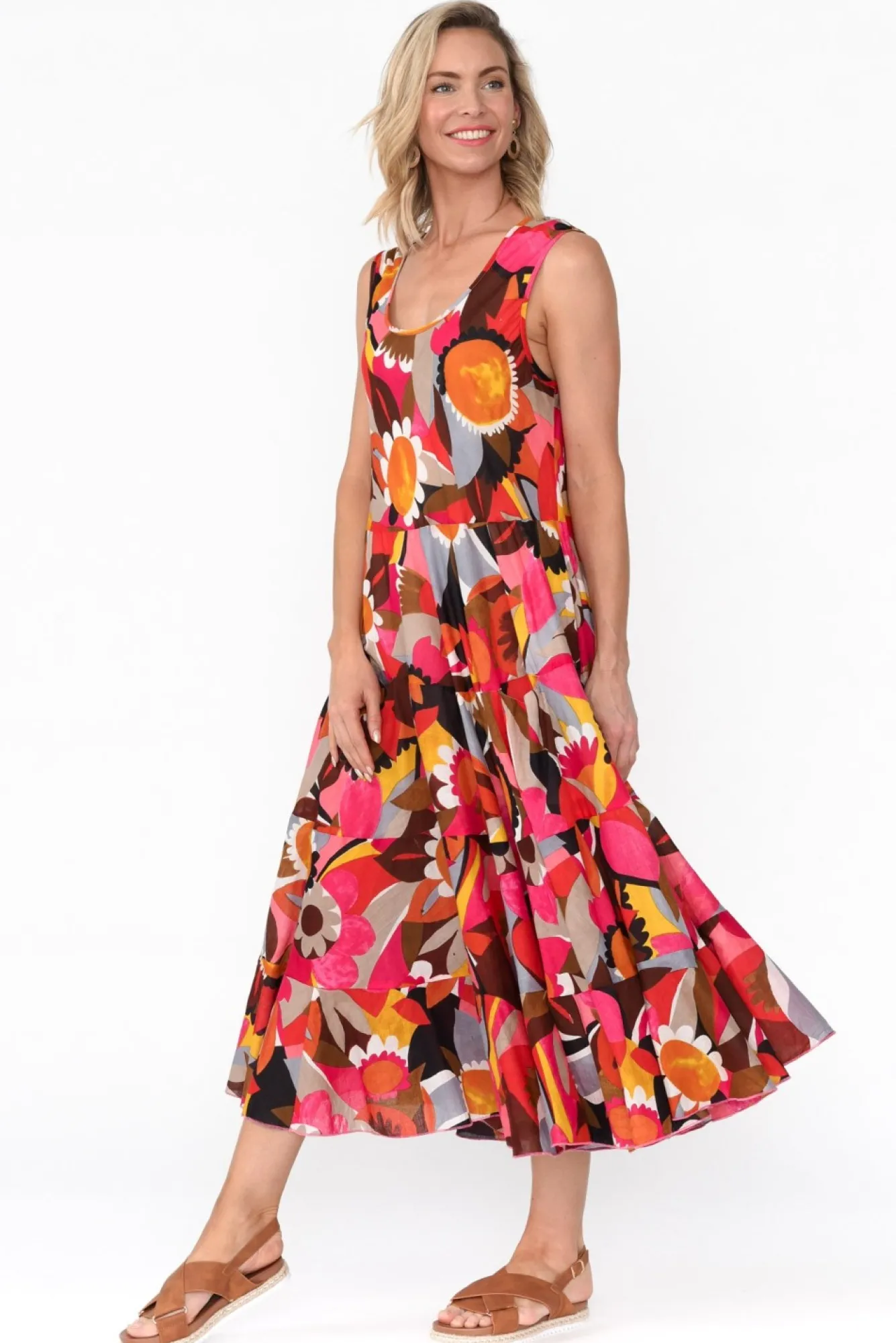 Fit: True To Size. Refer To Size & Fit Tab Below For Specific Size RecommendationNNfabric: 100% CottonNa Lightweight Cotton Dress Designed To Keep You Cool While Looking Stylish During The Warmer WeatherNlightweight, Soft And Breathable Non Stretch Cotton With Half Length White Lining For Peace Of Mind Nround Neckline And Sleeveless DesignNtwo Front PocketsNtiered Stitching On Hem Creating A Ruffle Hem LookNfeminine A-Line Swing Silhouette Nmidi-LengthNNcare: Cool Gentle Machine Wash RecommendedNNcolour: Abstract Pattern Featuring Orange, Pink And Brown Hues