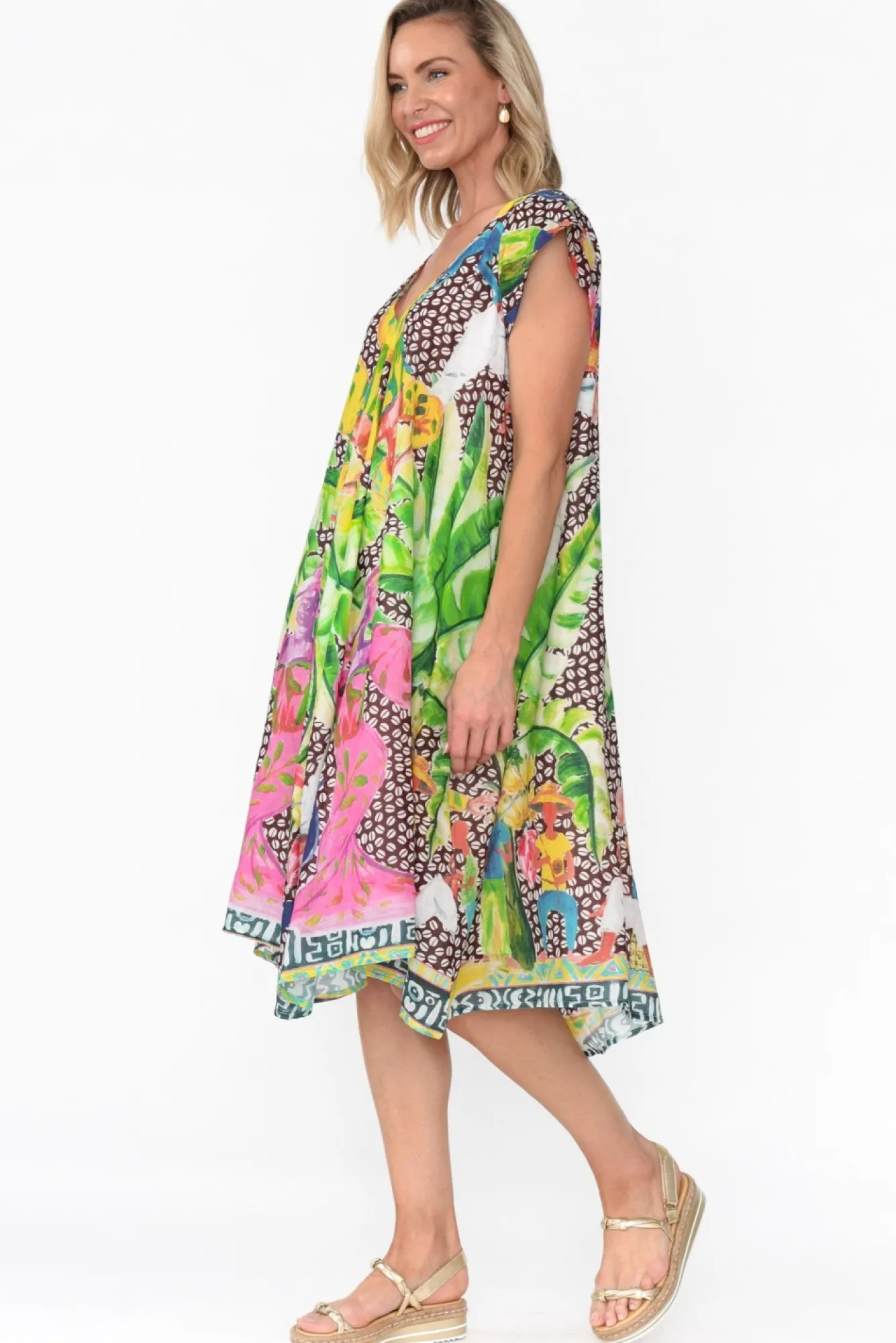 Fit: True To Size. Refer To Size & Fit Tab Below For Specific Size RecommendationNNfabric: 100% CottonNversatile Summer Dress Crafted In Ultra-Lightweight Cotton Offering Soft, Non-Stretch Qualities Nfully Lined For Added Coverage Nsharp V Neckline Complements Short Cap SleevesNcentre Seam Detail NNtwo Side PocketsNfeminine A-Line Silhouette Falls To A Below-Knee LengthNNcare: Cool Gentle Hand Wash RecommendedNNcolour: Multicolour Tropical Pattern