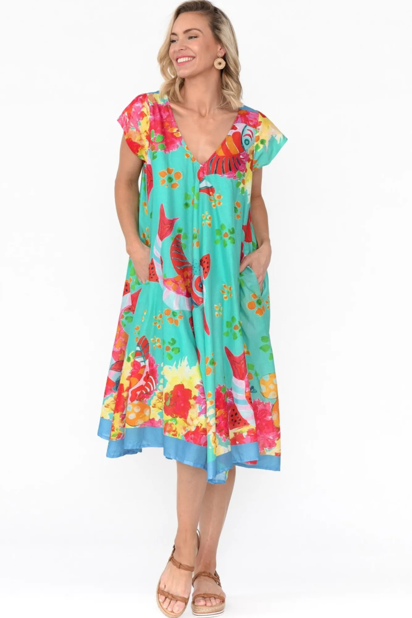Fit: True To Size. Refer To Size & Fit Tab Below For Specific Size RecommendationNNfabric: 100% CottonNversatile Summer Dress Crafted In Ultra-Lightweight Cotton Offering Soft, Non-Stretch Qualities Nfully Lined For Added Coverage Nsharp V Neckline Complements Short Cap SleevesNa Line Silhouette With Centre Seam DetailNtwo Side PocketsNfalls To A Below-Knee LengthNNcare: Cool Gentle Hand Wash RecommendedNNcolour: Teal Base With A Multicolour Sea Overlay Featuring Fish And Coral