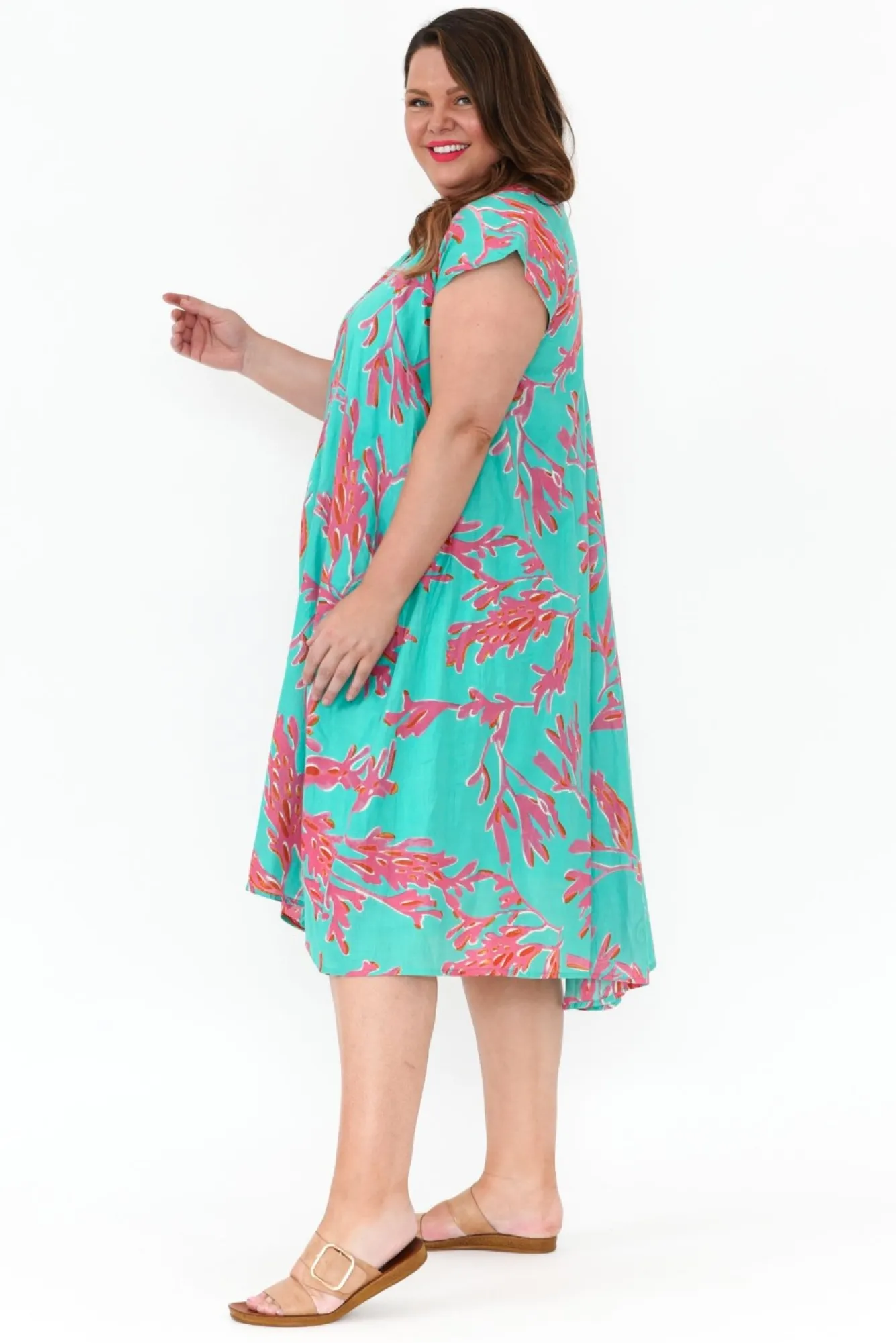 Fit: True To Size. Refer To Size & Fit Tab Below For Specific Size Recommendation NNfabric: 100% CottonNthis Dress Is Perfect For Adding Fresh Summer Tones To Your Wardrobe And It Can Be Worn To Your Next Ladies Day Out Or When You Have A Busy Day Ahead!Nsuper Light And Soft Non-Stretch CottonNfully LinedNsharp V Neckline And Short Cap SleevesNa Line Silhouette With Center Seam DetailNtwo Side PocketsNfalls To A Below Knee Length NNcare: Cool Gentle Hand Wash RecommendedNNcolour: Turquoise With A Unique Pink Coral Design