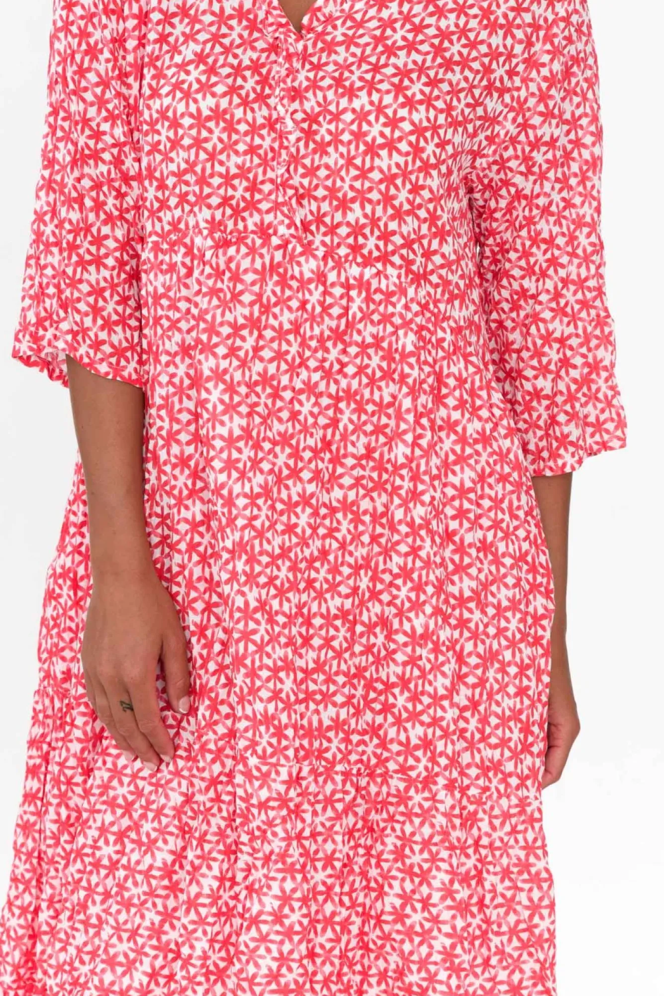 Fit: True To Size. Refer To Size & Fit Tab Below For Specific Size RecommendationNNfabric: Outer: 100% Cotton Lining: 100% CottonNlightweight, No-Iron Crinkle Cotton Fabric Offering Wonderful Breathability And Non-Stretch FeelNNlined From Under Bust Seam For Coverage Nsoft V-Neckline Defined By Frill Trim Detail NN3/4 Length Sleeves Finish Just Below The Elbow Nversatile Tiered A-Line Silhouette With Two Discreet Hip Pockets Nfalls To Midi LengthNNNcare: Cool Gentle Hand Wash RecommendedNNcolour: Clustered Red Flower Print Over A White Base NNfabric Tip: Store It Rolled Up Either In The Wardrobe Or In Your Suitcase To Keep The Crinkle Alive!