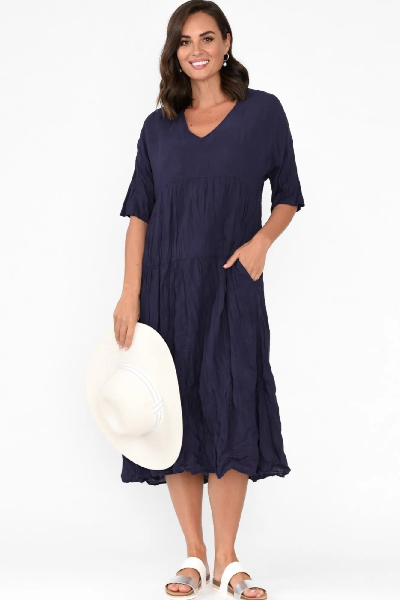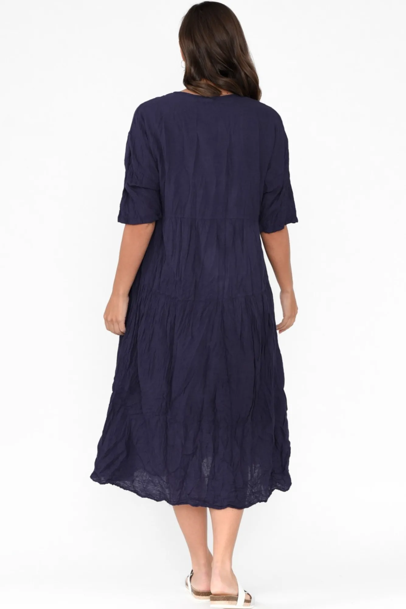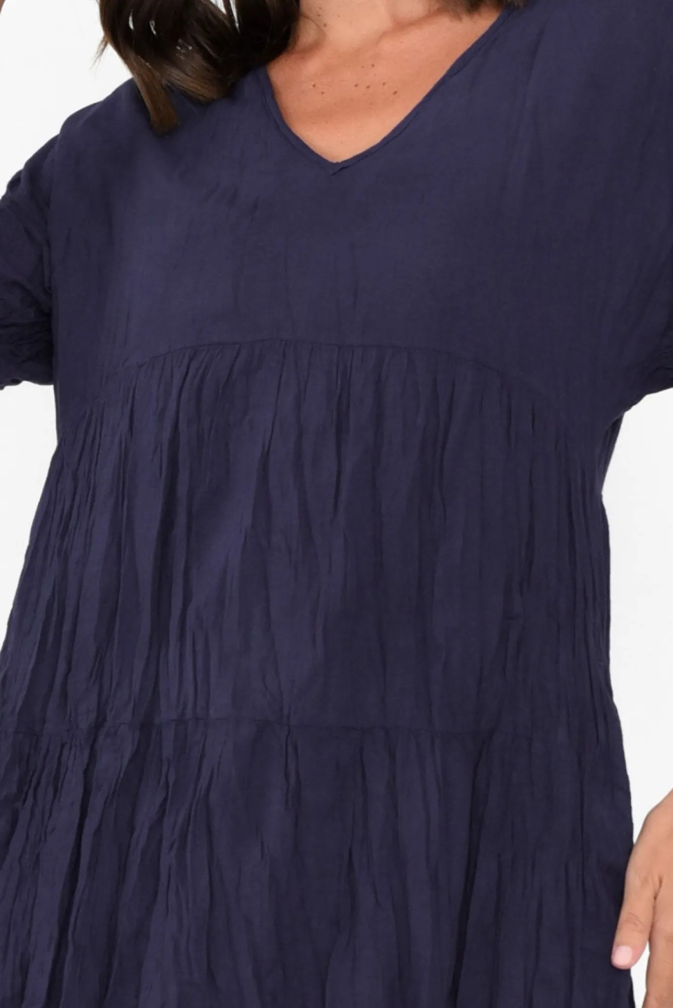 Fit: True To Size – Oversized Fit. Refer To Size & Fit Tab Below For Specific Size RecommendationNNfabric: Outer:100% Cotton Lining: 100% CottonNlovely Soft And Breathable Cotton Fabric With An Easy-To-Wear Crinkle Texture NNnon-Stretch Lining From Shoulder To Mid-Thigh For Ultimate Coverage NNsharp V-Neckline Highlights Collarbones Nstraight Sleeves Fall To An Elbow Length NNfloating Tiered Design Creates A Lovely A-Line Silhouette NNstunning Panel Stitching Across Bust And WaistNstraight Hemline Falls To A Midi LengthNNcare: Cool Gentle Hand Wash RecommendedNNcolour: True NavyNNfabric Tip: Store It Rolled Up Either In The Wardrobe Or In Your Suitcase To Keep The Crinkle Alive!