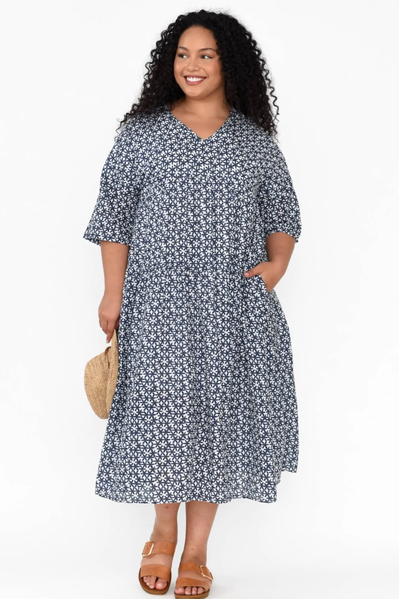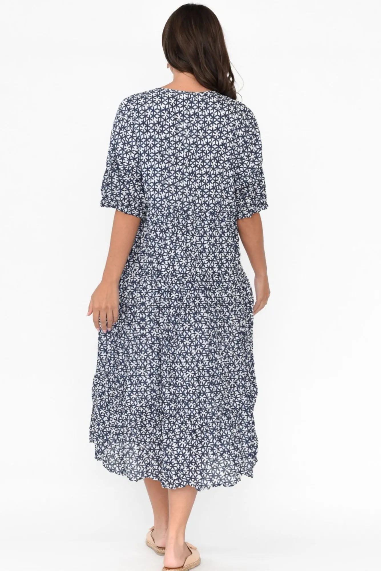Fit: True To Size – Oversized Fit. Refer To Size & Fit Tab Below For Specific Size RecommendationNNfabric: 100% Cotton Nsoft And Breathable Crinkle Cotton Fabric, Perfect For Keeping You Cool During The Warmer Months NNnon-Stretch Lining From Shoulder To Mid-Thigh NNsharp V-Neckline Highlights The Collarbones NN3/4 Length Sleeves Fall Below The ElbowNNversatile Tiered A-Line Silhouette NNtwo Discreet Hip PocketsNNfalls To An Easy-To-Wear Midi LengthNNNcare: Cool Gentle Hand Wash RecommendedNNcolour: Delicate Navy Flower Print Over A White BaseNNNfabric Tip: Store It Rolled Up Either In The Wardrobe Or In Your Suitcase To Keep The Crinkle Alive!