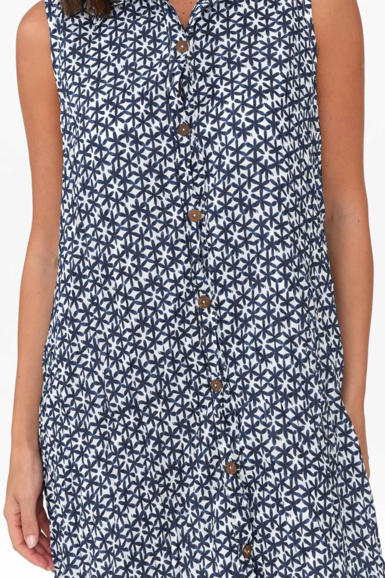 Fit: True To Size. Refer To Size & Fit Tab Below For Specific Size RecommendationNNfabric: 100% CottonNlovely Lightweight And Breathable Cotton Fabric With A Must-Have Crinkle TextureNcollared Neckline With Complementary Wooden Buttons From Neckline To HemNsleeveless Design And Full Shoulder Coverage NNsimple Shift Silhouette For Ultimate ComfortNNsewn-In Cotton Lining – No Need For An Additional SlipNfrilled Hem Falls Past The Knees NNNcare: Cool Gentle Hand Wash RecommendedNNcolour: White Base With A Navy Floral Print