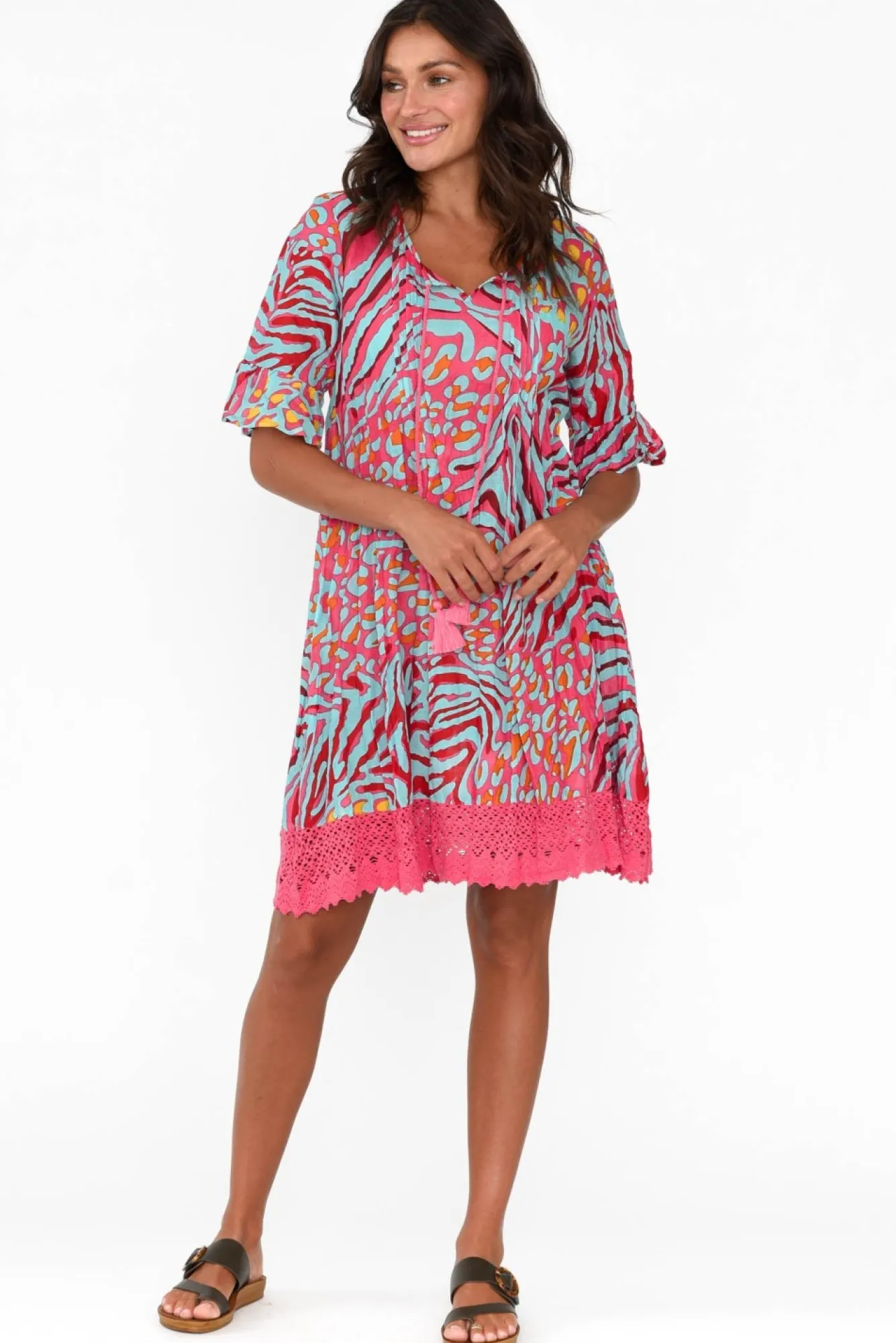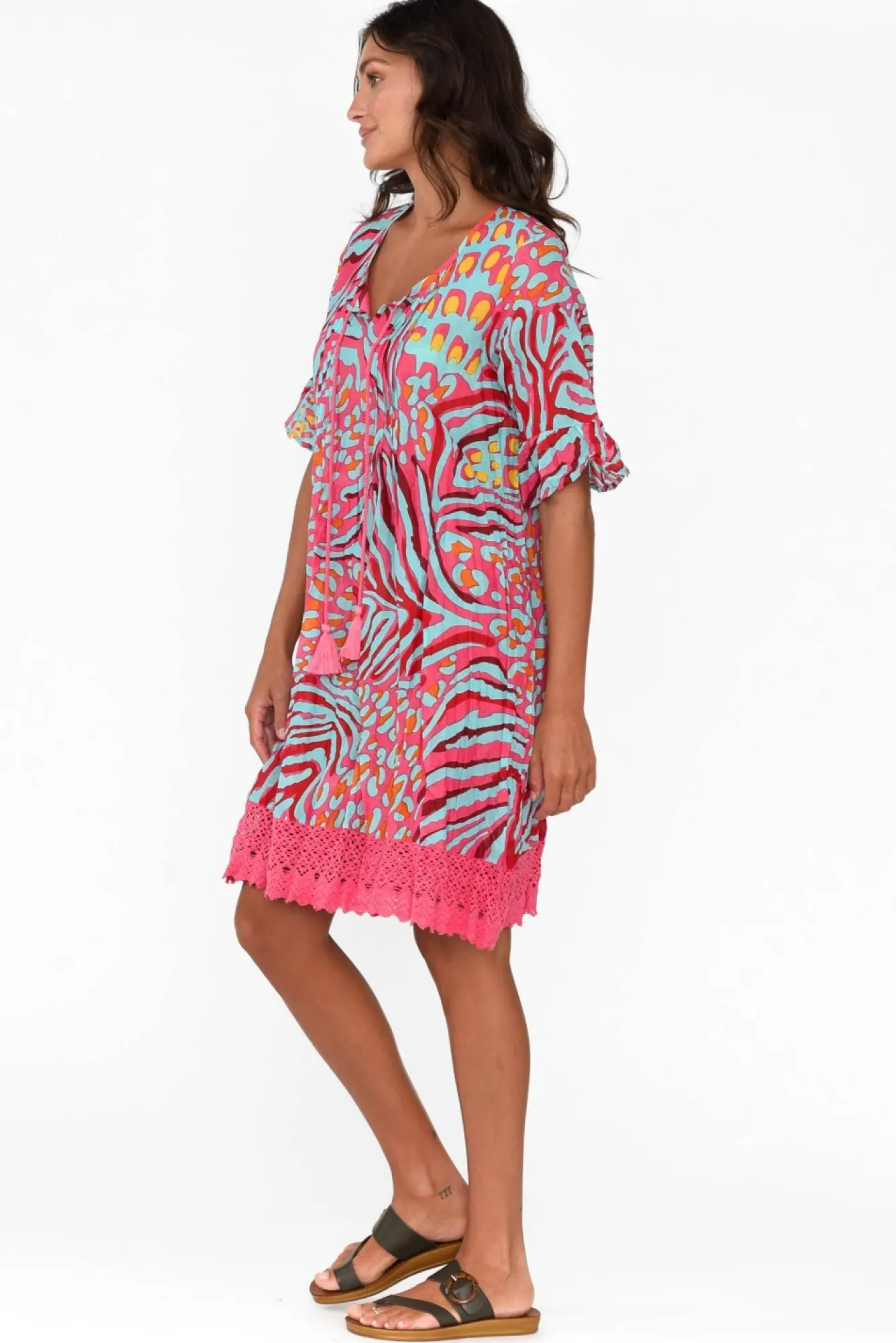 Fit: True To Size. Refer To Size & Fit Tab Below For Specific Size RecommendationNNfabric: 100% CottonNmade From Ultra-Lightweight, Breathable And Non-Stretch Crinkle Cotton FabricNstriking V-Neckline With Tassel Tie DetailNruffled Half-Length SleevesNNcomfortable And Flowing A-Line SilhouetteNstraight, Pink Crochet HemNhemline Falls To Above-Knee LengthNNcare: Cool Gentle Hand Wash RecommendedNNcolour: Pink Base With Aqua Animal PrintNNstyle Tip: We Recommend Pairing With Your Favourite Slip For Additional Coverage