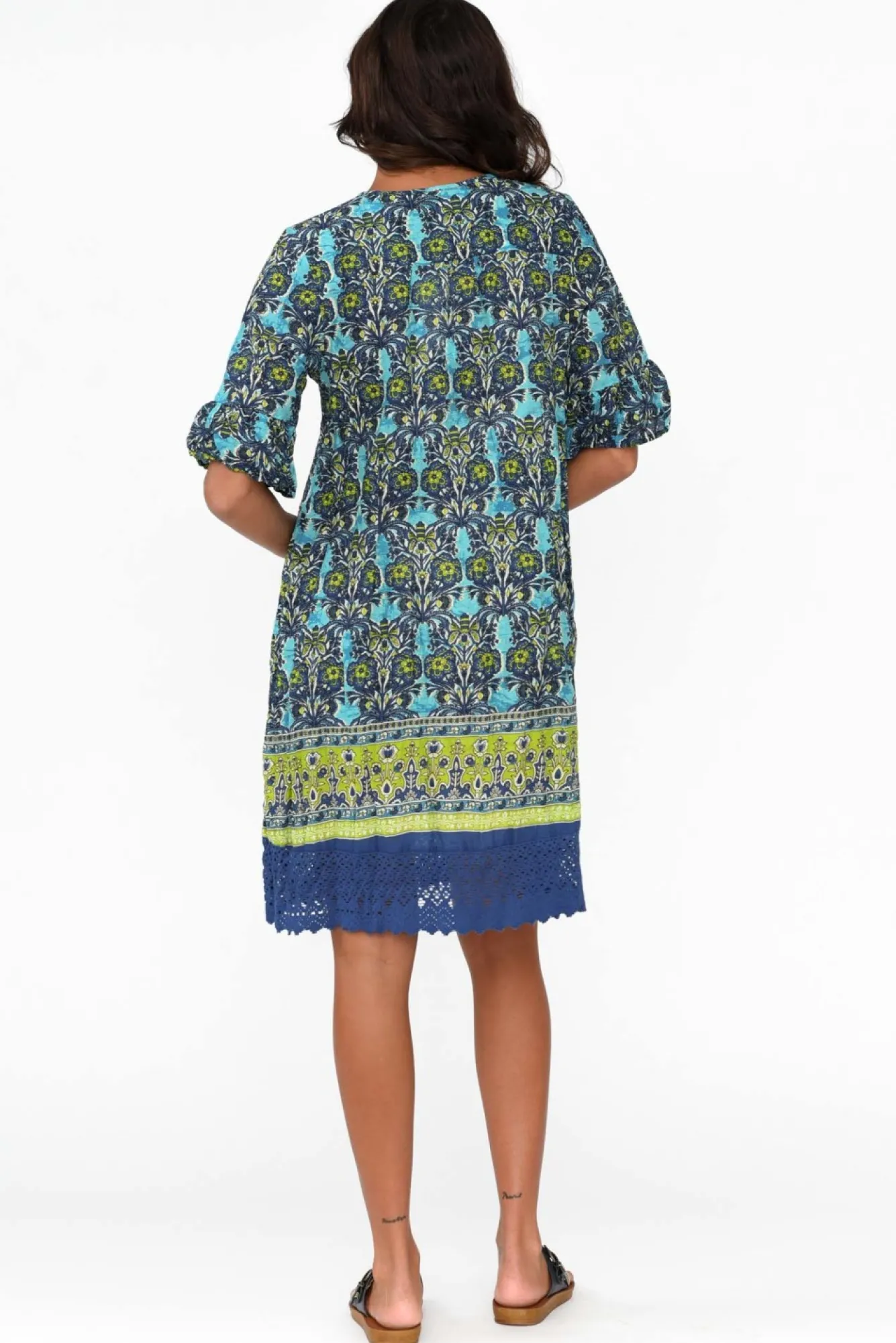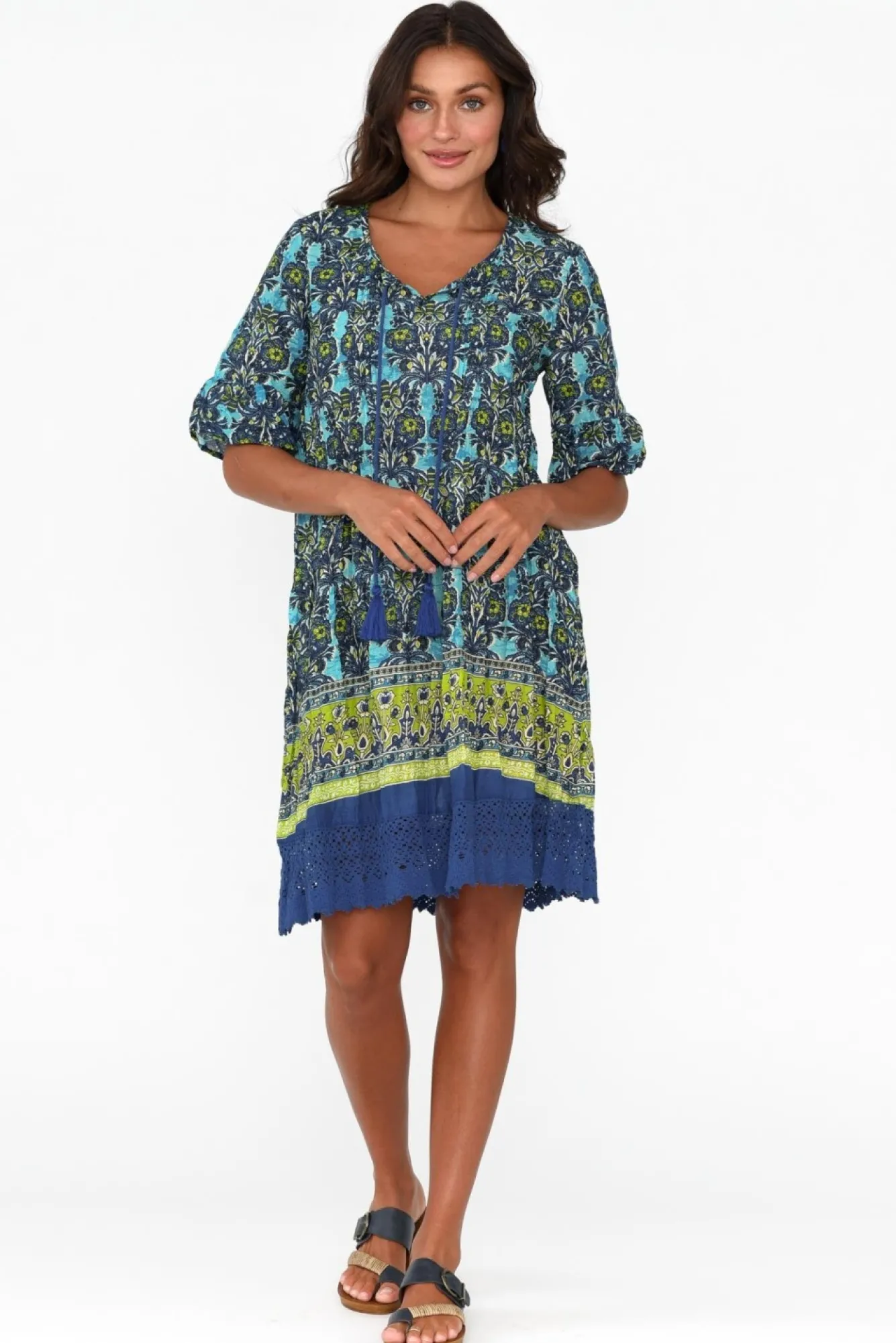 Fit: True To Size. Refer To Size & Fit Tab Below For Specific Size RecommendationNNfabric: 100% CottonNcrafted From A Light And Airy Crinkle Cotton Fabric, Perfect For Summer DaysNstriking V-Neckline With Tassel Tie DetailNruffled Half-Length SleevesNNcomfortable And Flowing A-Line SilhouetteNfun Crochet Trim In A Lovely Navy ShadeNhemline Falls To Above-Knee LengthNNcare: Cool Gentle Hand Wash RecommendedNNcolour: Beautiful Blue And Green Shades With An Abstract PrintNNstyle Tip: We Recommend Pairing With Your Favourite Slip For Additional Coverage