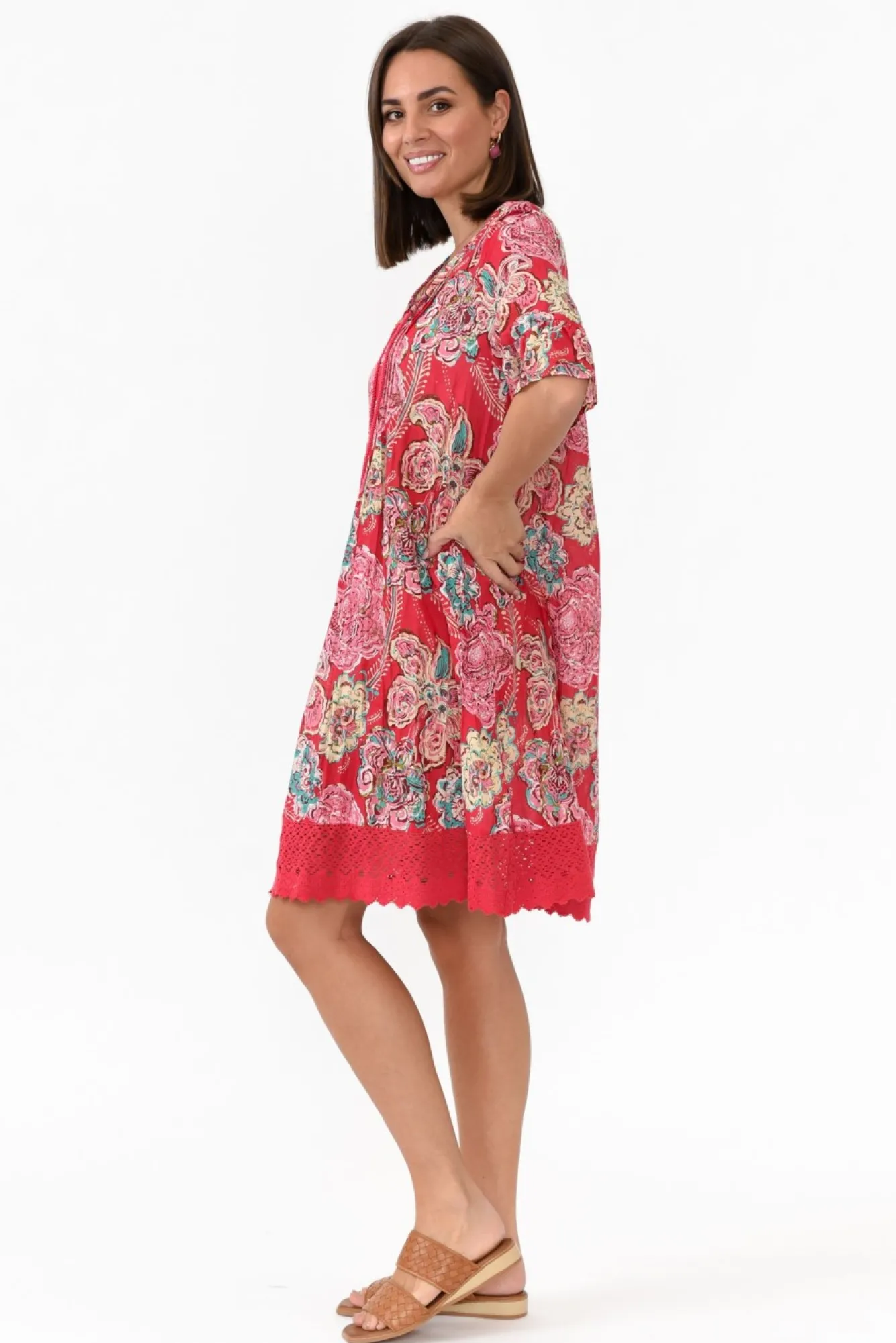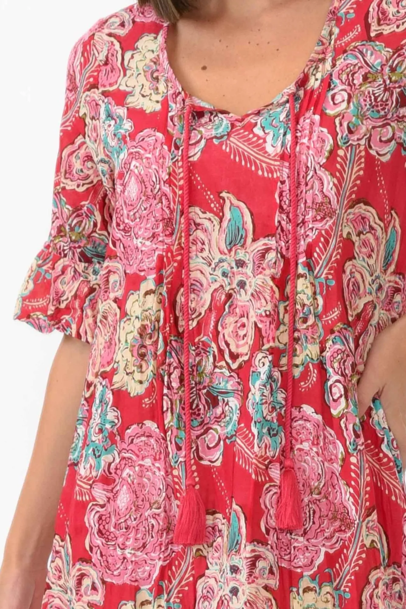 Fit: True To Size. Refer To Size & Fit Tab Below For Specific Size RecommendationNNfabric: 100% CottonNwonderfully Lightweight Tunic Dress Made From Breathable And Non-Stretch Crinkle Cotton FabricNstriking V-Neckline With Tassel Tie DetailNruffled Half-Length SleevesNNcomfortable And Flowing A-Line SilhouetteNstraight, Red Crochet HemNhemline Falls To Above-Knee LengthNNcare: Cool Gentle Hand Wash RecommendedNNcolour: Coral Red Base Under A Stunning Floral Overlay Of Pink And Teal NNfabric Tip: Store It Rolled Up Either In The Wardrobe Or In Your Suitcase To Keep The Crinkle AliveNNstyle Tip: We Recommend Pairing With Your Favourite Slip For Additional Coverage