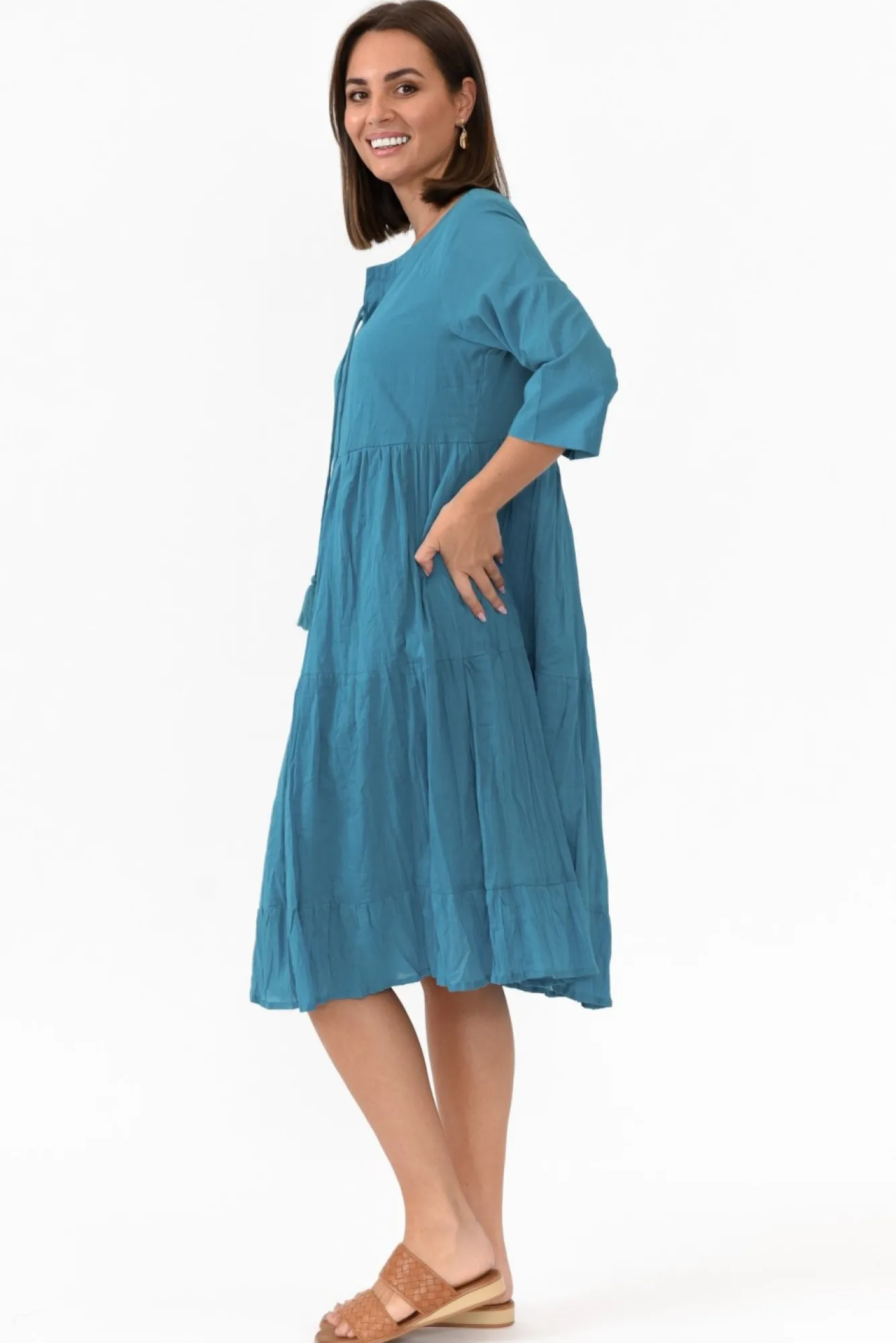 Fit: True. Refer To Size & Fit Tab Below For Specific Size RecommendationNNfabric: 100% CottonNbreathable, Lightweight And Non-Stretch Cotton In A Customer-Favourite Crinkle Finish – No Ironing Needed!NNround Neckline With A V-Split And Lovely Tassel TiesNNsimple, Straight 3/4 Length SleevesNtiered Flowy Skirt Falls From The Underbust SeamNNfully Lined Style For Added CoverageNcomfortable Knee-LengthNNcare: Cool Gentle Hand Wash RecommendedNNcolour: Bright Ocean BlueNNfabric Tip: Twist The Garment, Fold In Half And Secure With A Rubber Band To Store After Washing And Drying To Keep The Crinkle Alive