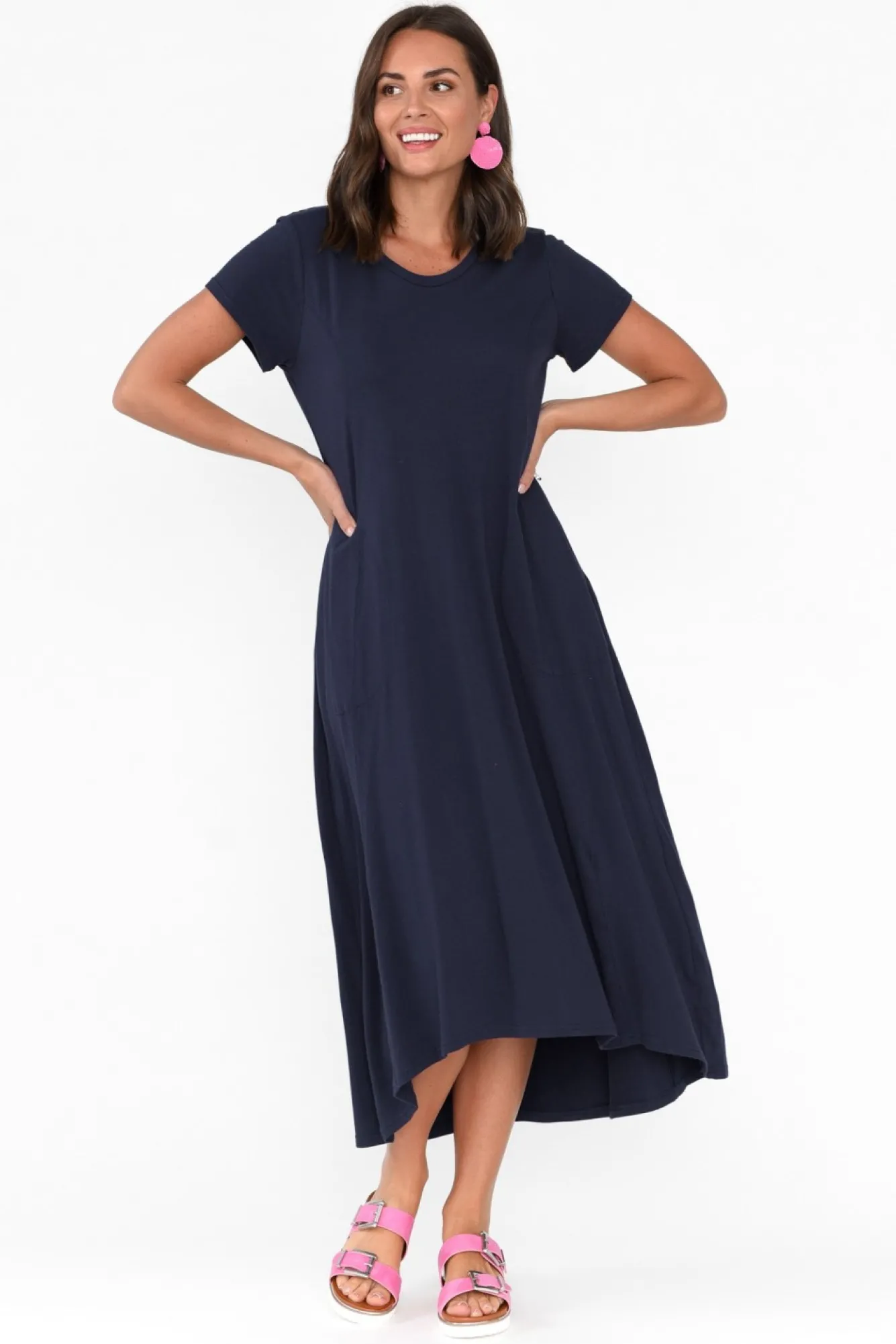 Fit: True To Size. Refer To Size & Fit Tab Below For Specific Size RecommendationNNfabric: Cotton/ElastaneNmade From A Lightweight And Stretchy Cotton Blend Fabric With A Soft Hand FeelNNeveryday Design Enhanced By A Round Neckline And Short Tee-Style SleevesNversatile A-Line Silhouette Elevated With Curved Gather Detail At The Back And Feature Stitching From Bust To BaseNNtwo Hip Pockets Defined By Exposed Stitching Detail NNhi-Lo Hemline Falls To Midi Length NNNcare: Cool Gentle Machine Wash RecommendedNNcolour: Deep Oceanic Navy Hue