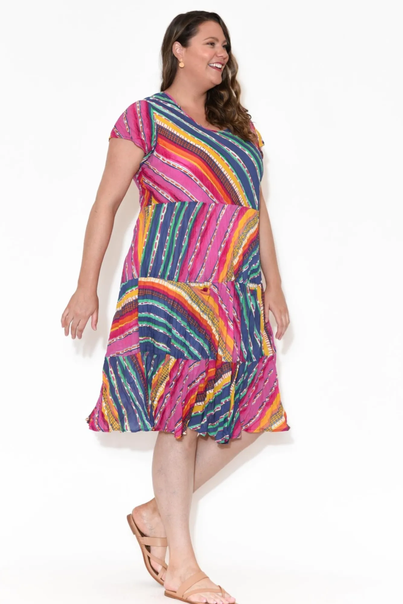 Fit: True To Size. Refer To Size & Fit Tab Below For Specific Size Recommendation NNfabric: 100% Organic CottonNa Comfortable And Breathable Cotton Garment With Textured Crinkle Finish Ndesigned With A Full Length Fixed Lining For Added Coverage And ComfortNfeaturing A Classic Round Neckline And Short SleevesNflowy, A-Line Silhouette Accentuated By Tiered Design From Waist To BaseNNtwo Internal Slip Pockets Located At The Torso NNstraight Hemline Falls To The KneeNNNcare: Cool Gentle Hand Wash RecommendedNNcolour: Berry Pink Base With Hints Of Green, Blue And Yellow In Abstract Stripe