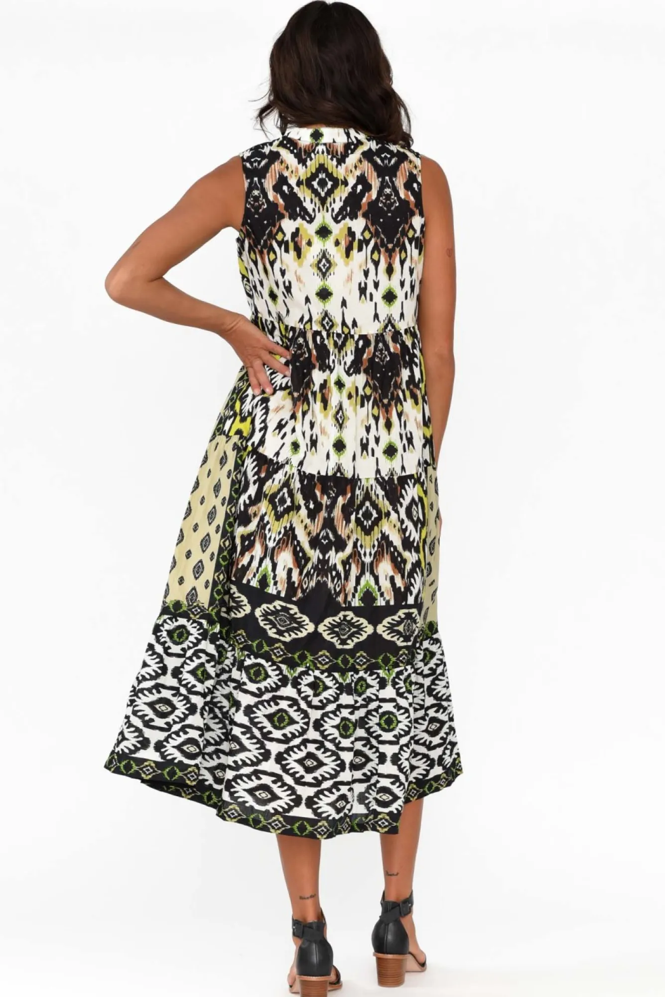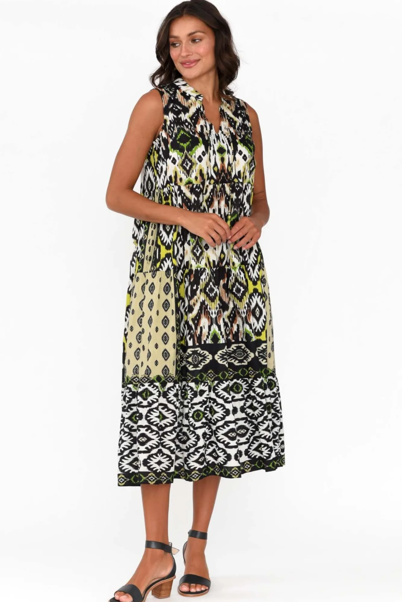 Fit: True To Size. Refer To Size & Fit Tab Below For Specific Size RecommendationNNfabric: 100% Cotton Ncrafted From Organic Cotton With Lightweight, Breathable Qualities And A Crinkle Finish Nround Banded Neckline With A V-Split And Tassel Tie Detail NNsummery Sleeveless Design NNa-Line Silhouette With Pleated Tiers Creates A Feminine LookNNtwo Practical Hip PocketsNNstraight Hem Falls To A Below Knee LengthNNNcare: Cool Gentle Hand Wash RecommendedNNcolour: Collage Of Black And White Geometric-Style Print With Hints Of GreenNNfabric Tip: Store It Rolled Up Either In The Wardrobe Or In Your Suitcase To Keep The Crinkle Alive!