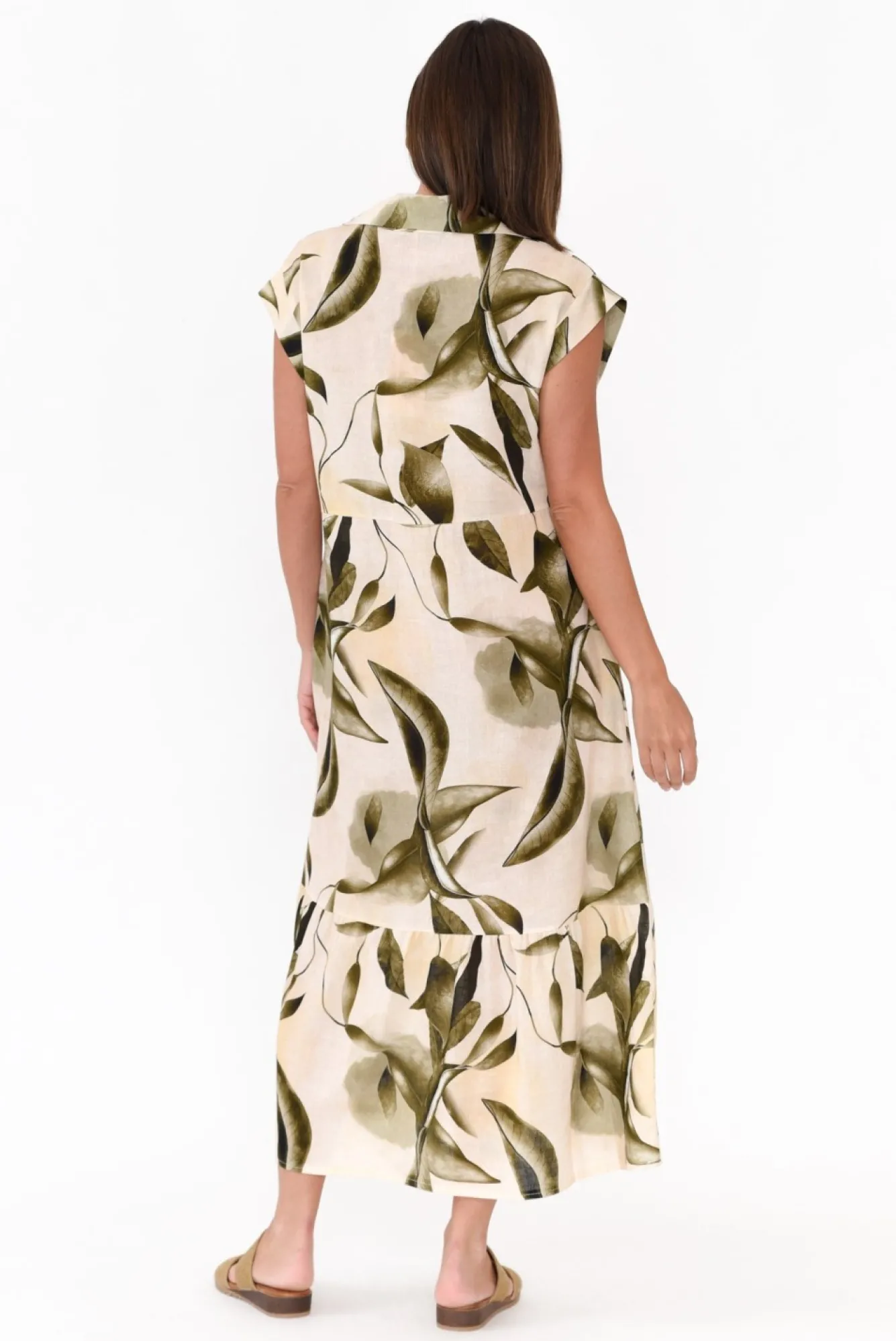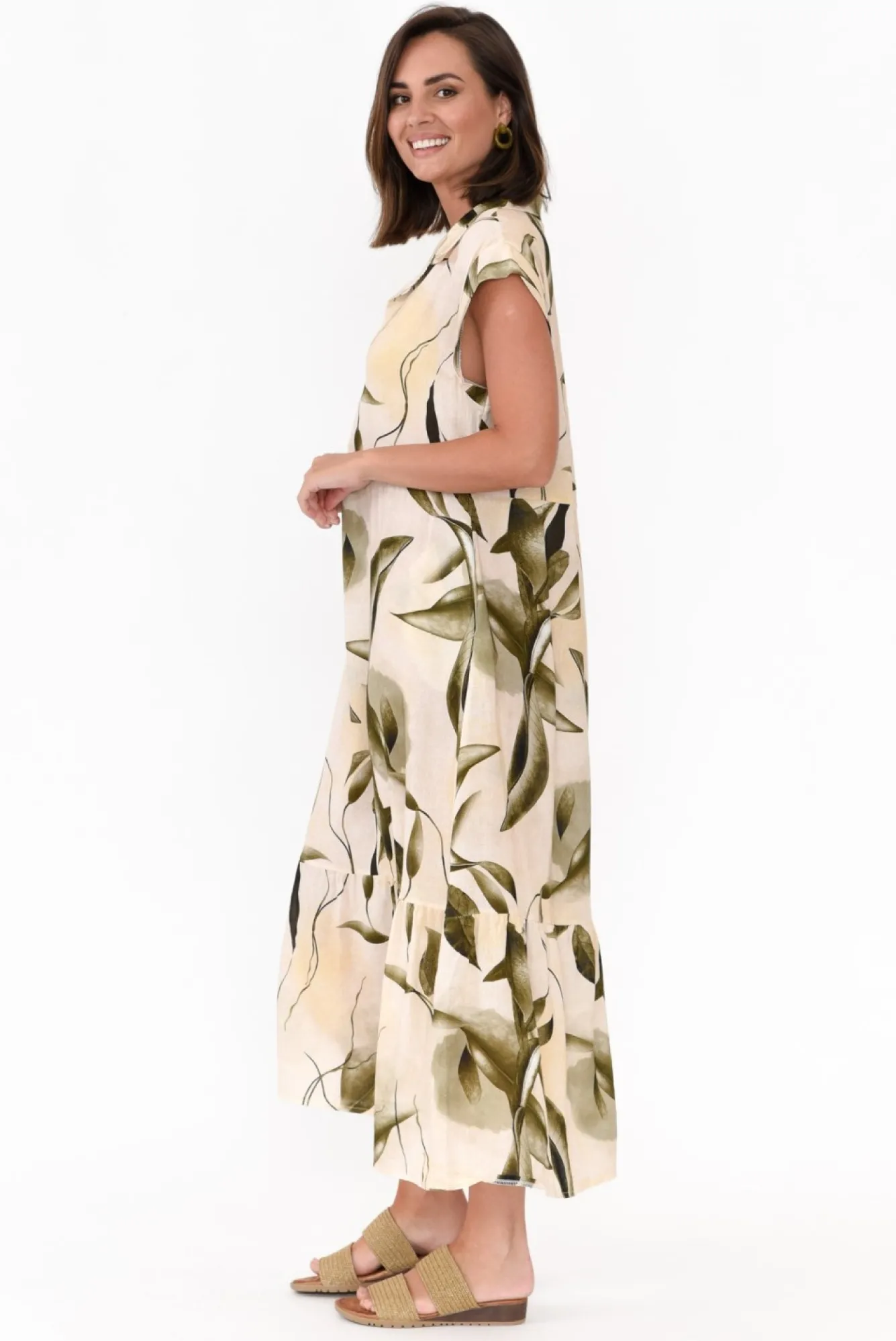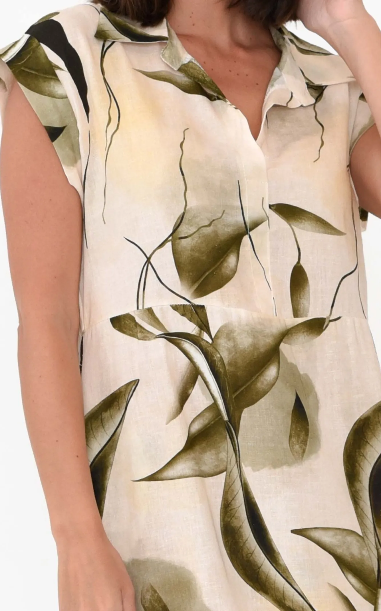 Fit: True To Size. Refer To Size & Fit Tab Below For Specific Size Recommendation NNfabric: 50% Linen 50% CottonNa Fun And Fabulous Summer Dress Crafted In Italy From Midweight, Breathable And Non-Stretch Fabric With A Lovely Textured Hand FeelNNelegant Open-Collar Neckline NNclassic Short Cap Sleeves NNflattering A-Line Silhouette With Subtle Tier DetailNNtwo Discreet Hip Pockets Nstraight Hemline Falls To Midi LengthNNNcare: Cool Gentle Hand Wash RecommendedNNcolour: Cream Base With Stunning Green Leaf PrintNNnote: Belt Is Not Included With The Dress, Shop Our Selection Of Belts Here!