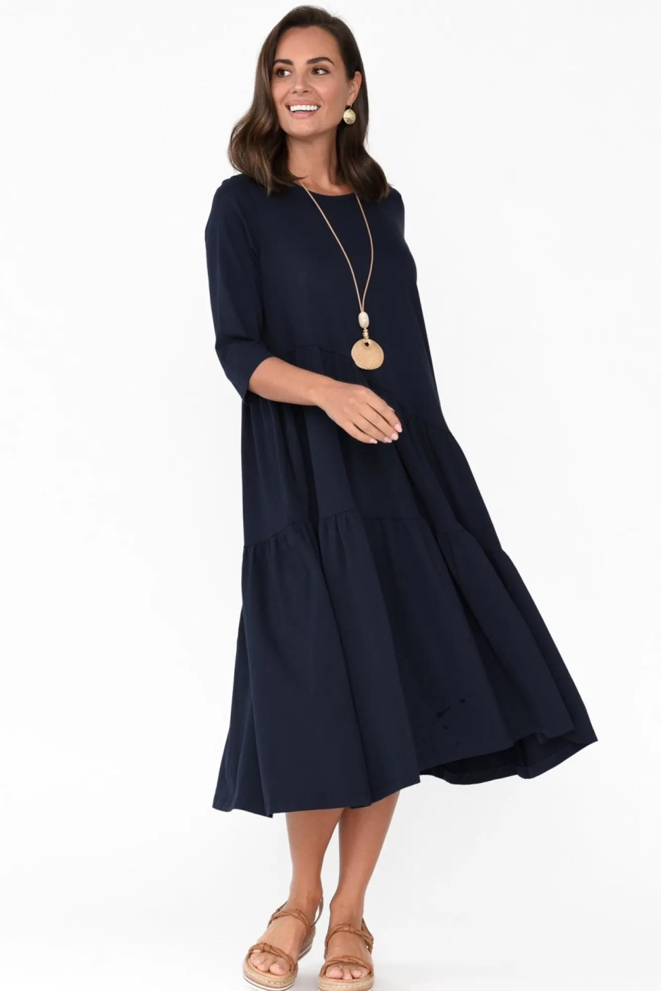 Fit: True To Size. Refer To Size & Fit Tab Below For Specific Size RecommendationNNfabric: 95% Cotton, 5% Elastane Nultra-Stretchy Cotton Blend With A Lightweight, Breathable Feel Nclassic Rounded NecklineNNthree-Quarter Fitted Sleeve NNflattering Tiered A-Line Silhouette Featuring A Diagonal Seam Detail Across The Waist NNtwo Discreet Hip PocketsNclassic Midi Length For A Sophisticated Look That Provides Coverage At The KneesNNNcare: Cool Gentle Machine Wash RecommendedNNcolour: Lovely Deep Navy Shade