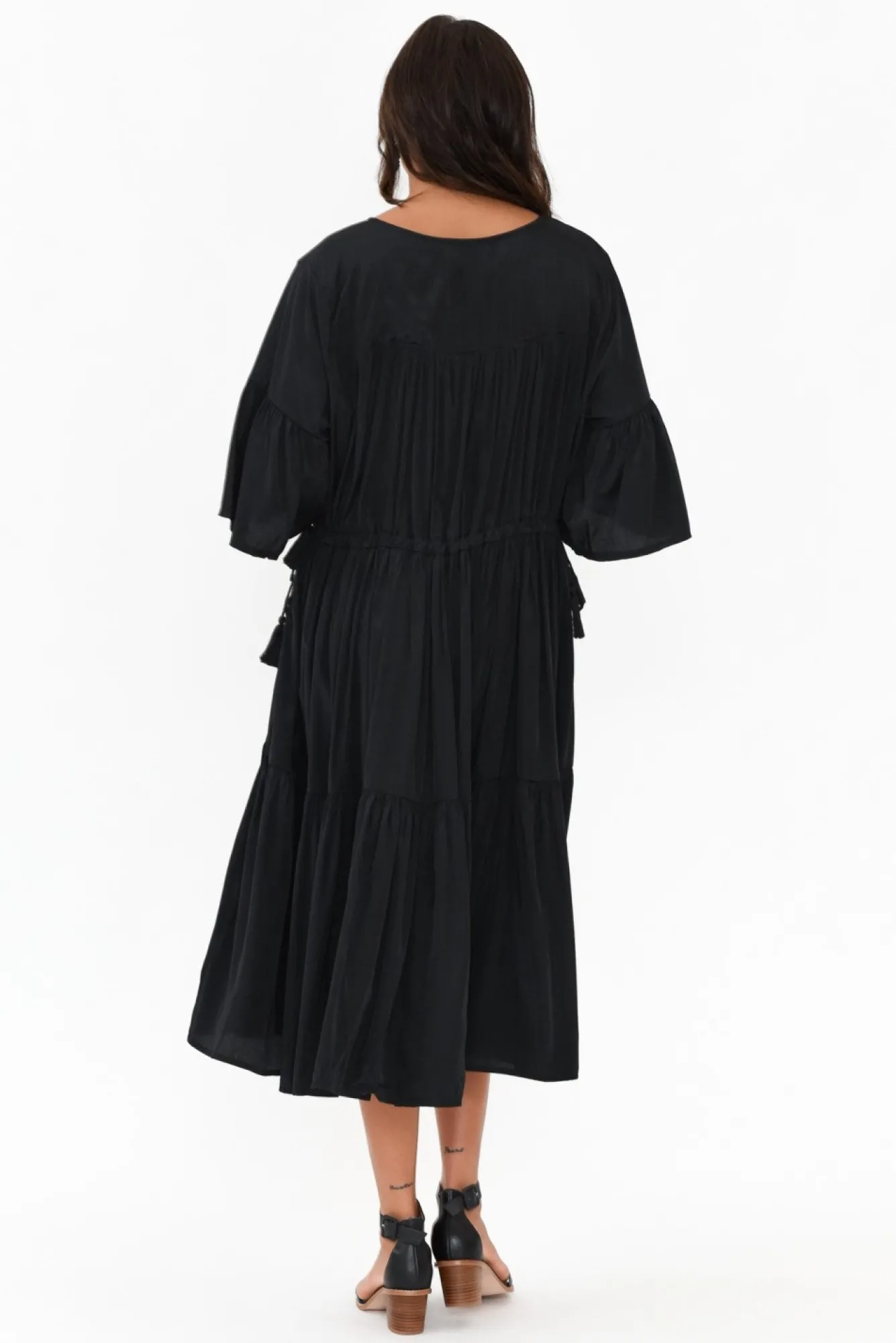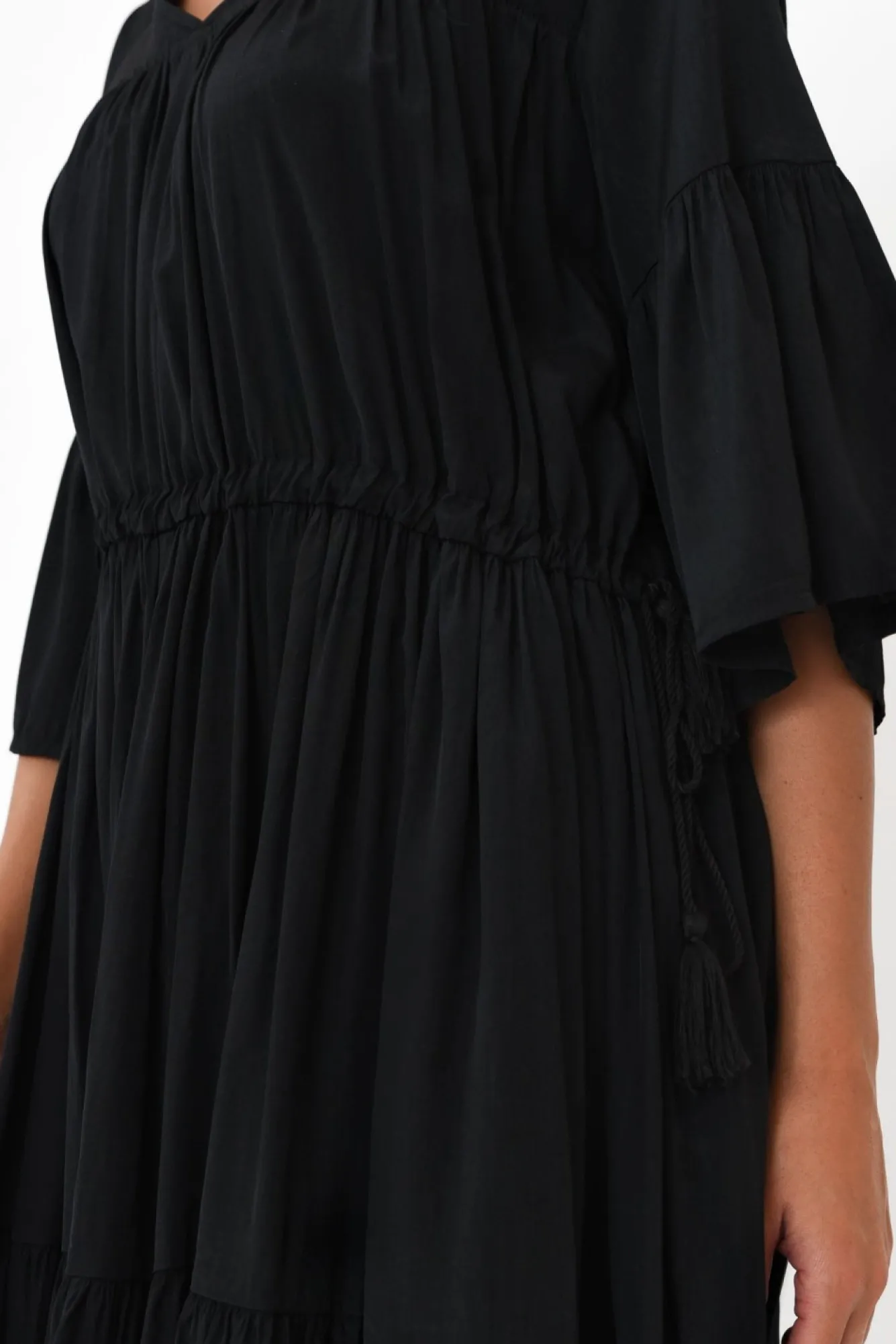 Fit: True. Refer To Size & Fit Tab Below For Specific Size Recommendation NNfabric: 65% Cotton, 35% Rayon Nconstructed From Lightweight, Non-Stretch Pleated Fabric With An Elevated Sheen NNsharp V-Neckline Complements The Statement Bell Sleeves NNrelaxed A-Line Silhouette Enhanced By Delicate TiersNadjustable Tie Waistband With Black Rope And Tassel DetailingNdrapes To Refined Midi Length NNNcare: Cool Gentle Hand Wash Recommended NNcolour: Midnight Black