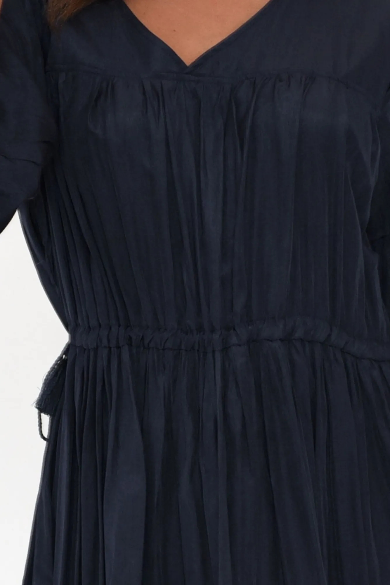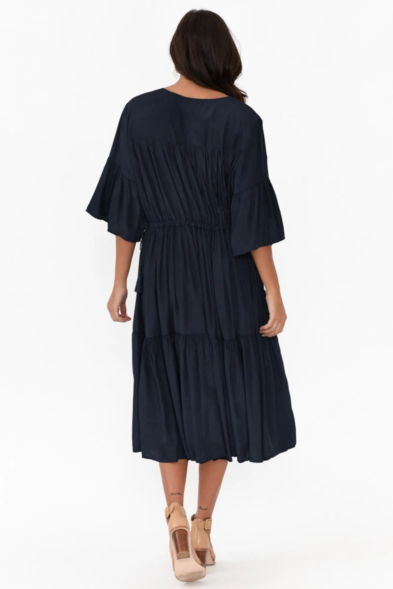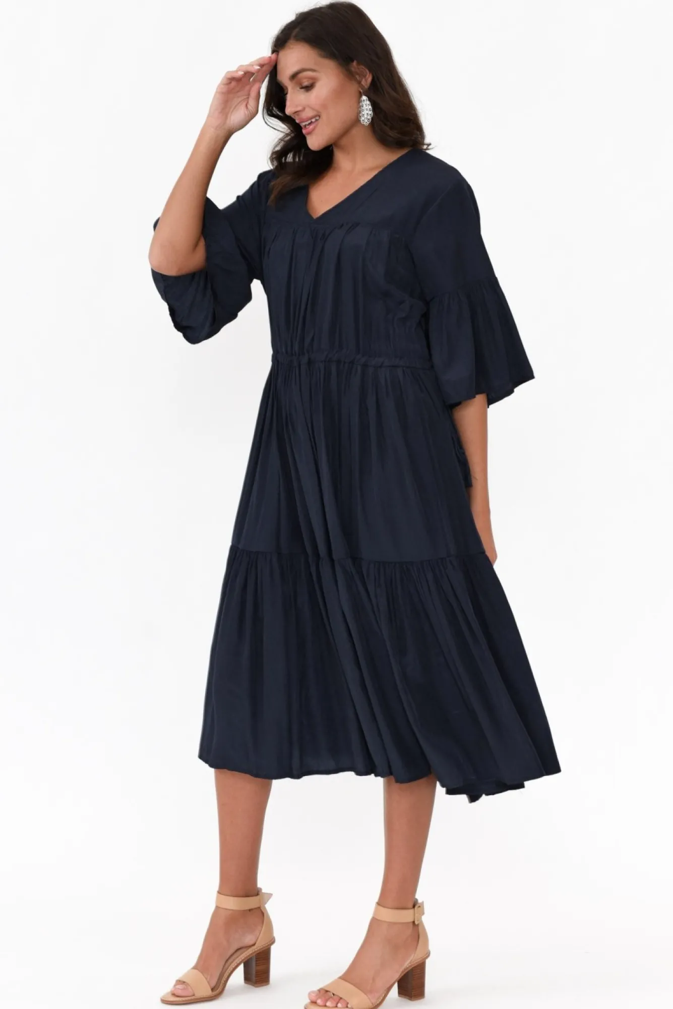 Fit: True To Size. Refer To Size & Fit Tab Below For Specific Size Recommendation NNfabric: 65% Cotton, 35% Rayon Ncrafted From Lightweight, Non-Stretch Fabric With A Smooth Hand Feel And An Elevated SheenNsharp V-Neckline Complements The Statement Bell Sleeves NNrelaxed Tiered A-Line Silhouette For A Timeless Look Nfeature Drawstring Waist With Tassel Rope DetailingNfalls To Stylish Midi LengthNNNcare: Cool Gentle Hand Wash Recommended NNcolour: Deep Oceanic Navy