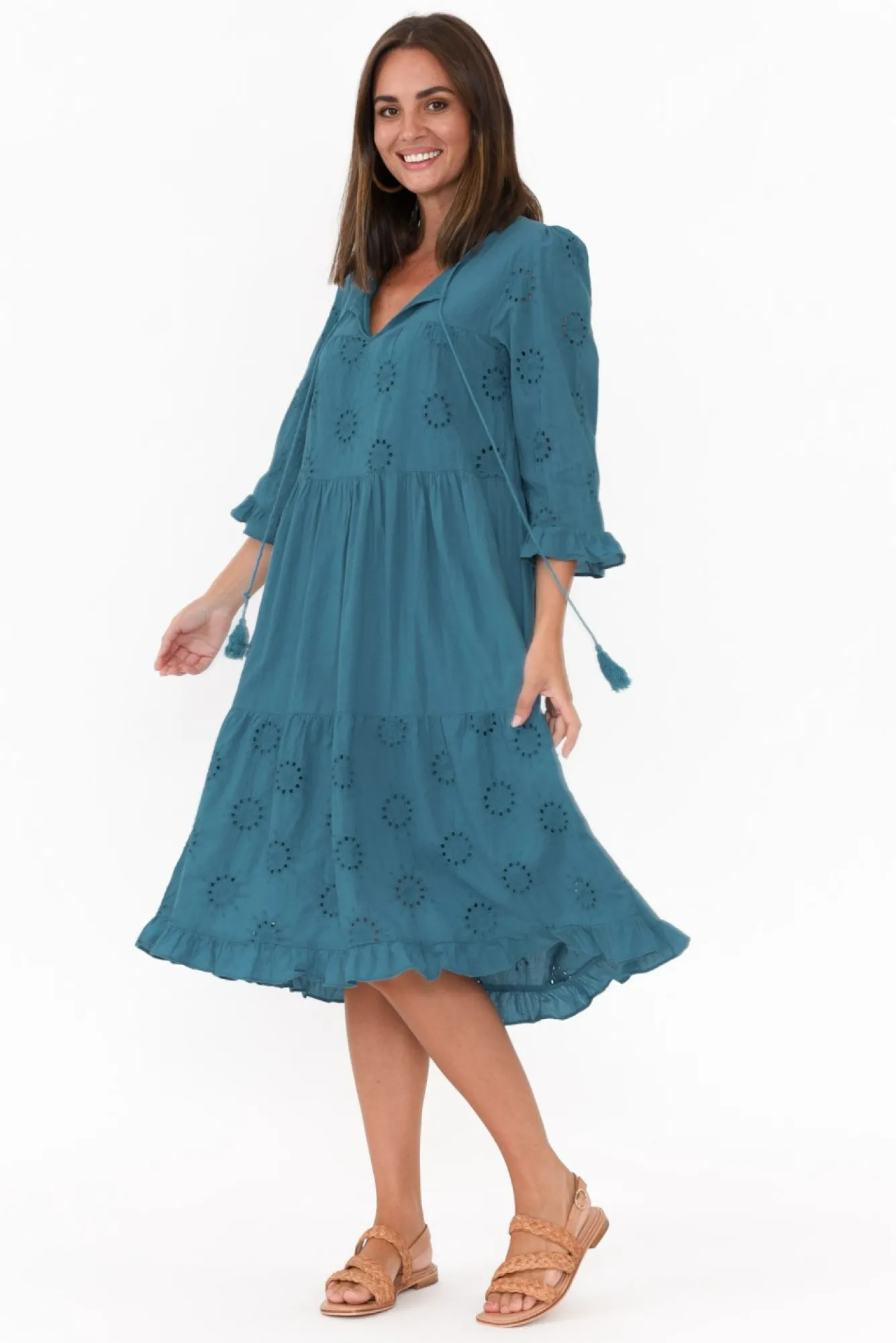 Fit: True To Size. Refer To Size & Fit Tab Below For Specific Size RecommendationNNfabric: 100% Cotton Nlightweight, Breathable And Non-Stretch Cotton Overlay With A Soft Non-Stretch Lining Nv-Split Neckline With Fun Tassel Tie NNstatement 3/4 Length Sleeves With Frill Cuff Detail NNversatile Tiered A-Line Silhouette With Elevated Anglasise Detailing NNdrapes To A Comfortable Above-Knee Length NNNcare: Cool Gentle Hand Wash RecommendedNNcolour: Oceanic Blue Shade