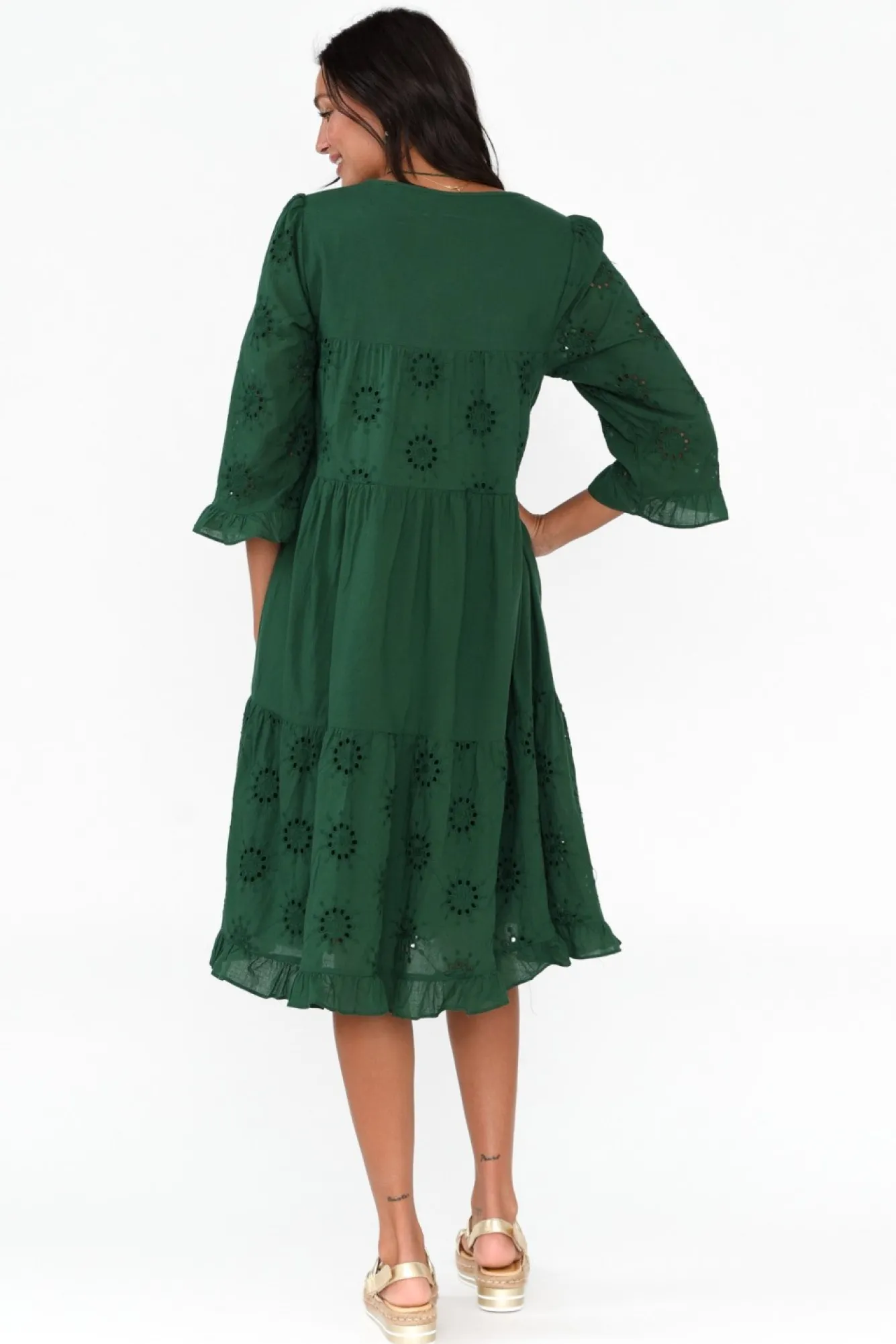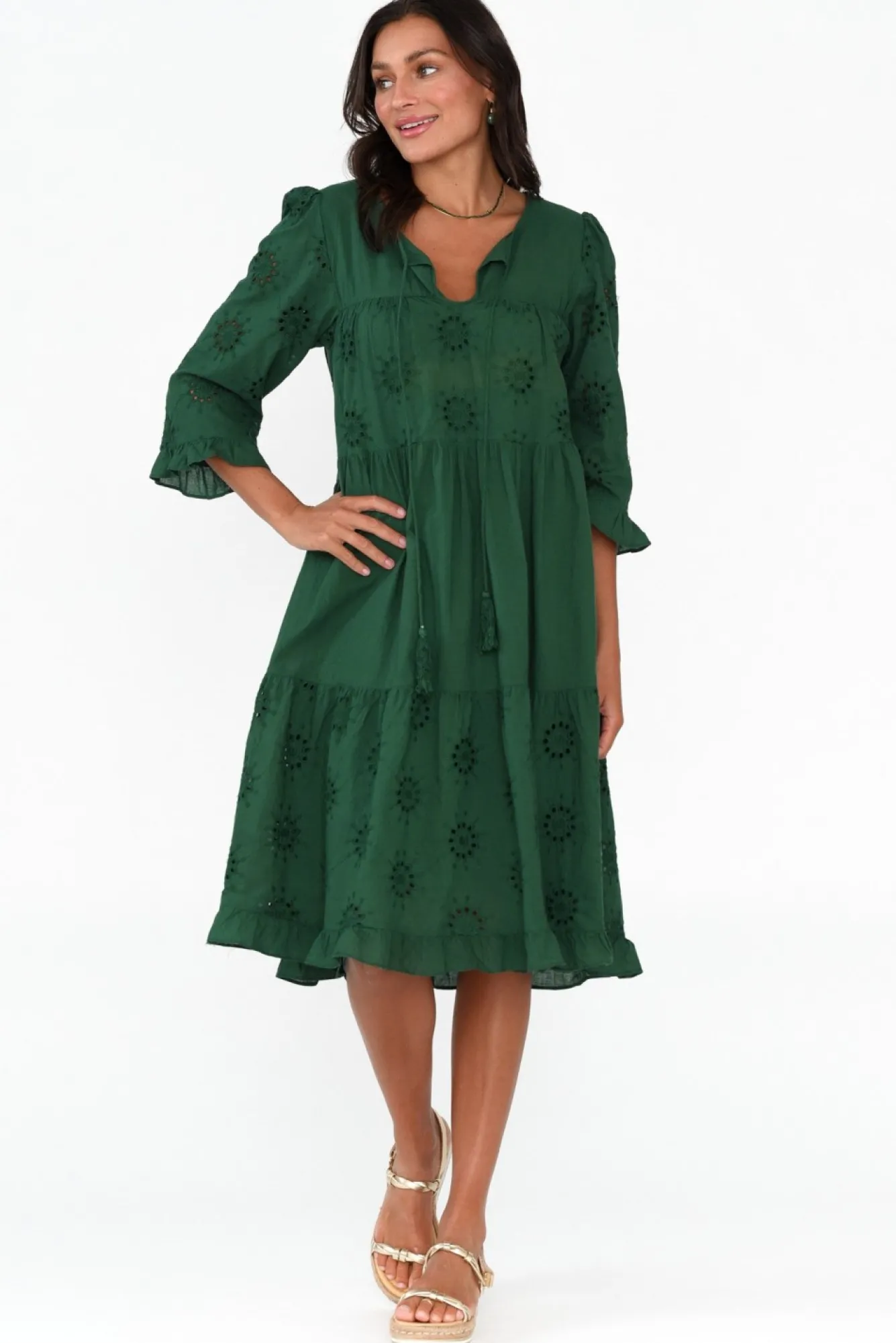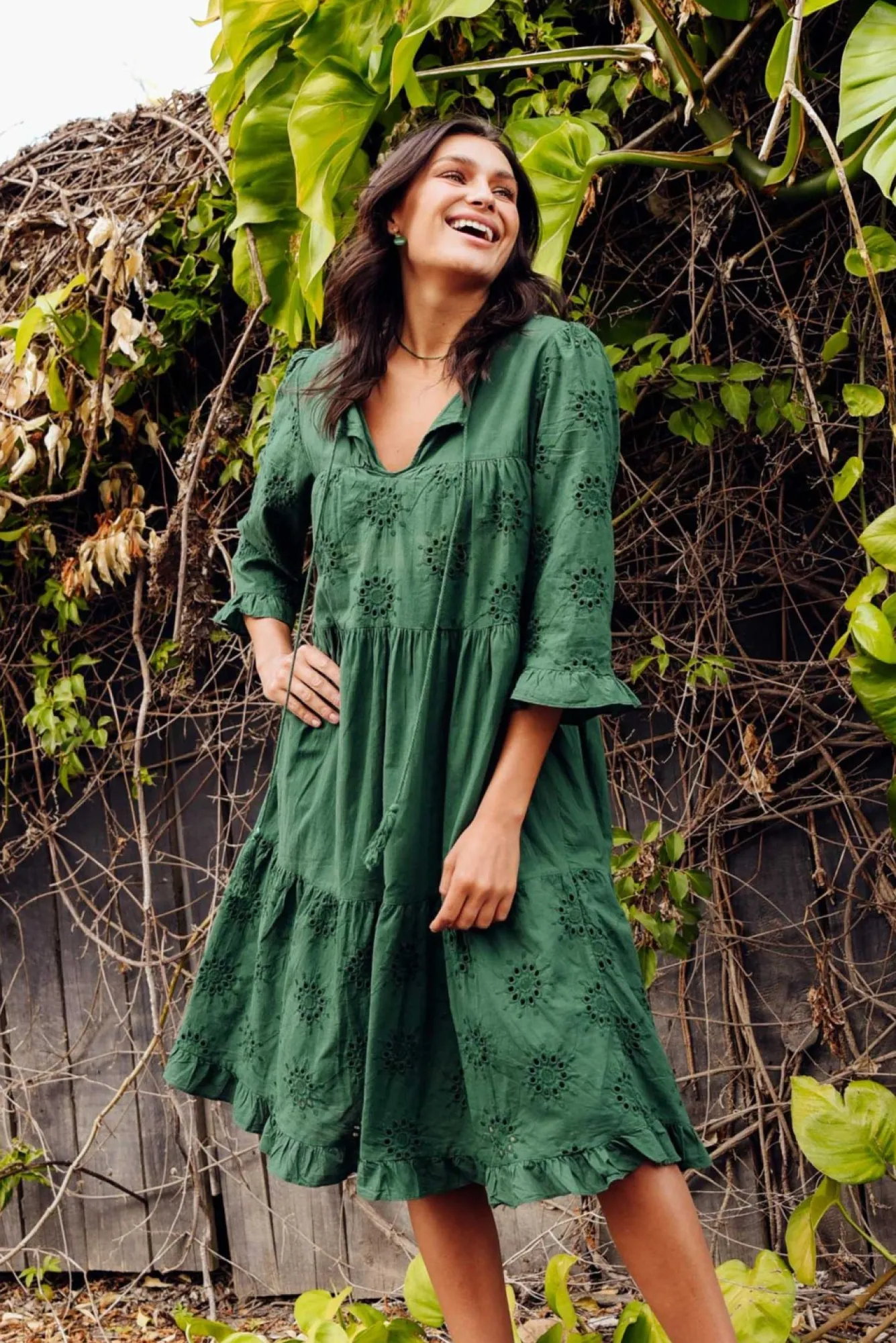 Fit: True To Size. Refer To Size & Fit Tab Below For Specific Size RecommendationNNfabric: 100% Cotton Nbreathable, Lightweight Cotton With A Soft Hand Feel Featuring A Non-Stretch LiningNstunning Anglaise Details Elevate This StyleNv Neckline With Tassel Tie DetailNNthree-Quarter Length Straight Sleeves With A Frill CuffNflowy A-Line Silhouette With Tier DetailingNNstraight Hem Falls To The KneesNNcare: Cool Gentle Hand Wash RecommendedNNcolour: Emerald Green