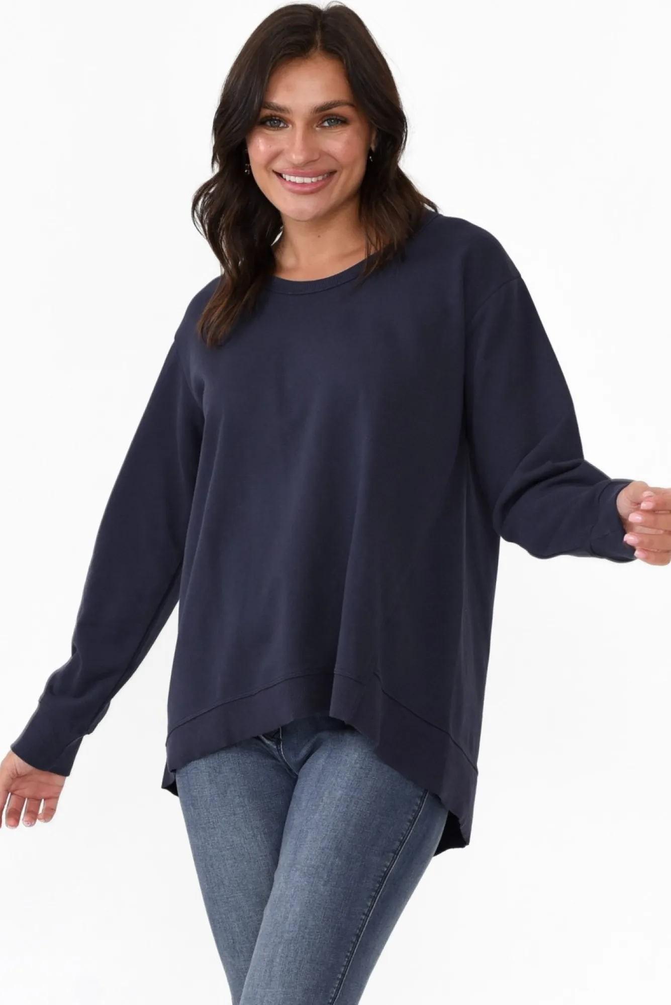 Fit: True To Size. Refer To Size & Fit Tab Below For Specific Size RecommendationNNfabric: 100% Cotton Nmidweight And Comfy Cotton Sweatshirt With An Unbrushed Cotton Fleece UndersideNNribbed Details At The Neckline, Cuff And Hem In A Classic Crew StyleNsimple Rounded Neckline For A Timeless LookNNfull-Length, Straight SleevesNNslouchy A-Line Silhouette Nhi-Lo Hem With An Asymmetric Cut At The BackNNasymmetric Side Seam DetailNNcare: Cool Gentle Machine Wash RecommendedNNcolour: Navy Blue