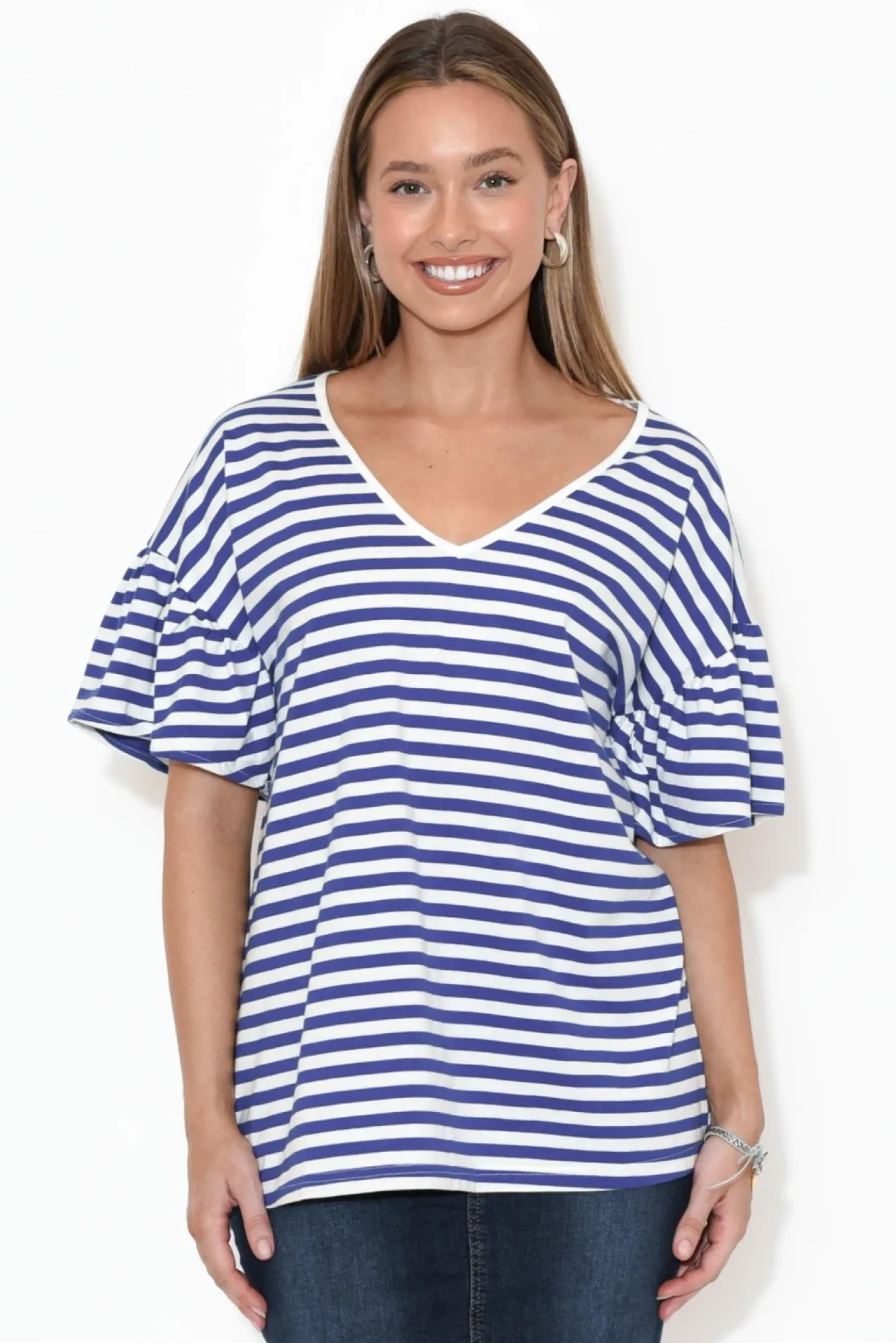 Fit: True To Size. Refer To Size & Fit Tab Below For Specific Size RecommendationNNfabric: CottonNa Lightweight And Comfortable Garment Made From Breathable CottonNNa Wardrobe Must-Have With A Fun And Floaty FeatureNdesigned With A Wide, V-Neckline NNhalf-Length Flared Sleeves With Drop Shoulder SeamNrelaxed, Straight SilhouetteNhi Lo Hemline With Subtle CurveNNgarment Falls To The HipsNNcare: Cool Gentle Hand Wash RecommendedNNcolour: Crisp Blue And White Horizontal Stripe