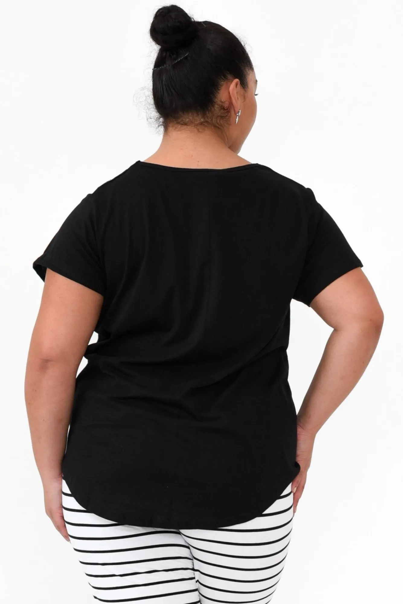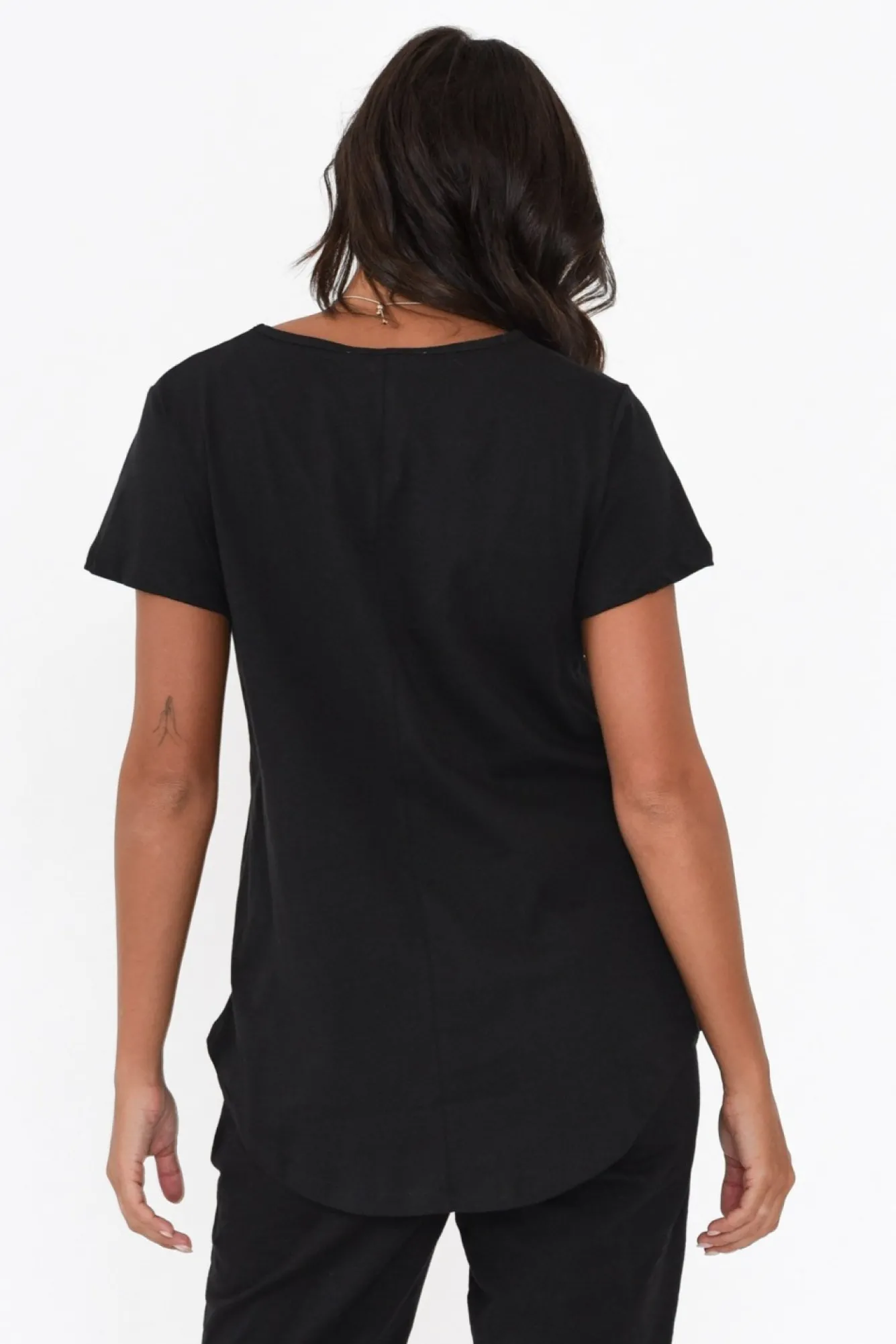 Fit: True To Size. Refer To Size & Fit Tab Below For Specific Size RecommendationNNfabric: 100% CottonNlovely Soft Cotton Fabric With A Lightweight And Breathable FeelNNsimple V Neckline Sits Above The BustNNcomfortable Tee Silhouette With A Subtle A-Line Flare NNshort Sleeve StyleNhi-Lo Hemline Skims The Hips NNNcare: Cool Gentle Hand Wash RecommendedNNcolour: Timeless Black Shade