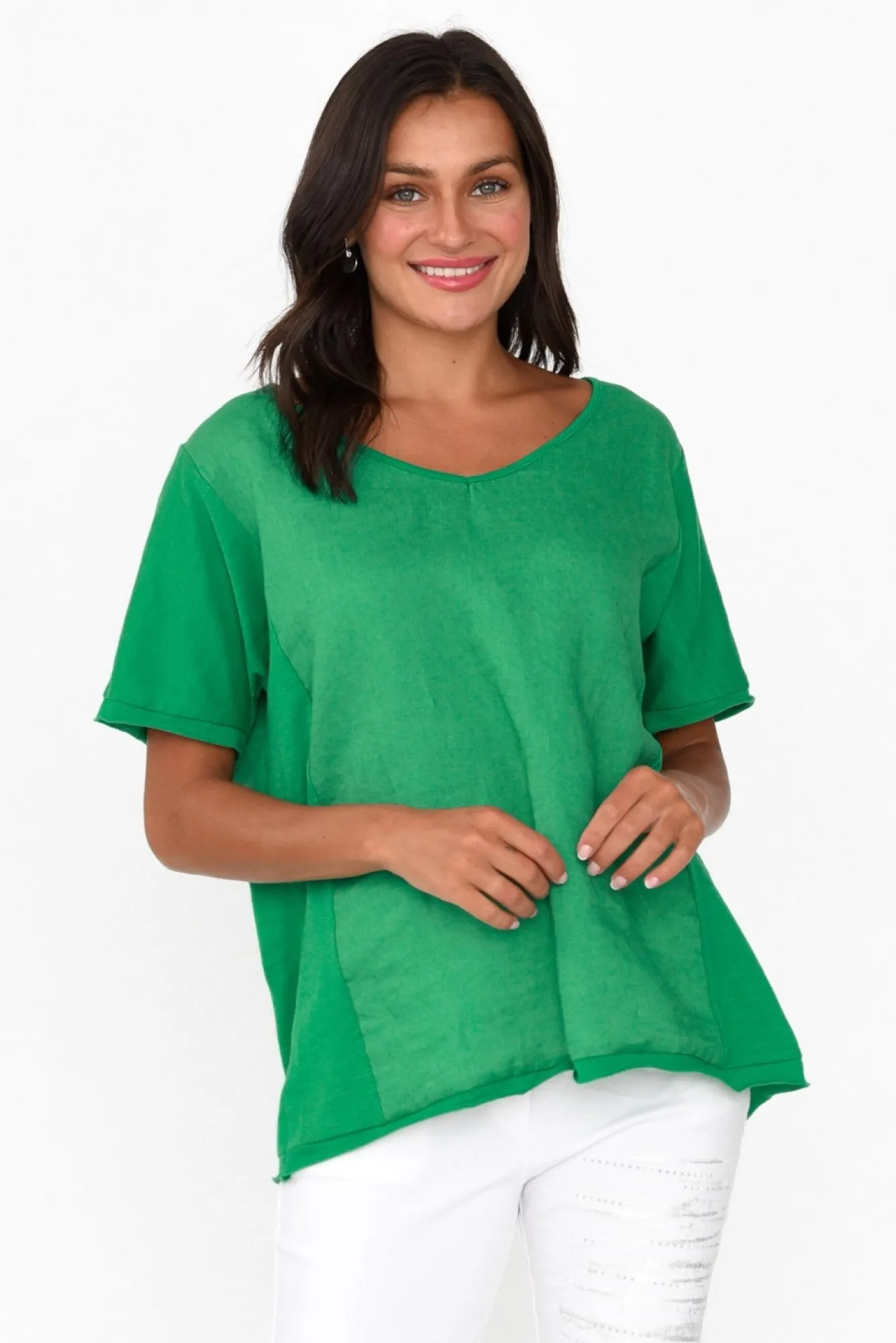 Fit: True To Size. Refer To Size & Fit Tab Below For Specific Size RecommendationNNNfabric: Main: 100% Linen Contrast: 100% CottonNlightweight, Breathable And Non-Stretch Fabric Designed With A Soft Hand Feel NNsoft V-Neckline Complements The Straight Half-Length Sleeves NNversatile A-Line Silhouette With Flaring At The Hips NNfeaturing Stretchy Cotton Slub Fabric On The Sides And Sleeves For Contrasting LookNstraight Hemline With A Rolled Cotton Trim NNfalls To Hip Length NNcare: Cool Gentle Machine Wash RecommendedNNcolour: Vibrant Green Shade