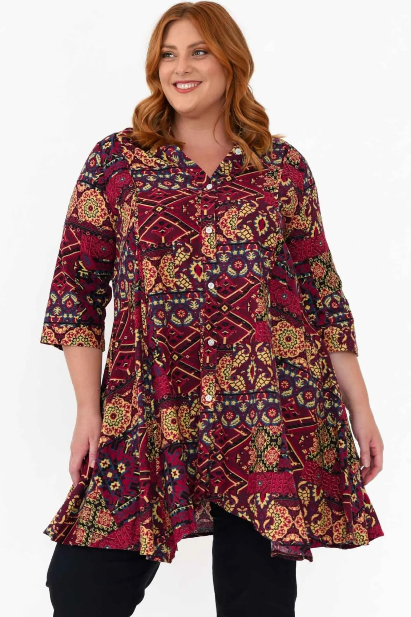 Fit: True To Size. Oversized Fit. Refer To Size & Fit Tab Below For Specific Size Recommendation NNfabric: 70% Cotton, 30% LinenNmade From A Lightweight And Breathable Blend Of Natural Fibres Nsharp Collared Neckline Complete With A Button-Down Front Nclassic 3/4 Length Sleeves NNa-Line Tunic Design Enhanced By Flaring At The Hips NNtwo Side Seam Pockets NNasymmetrical Hemline Falls To An Above-Knee LengthNNcare: Cool Gentle Hand Wash RecommendedNNcolour: Berry Pink Base With An Intricate Diamond Print NNstyle Tip: Pair With Your Favourite Pair Of Pants, Jeans Or Leggings For More Coverage Or To Complete The Look.