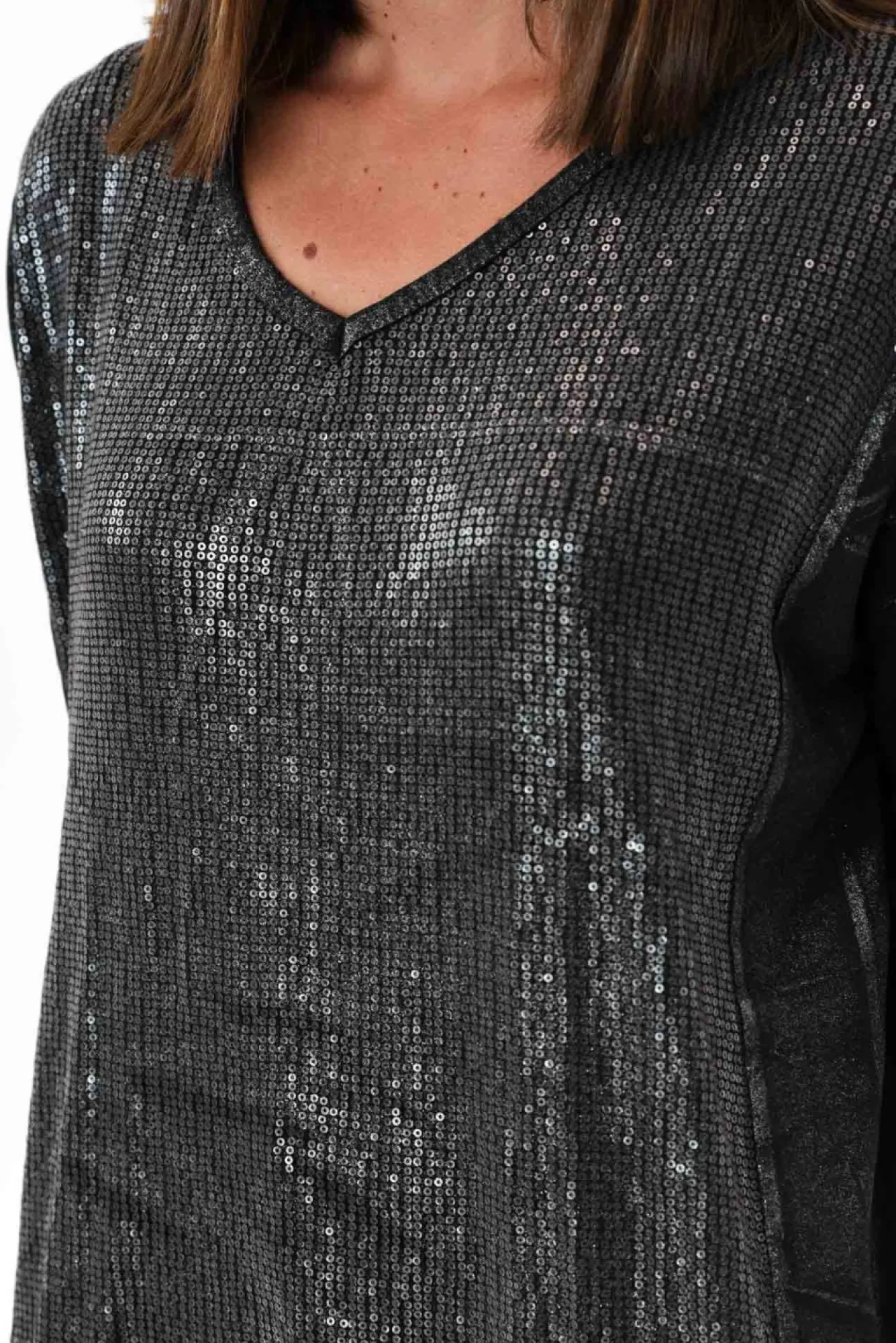 Fit: True To Size. Refer To Size & Fit Tab Below For Specific Size RecommendationNNfabric: 60% Cotton, 30% Linen, 10% Polyester Ncomfort Meets Sparkle In This Lightweight, Breathable, And Stretchy TopNNsharp V Neckline NNsequined Front Is Complemented By Glittery Side Panels And SleevesNdrop Shoulder Style Leads To 3/4 Length SleevesNstretchy Cotton Back Yoke, And Non-Stretch Linen Back With A Singular PleatNNhi-Lo Hemline Falls Just Past The HipsNNNcare: Cool Gentle Machine Wash RecommendedNNcolour: Sparkly Black ShadeNNnote: Please See Photos Rather Than Video For Most Accurate Colour