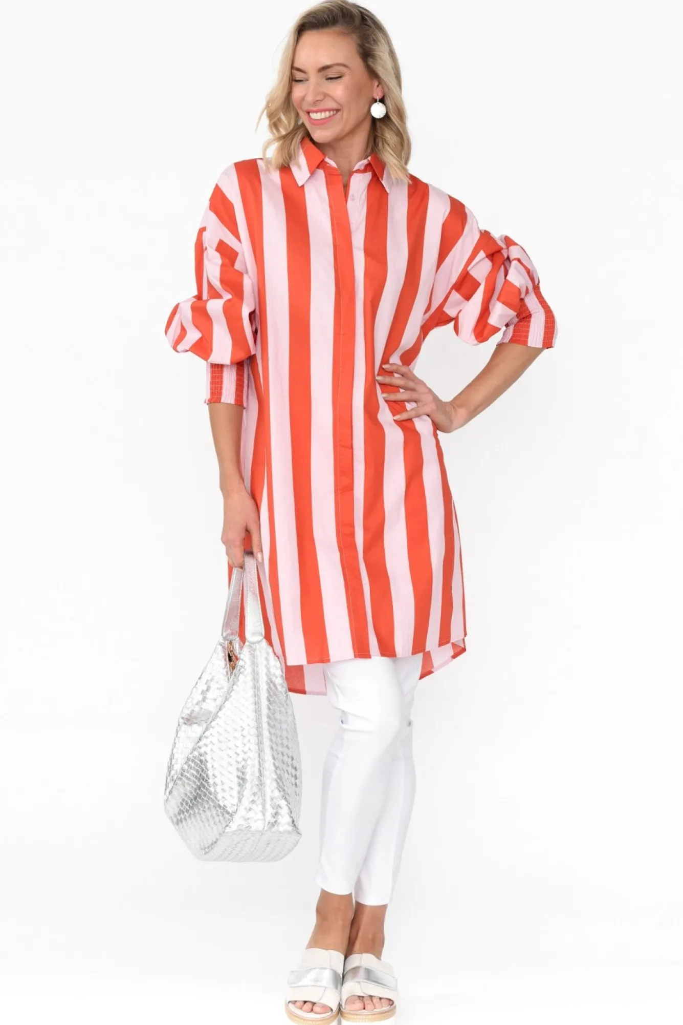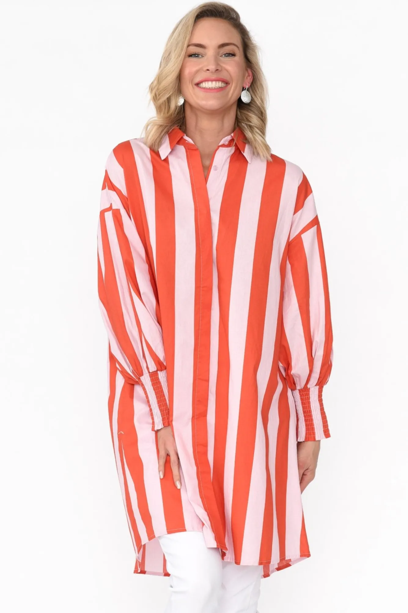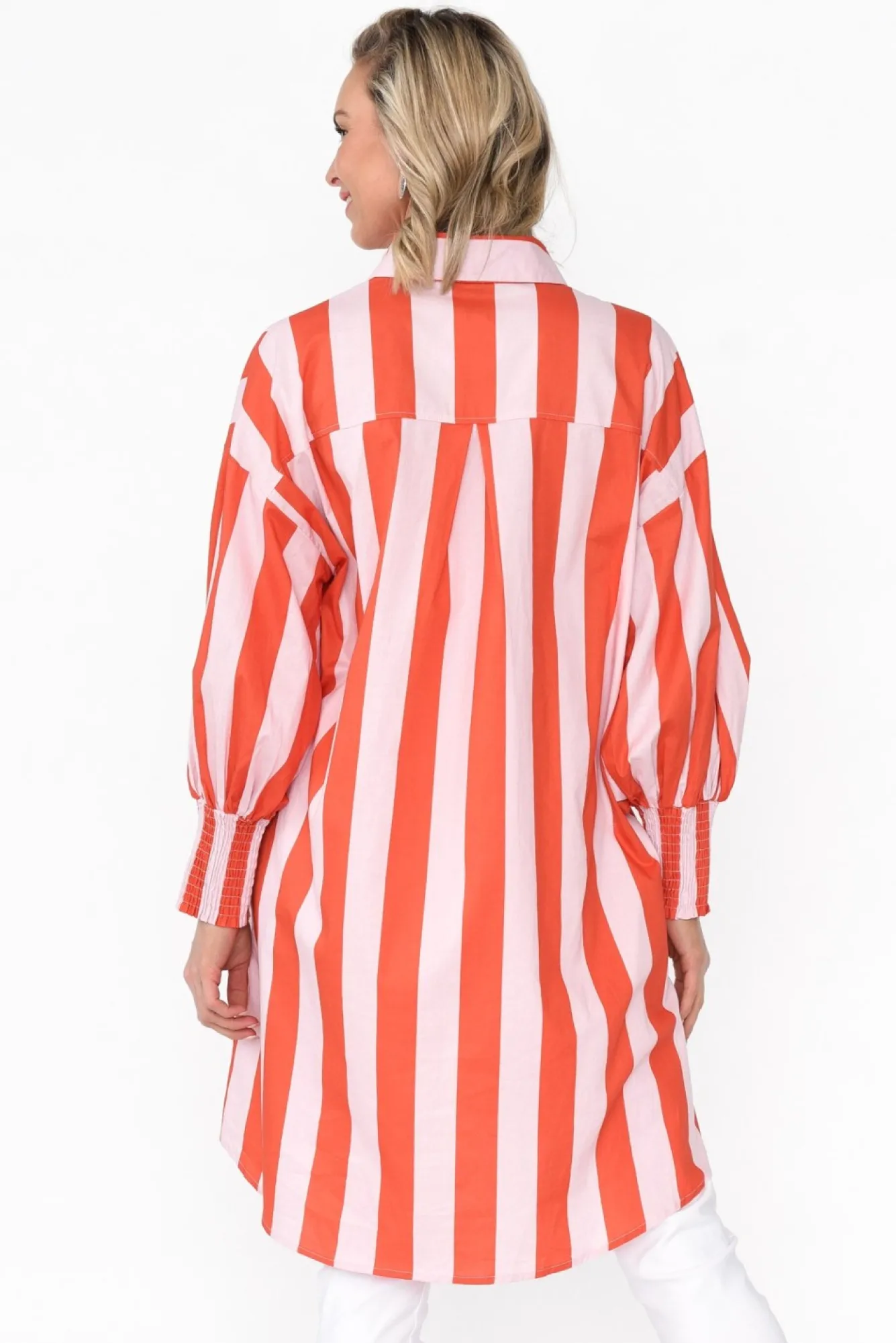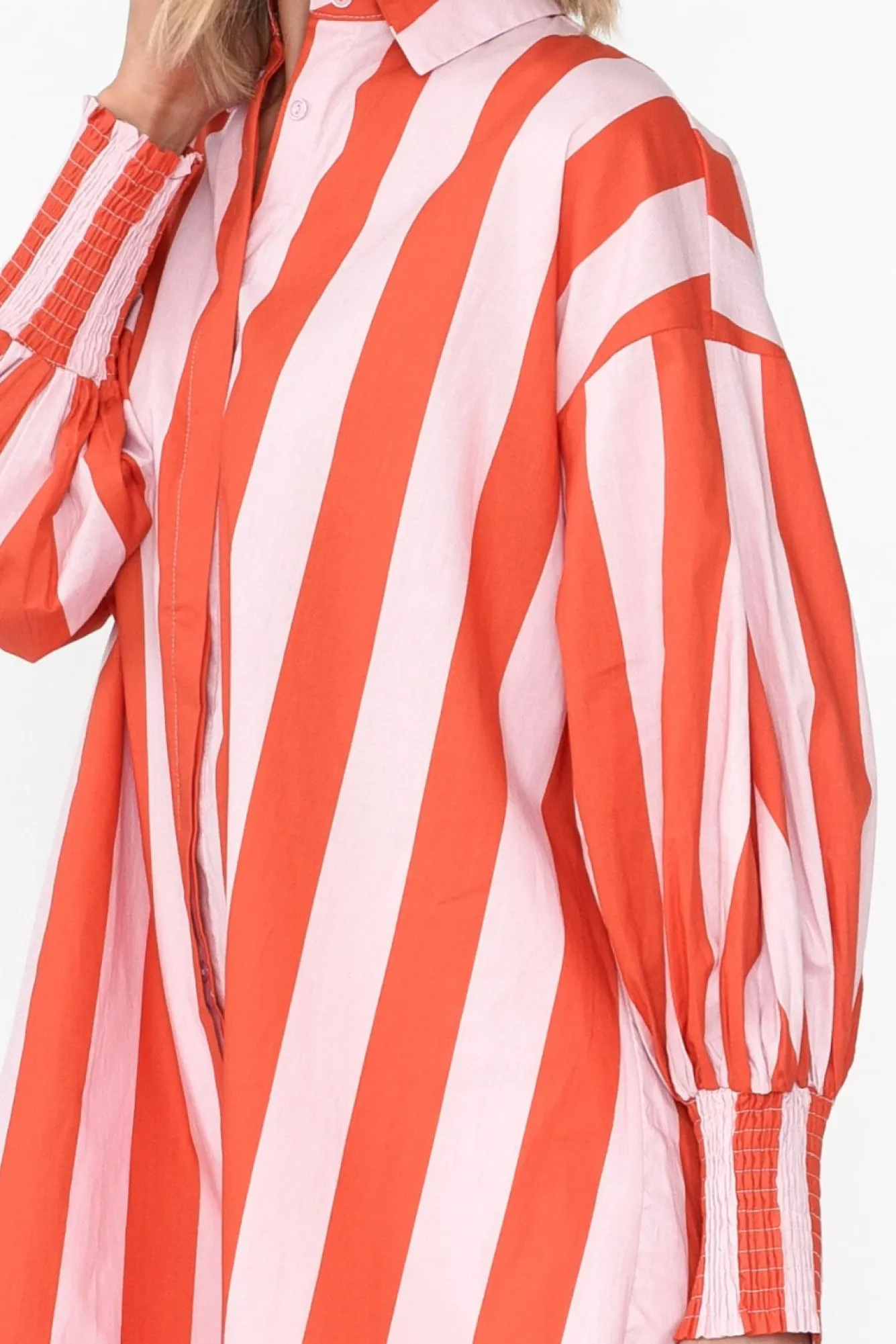 Fit: True To Size. Refer To Size & Fit Tab Below For Specific Size RecommendationNNfabric: 100% CottonNlightweight, Breathable And Non-Stretch Cotton With A Crisp Poplin FeelNNsharp Collared Neckline Leads To A Button-Down Front NNcomes With An Optional Fabric Double Ring Belt With Gold HardwareNfull-Length Puff Sleeves With An Exaggerated Shirred Cuff NNbreezy, Straight SilhouetteNNsubtle Hi-Lo Hemline Falls To Mid-Thigh NNNcare: Cool Gentle Hand Wash RecommendedNNcolour: Soft Pink And Orange Stripe Print
