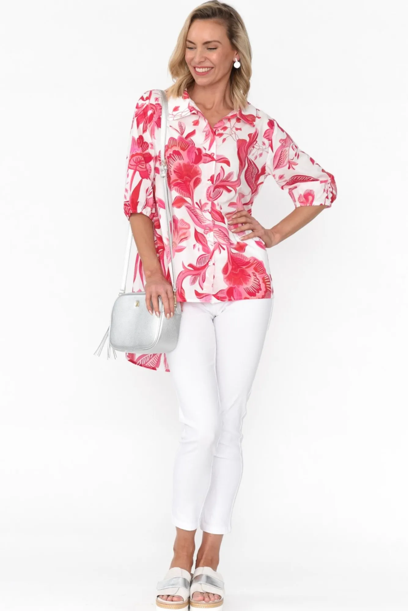 Fit: True To Size. Refer To Size & Fit Tab Below For Specific Size RecommendationNNfabric: 100% CottonNlightweight, Breathable And Non-Stretch Cotton With A Crisp Poplin Hand Feel NNfabric Is Semi Sheer, We Recommend Pairing With Nude Undergarments Nsharp Collared Leads To A Button-Down Front NN3/4 Length Sleeves With A Loose Elasticated Cuff To Create A Subtle Puff LookNNrelaxed Straight Silhouette NNdramatic Hi-Lo Hemline Falls To Hip Length NNNcare: Cool Gentle Hand Wash RecommendedNNcolour: White Base With A Lush Floral Print In Shades Of Pink