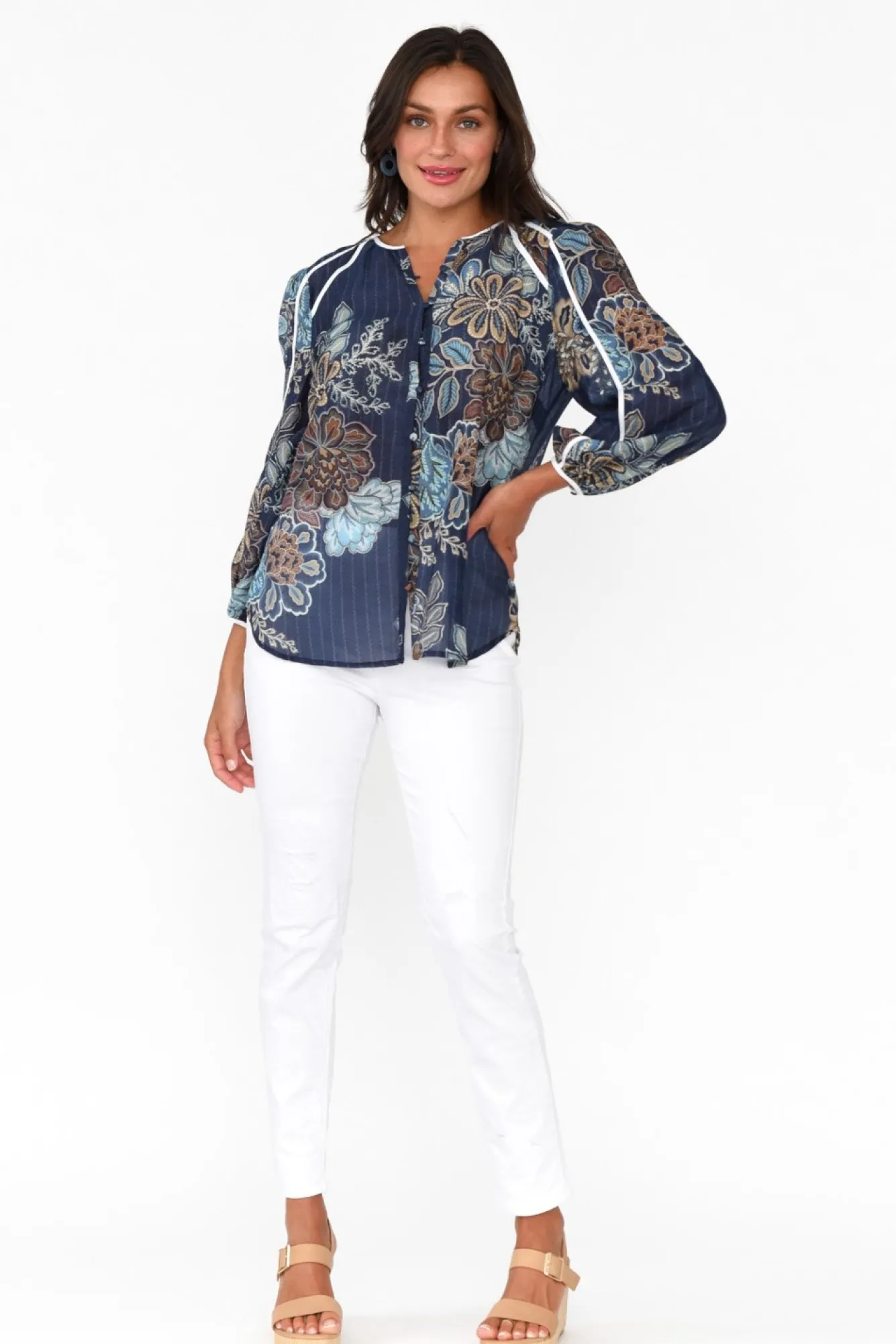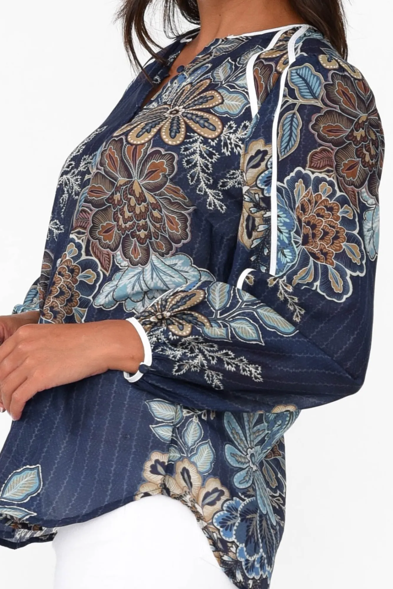 Fit: True To Size. Refer To Size & Fit Tab Below For Specific Size RecommendationNNfabric: Main: 70% Cotton, 30% Silk Trim: 100% CottonNluxuriously Lightweight, Breathable And Non-Stretch Stretch Cotton-Silk Blend Fabric With A Wonderful Soft And Smooth Texture NNfabric Is Sheer, We Recommend Pairing With A Camisole NNround Neckline Leads To A Delicate Button Down Front Featuring Complementing Fabric Buttons NNfull-Length Billowy Sleeves With A Button Closure At The Cuff NNfloaty Straight Silhouette Defined By Statement Contrasting White Trim Featured Throughout NNhi-Lo Hemline Falls To Hip LengthNNNcare: Cool Gentle Hand Wash RecommendedNNcolour: Intricate Blue And Olive Floral Print Over A Deep Navy Base