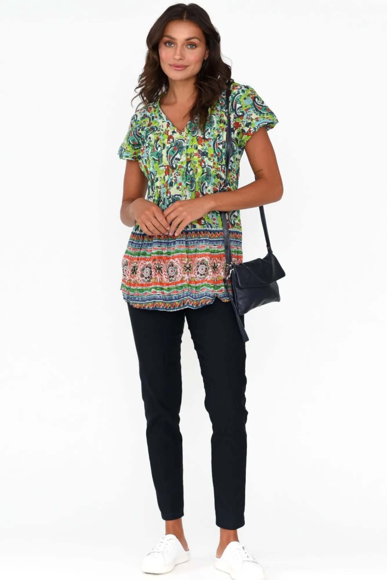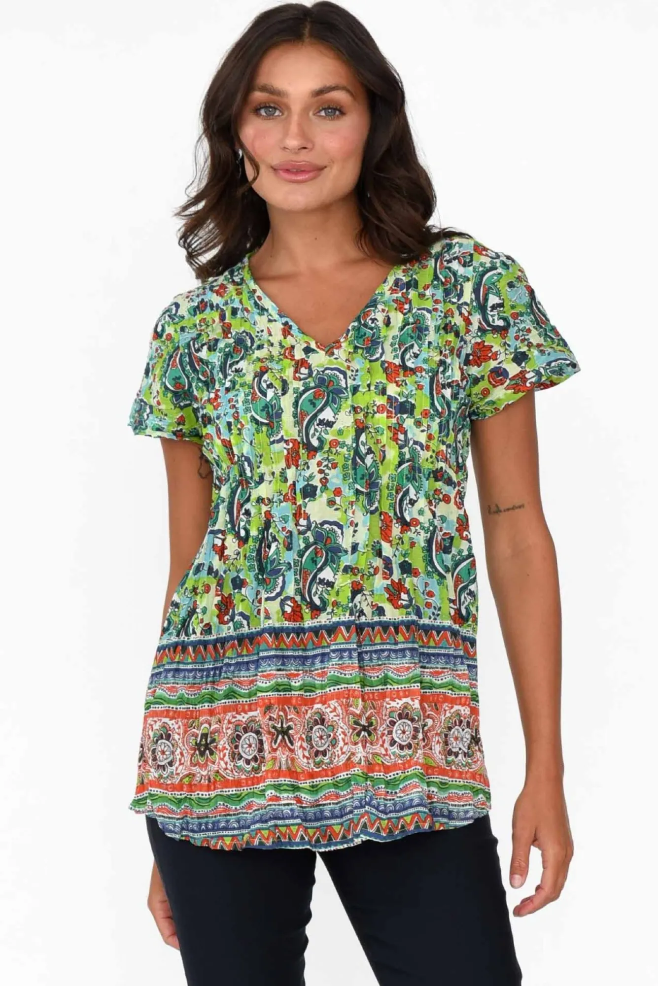 Fit: True To Size. Refer To Size & Fit Tab Below For Specific Size RecommendationNNfabric: 100% CottonNno Ironing Required For This Stunning Crinkle Cotton Top, Made From A Lightweight And Breathable FabricNclassic Tee Style Combining A V-Neckline And Short SleeveNNdelicate Pleating Details At The Bust Elevate This StyleNrelaxed A-Line FitNstraight Hemline Skims The HipsNNNcare: Cool Gentle Hand Wash RecommendedNNcolour: Green Base With A Tapestry-Like Trim And Paisley Overlay NNNfabric Tip: Twist The Garment, Fold In Half And Secure With A Rubber Band To Store After Washing And Drying To Keep The Crinkle Alive