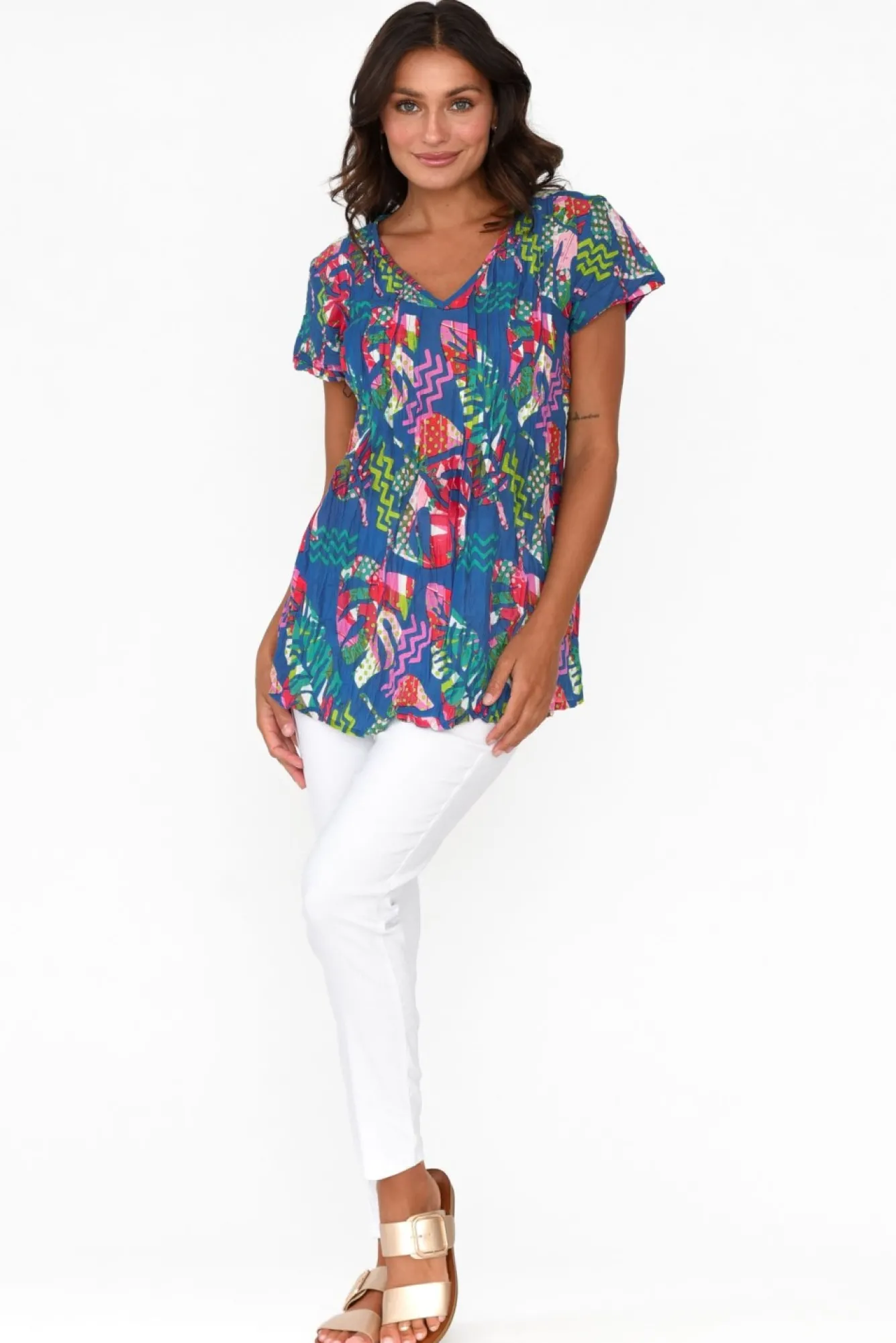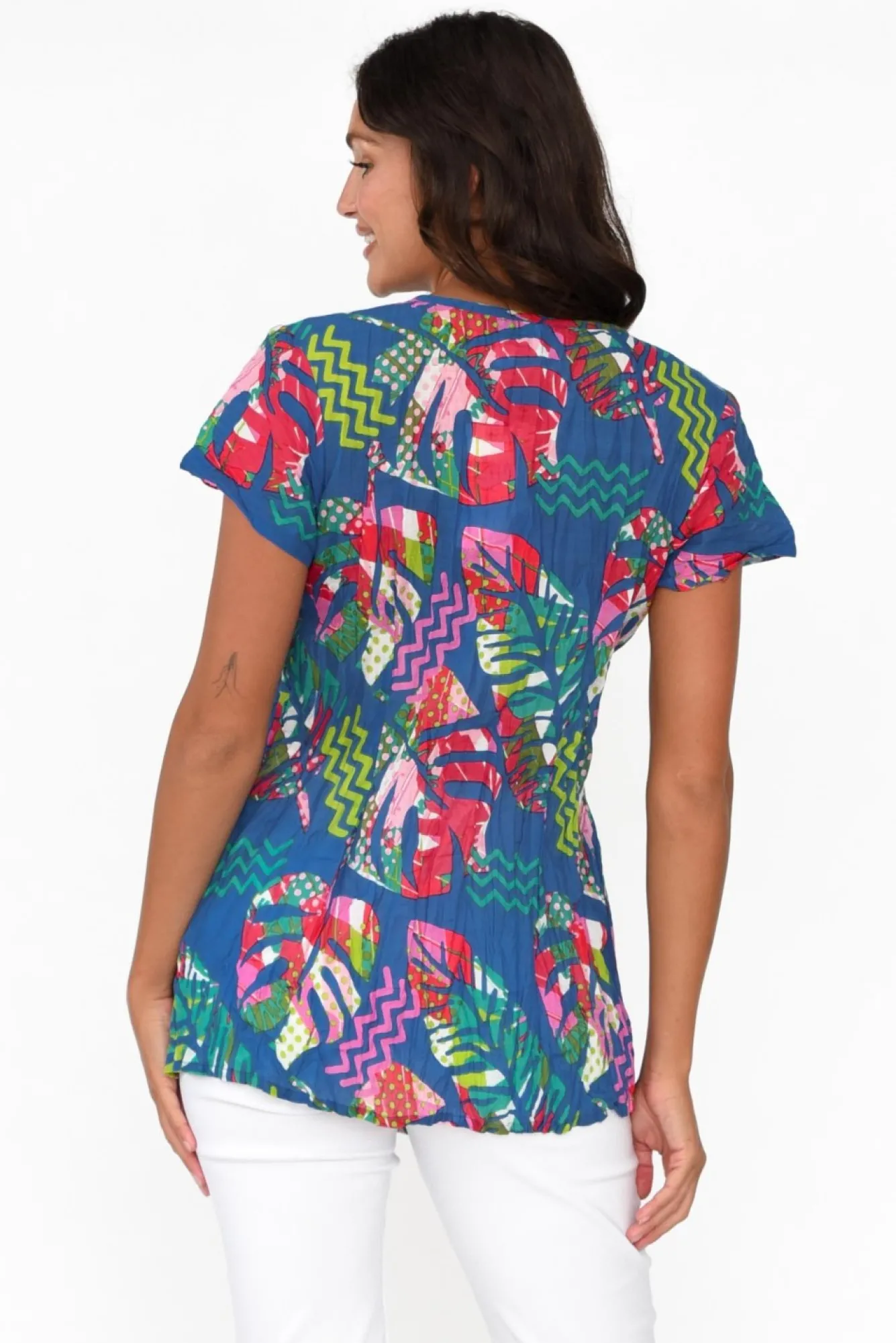 Fit: True To Size. Refer To Size & Fit Tab Below For Specific Size RecommendationNNfabric: 100% CottonNno Ironing Required For This Stunning Crinkle Cotton Top, Made From A Lightweight And Breathable FabricNclassic Tee Style Combining A V-Neckline And Short SleeveNNdelicate Pleating Details At The Bust Elevate This StyleNrelaxed A-Line FitNstraight Hemline Skims The HipsNNNcare: Cool Gentle Hand Wash RecommendedNNcolour: Deep Ocean Teal Base With A Multicolour Foliage Overlay NNNfabric Tip: Twist The Garment, Fold In Half And Secure With A Rubber Band To Store After Washing And Drying To Keep The Crinkle Alive