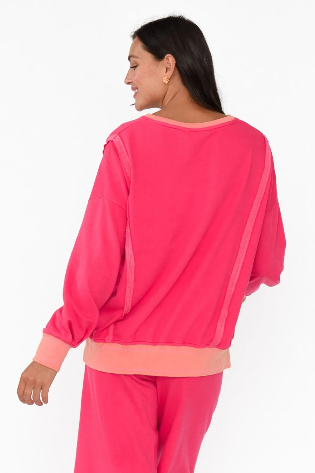 Fit: True To Size. Refer To Size & Fit Tab Below For Specific Size RecommendationNNfabric: Cotton / Polyester Nsoft, Lightweight Cotton Blend With A Stretchy Finish And An Unbrushed Cotton Fleece InnerNNcontrast Round Banded Neckline With A Feature V-SplitNNcomfortable Full Length Sleeves Featuring Contrast CuffsNNstraight, Relaxed SilhouetteNstatement Stitching At The Front And Back With Raw Edging DetailsNstraight Hem Falls To A Hip-Skimming Length With Two Splits At The SidesNNcare: Cool Gentle Machine Wash RecommendedNNcolour: Hot Pink With Contrast Peach Details
