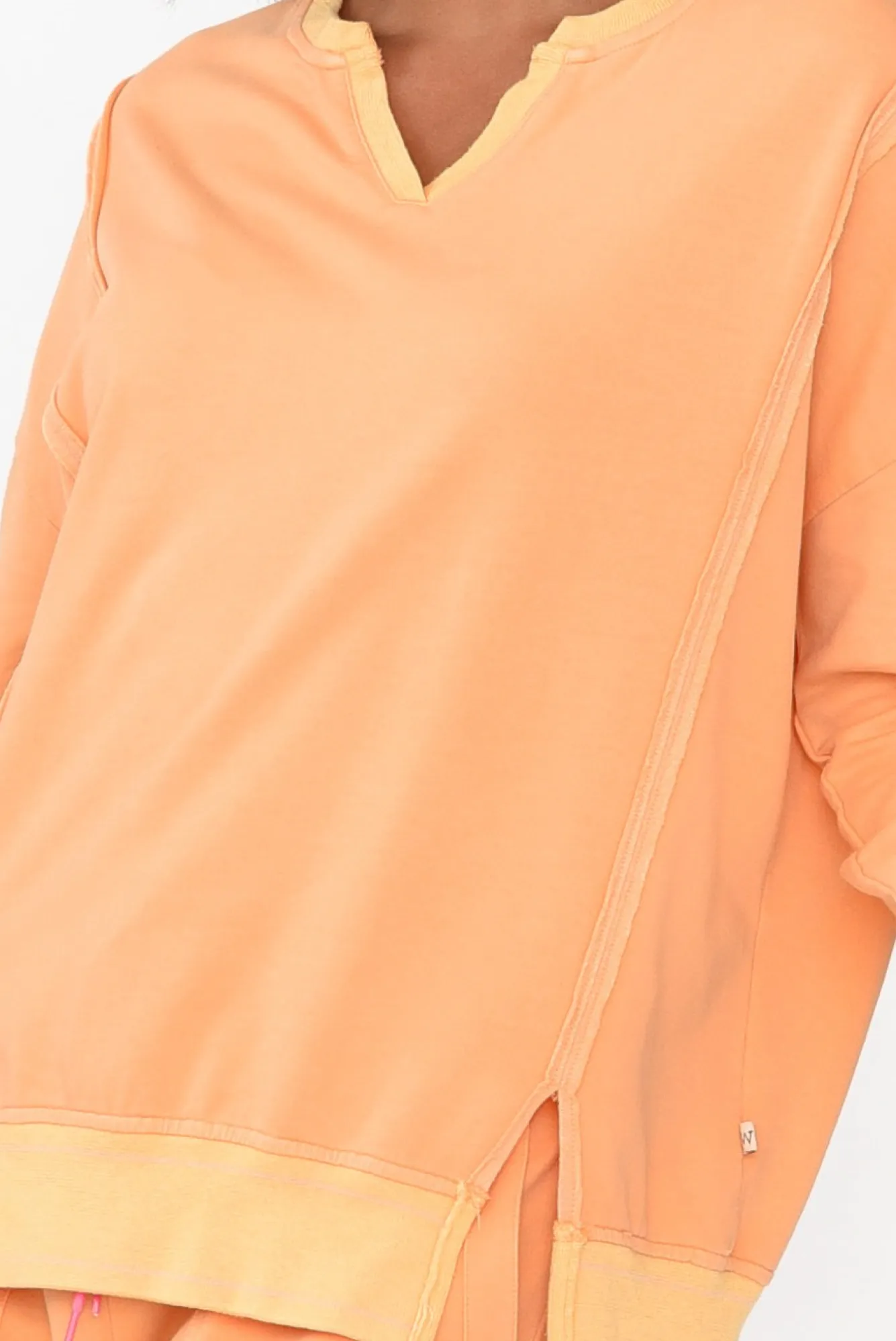 Fit: True To Size. Refer To Size & Fit Tab Below For Specific Size RecommendationNNfabric: Cotton / Polyester Nsoft, Lightweight Cotton Blend With A Stretchy Finish And An Unbrushed Cotton Fleece InnerNNcontrast Round Banded Neckline With A Feature V-SplitNNfull-Length Sleeves With Contrast CuffsNNstraight, Relaxed SilhouetteNstatement Stitching At The Front And Back With Raw Edging DetailsNstraight Hem Falls To A Hip-Skimming Length With Two Splits At The SidesNNcare: Cool Gentle Machine Wash RecommendedNNcolour: Orange With Yellow Contrast Details