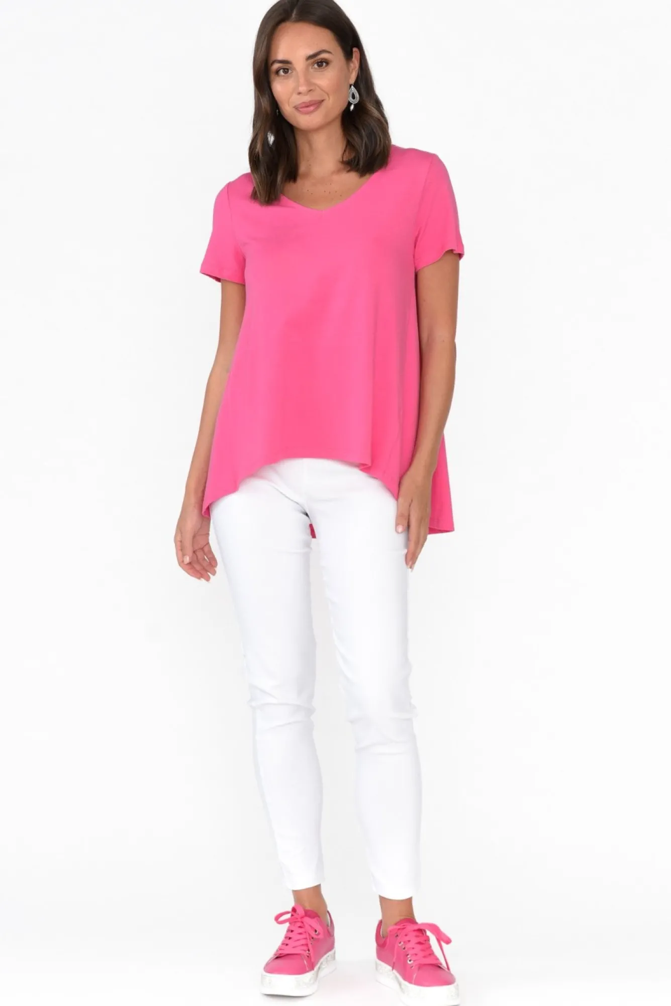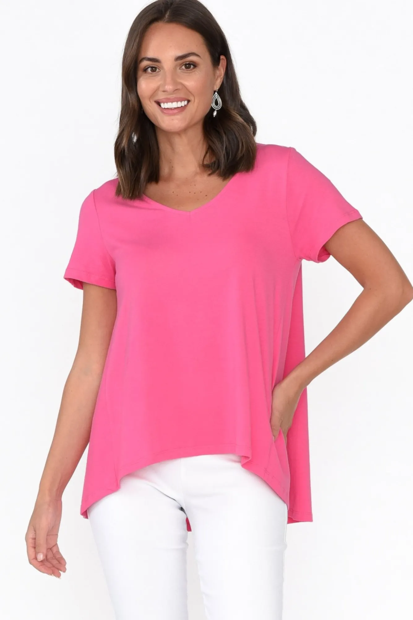Fit: True To Size. Refer To Size & Fit Tab Below For Specific Size RecommendationNNfabric: Cotton / ElastaneNdesigned With A Perfectly Lightweight, Stretchy And Soft Cotton Blend NNsoft V-Neckline Flatters Collarbones Nshort Tee-Style Sleeves NNflattering A-Line Silhouette Creates A Swing Effect At The HipsNcurved Hi-Lo Hem Provides More Coverage At The Back NNNcare: Cool Gentle Machine Wash RecommendedNNcolour: Lovely Rose Pink