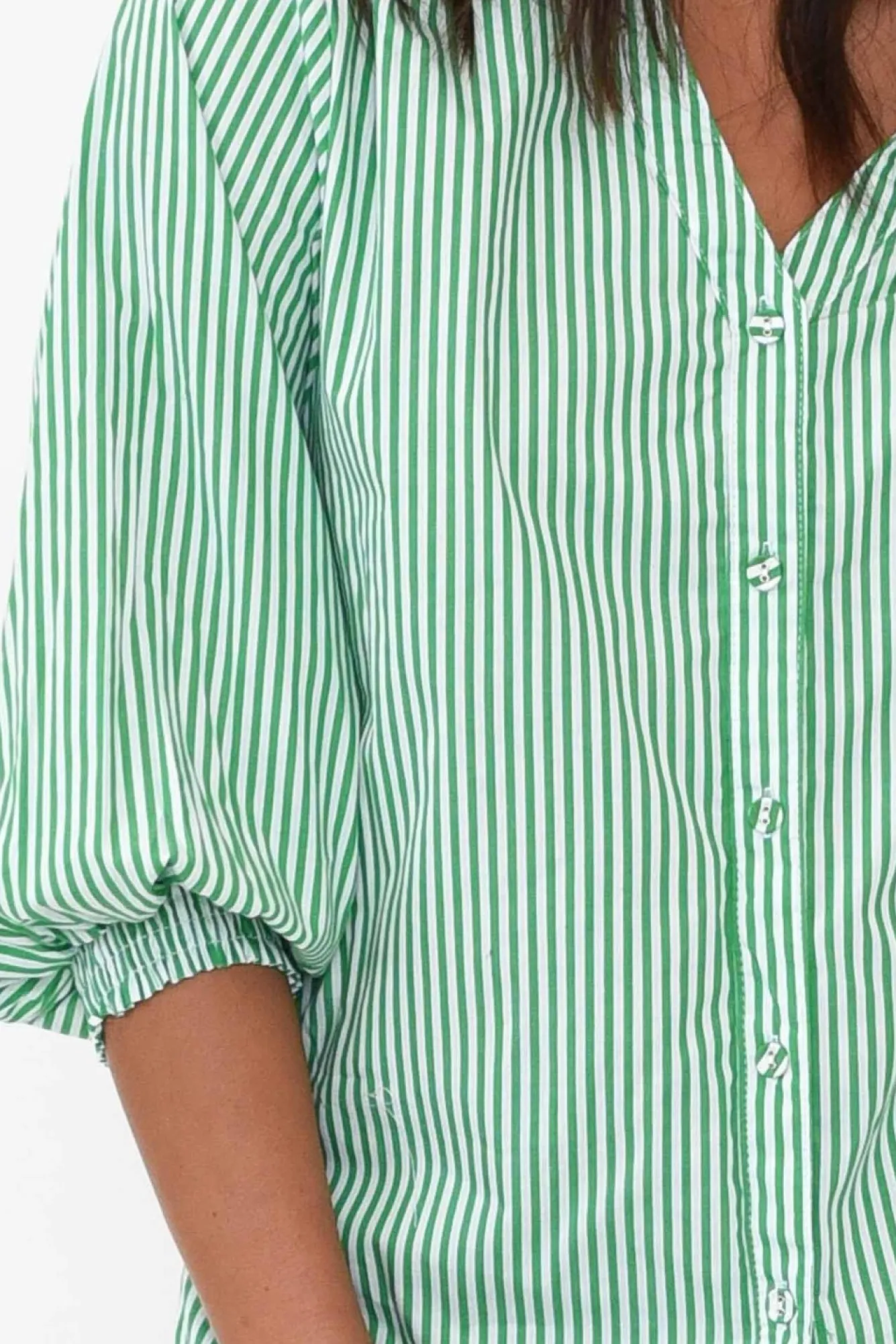 Fit: True To Size. Refer To Size & Fit Tab Below For Specific Size RecommendationNNfabric: 100% CottonNlightweight, Breathable And Non-Stretch Cotton With A Crisp Poplin Hand Feel Nsharp Opened Collared Neckline NNbutton-Down Front Features Fabric Buttons For A Refined Look N3/4 Length Puff Sleeves Enhanced By Elasticated Ruched Cuff NNclassic Straight Silhouette NNrounded Hemline Falls To Hip-Length NNNcare: Cool Gentle Hand Wash RecommendedNNcolour: Eye-Catching Green And White Stripe Print