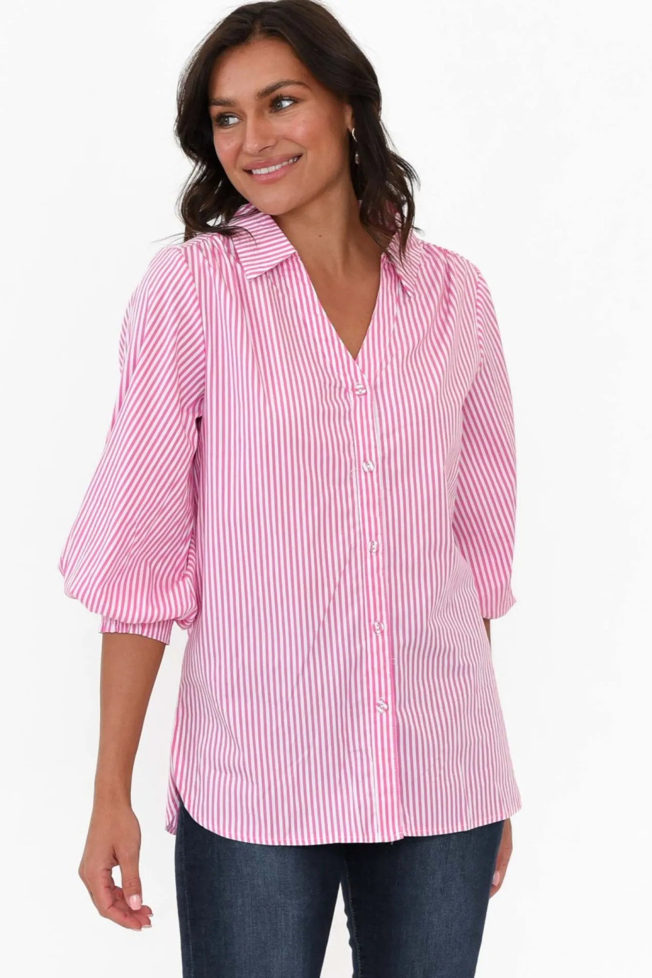 Fit: True To Size. Refer To Size & Fit Tab Below For Specific Size RecommendationNNfabric: 100% CottonNultra-Breathable Lightweight And Non-Stretch Cotton With An Elevated Crisp Hand FeelNNopen V-Neck Design Exaggerated By Sharp Collar NNtranseasonal Button-Down Front Featuring Fabric Buttons For A Refined Look N3/4 Length Puff Sleeves Enhanced By Elasticated Ruched Cuff NNversatile Straight Silhouette NNrounded Hemline Falls To Hip-Length NNNcare: Cool Gentle Hand Wash RecommendedNNcolour: Candy Pink And White Stripe