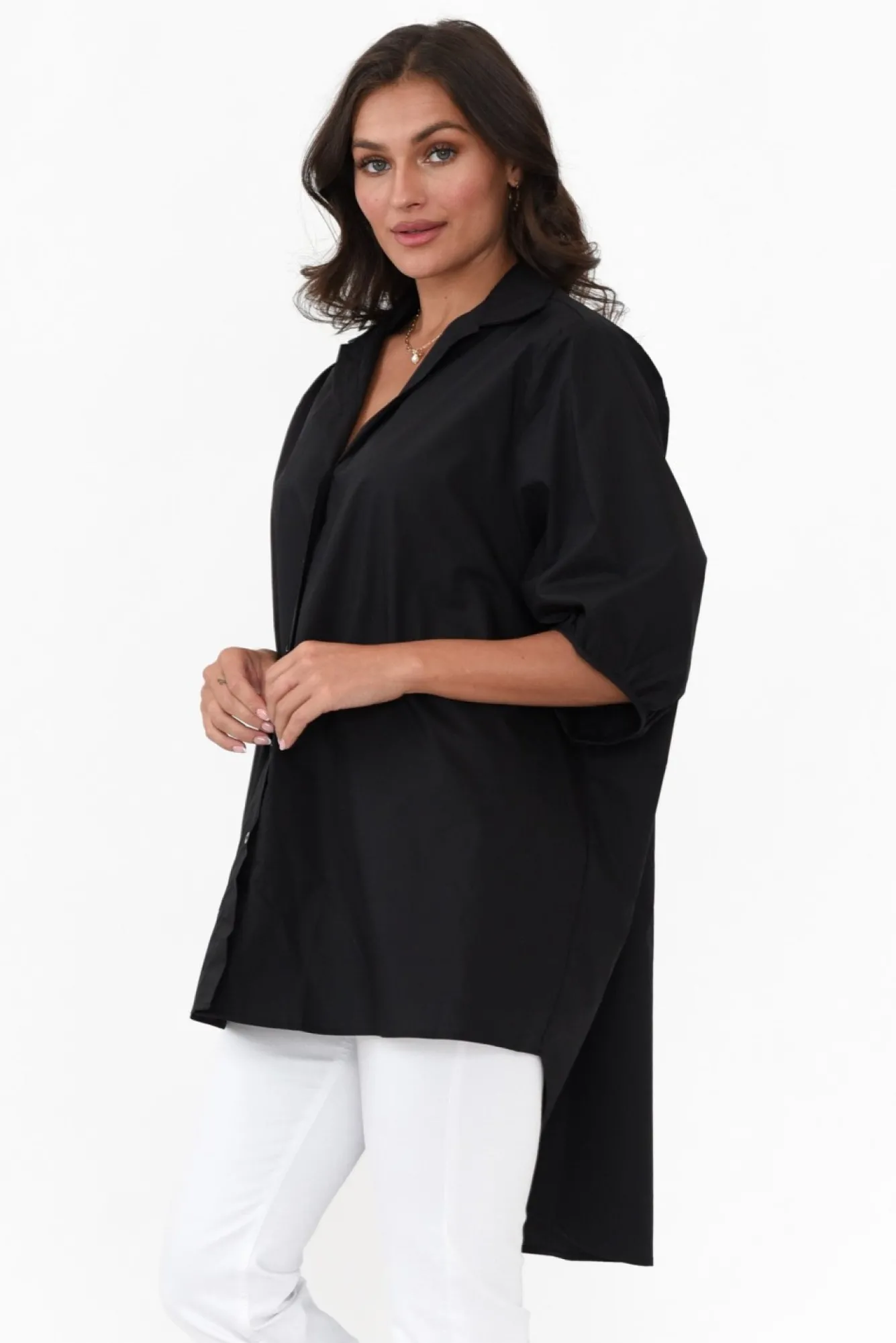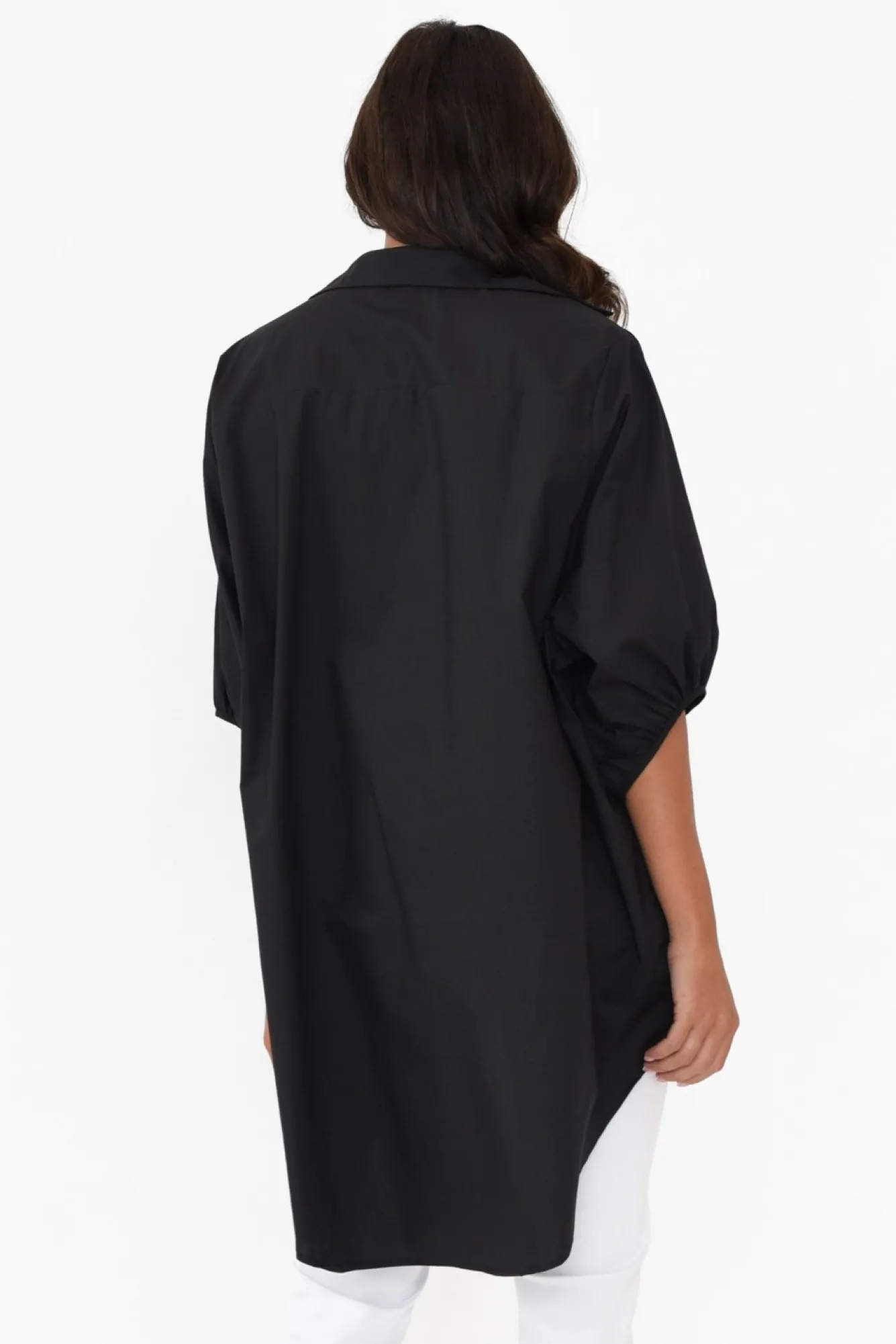 Fit: Oversized Fit. Refer To Size & Fit Tab Below For Specific Size RecommendationNNfabric: 100% CottonNmade From Crisp Lightweight, Breathable And Non-Stretch Cotton PoplinNNsharp Collared Neckline Design Complements The Button-Down FrontNbillowy Half-Length Sleeves NNoversized Straight Silhouette NNstatement Hi-Lo HemlineNNdrapes Below Hip Length NNcare: Cool Gentle Hand Wash RecommendedNNcolour: Midnight Black