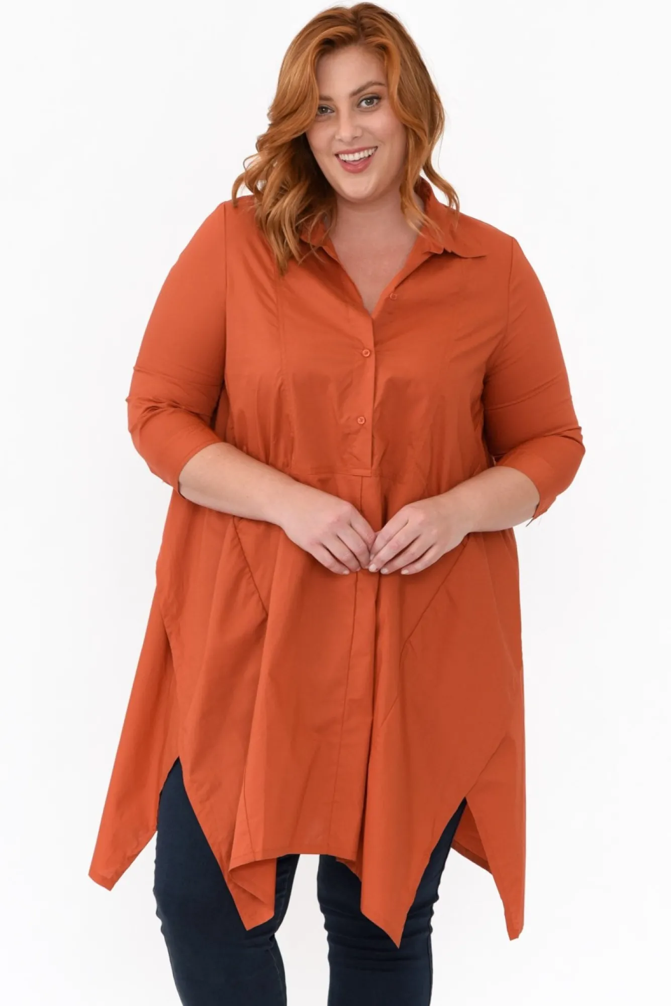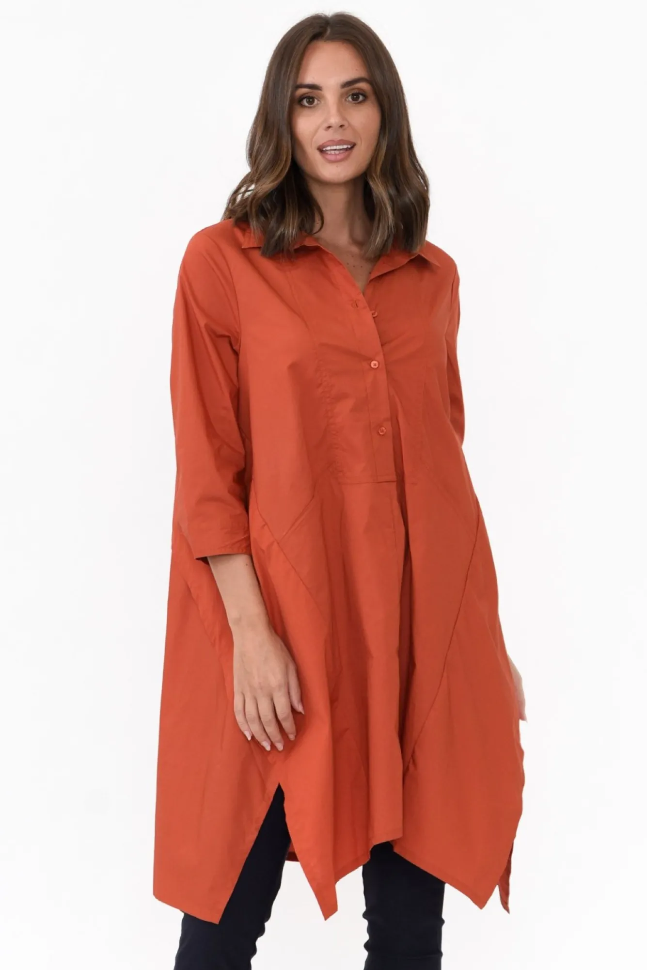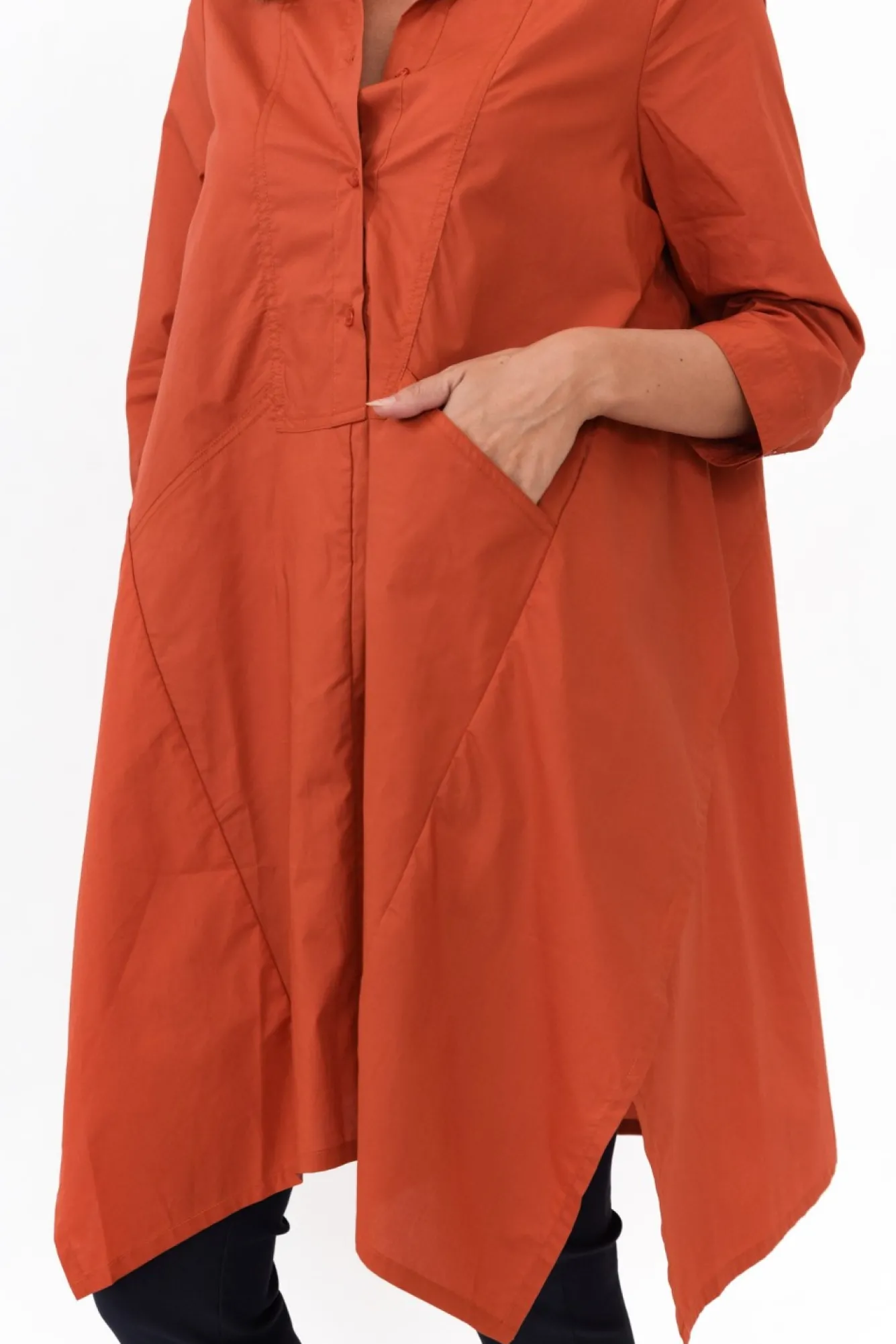 Fit: Relaxed Fit. Refer To Size & Fit Tab Below For Specific Size RecommendationNNfabric: 100% Cotton Ngorgeous Smooth And Crisp Cotton Poplin Offering Wonderful Breathability NNsharp Collared Neckline With Buttons Cascading Down Bust NN3/4 Length Sleeves With Button Cuff NNtimeless A-Line Silhouette With Elevated Diagonal Seam DealingNhandkerchief Style Hemline Falls Below Hip Length NNtwo Front Pockets Located In Front Diagonal Seams NNcare: Cool Gentle Machine Wash RecommendedNNcolour: Warm Rust Shade