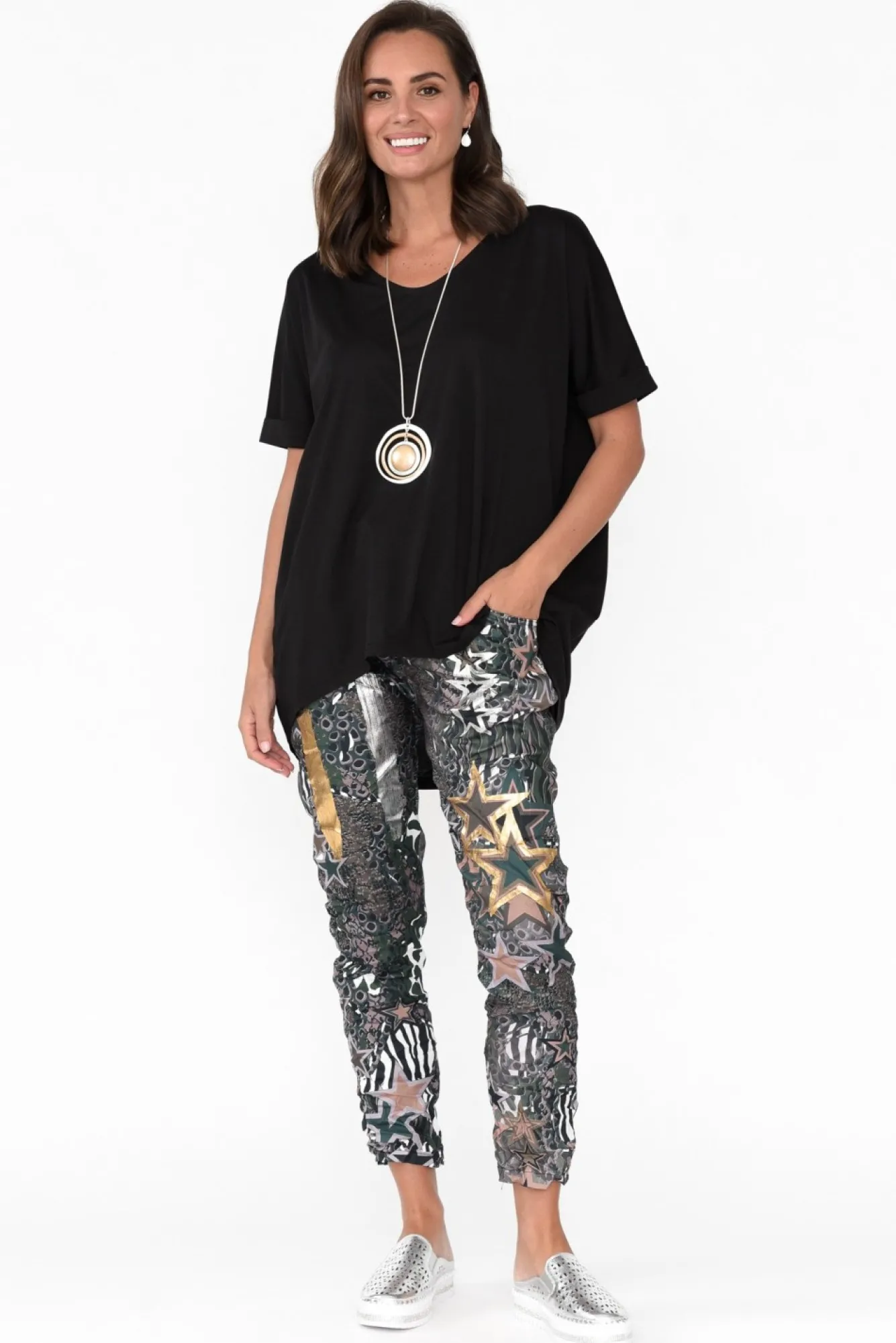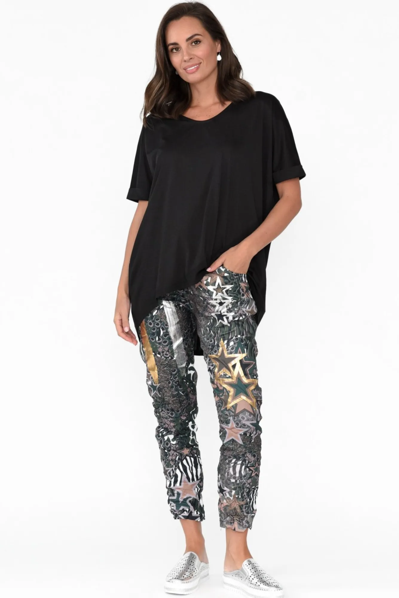 Fit: True To Size. Refer To Size & Fit Tab Below For Specific Size RecommendationNNfabric: 40% Cotton, Rayon 40%, Polyester 20% Nlightweight And Non-Stretch Cotton Rayon Blend With A Silky Soft Hand Feel NNrounded V-Neckline NNstraight Sleeves With A Stitched Rolled Hem And Drop Shoulder Create A Relaxed Look NNdrape Silhouette Offers All-Day Comfort Ndramatic Hi-Lo Hem Provides More Coverage At The BackNNNcare: Cool Gentle Machine Wash RecommendedNNcolour: Midnight Black