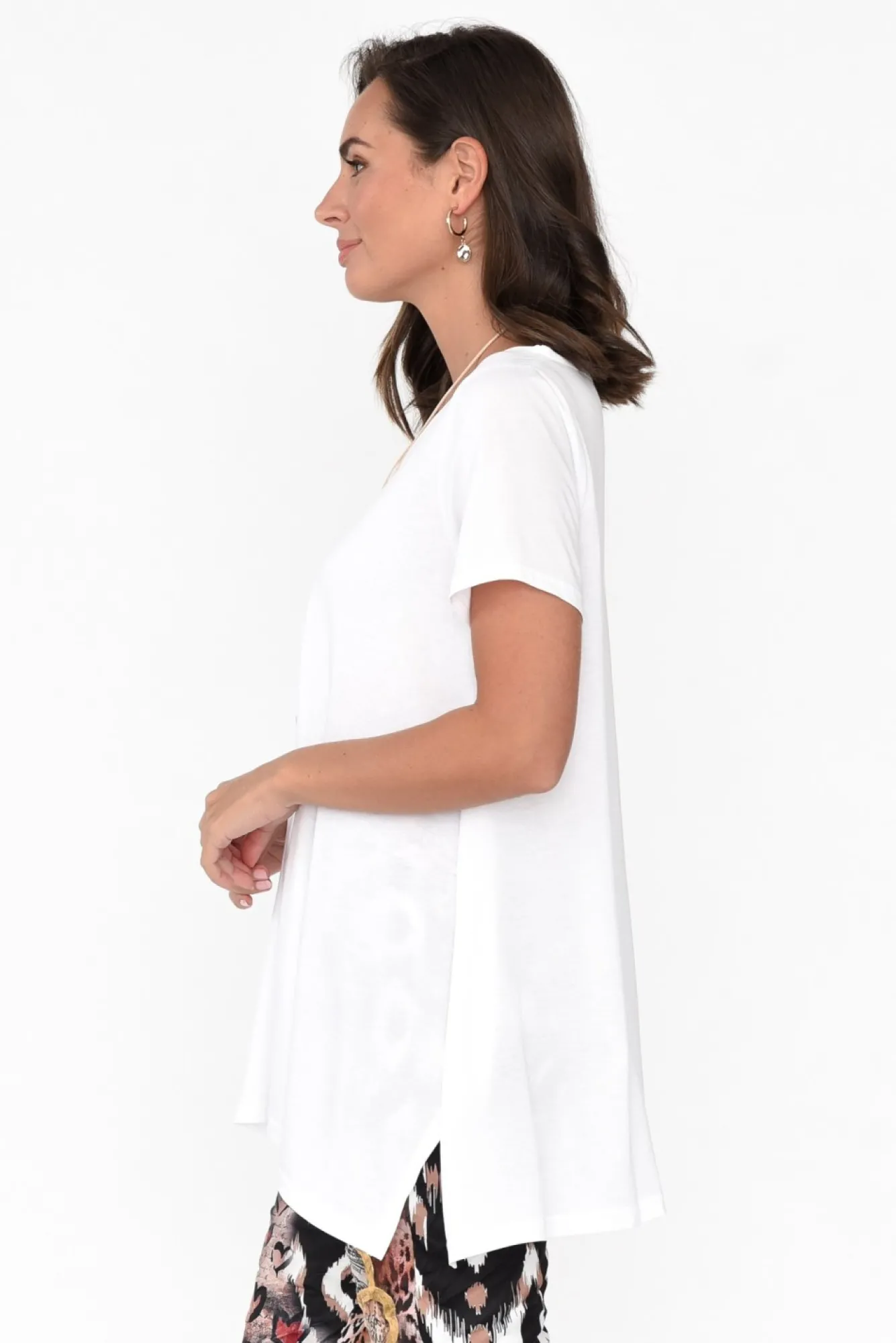 Fit: True To Size. Refer To Size & Fit Tab Below For Specific Size RecommendationNNfabric: 40% Cotton. 40% Rayon. 20% PolyesterNan Elevated And Comfortable Basic Made From Gorgeous Lightweight, Non-Stretch, Ultra-Soft And Smooth FabricNsoft V-NecklineNNclassic Short SleevesNNdrape Silhouette Flatters Curves NNfeaturing 16Cm Side SplitsNNsubtle Hi-Lo Hemline Falls Below Hip LengthNNNcare: Cool Gentle Machine Wash RecommendedNNcolour: Staple White Shade