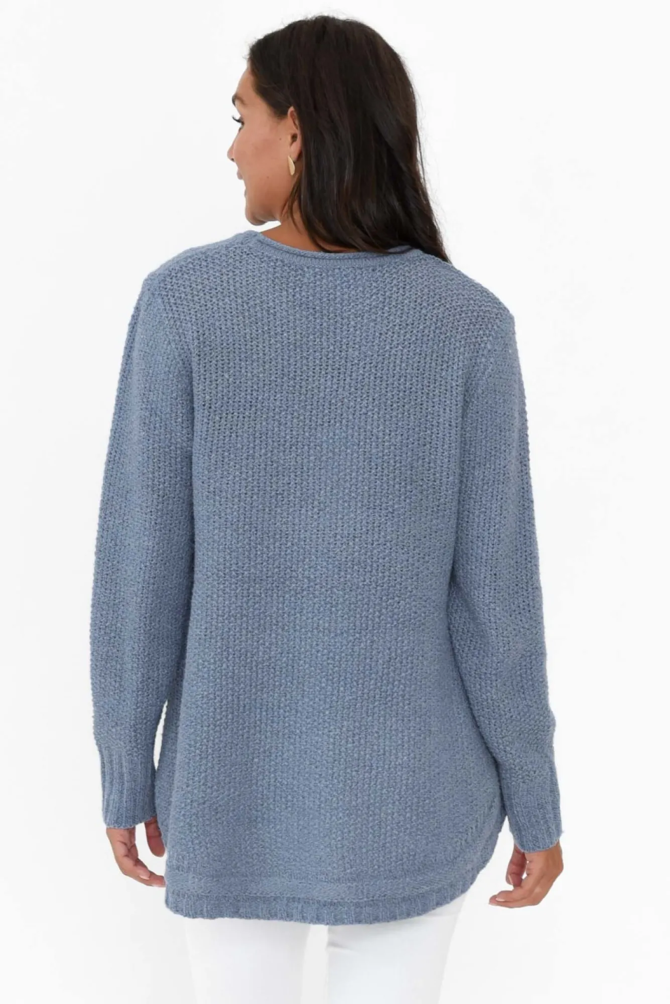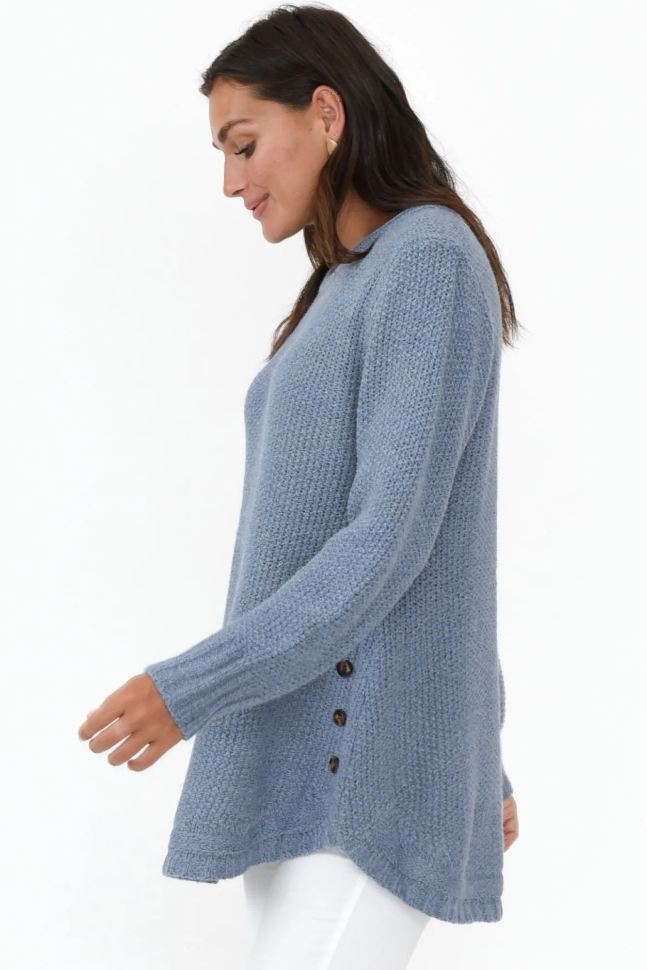 Fit: True To Size. Refer To Size & Fit Tab Below For Specific Size RecommendationNNfabric: Cotton/PolyesterNmade From Lovely Midweight Fabric With Loose Knit Finish NNfull-Length Sleeves Enhanced By Ribbed Cuff Detail Nround Neckline With Curled Trim Nstraight Silhouette For A Timeless LookNfixed Tortoiseshell Buttons Running Diagonally From Waist To Hem Ncurved Hemline Falls To Hip-Length NNNcare: Cool Gentle Hand Wash RecommendedNNcolour: Washed Slate Blue Shade