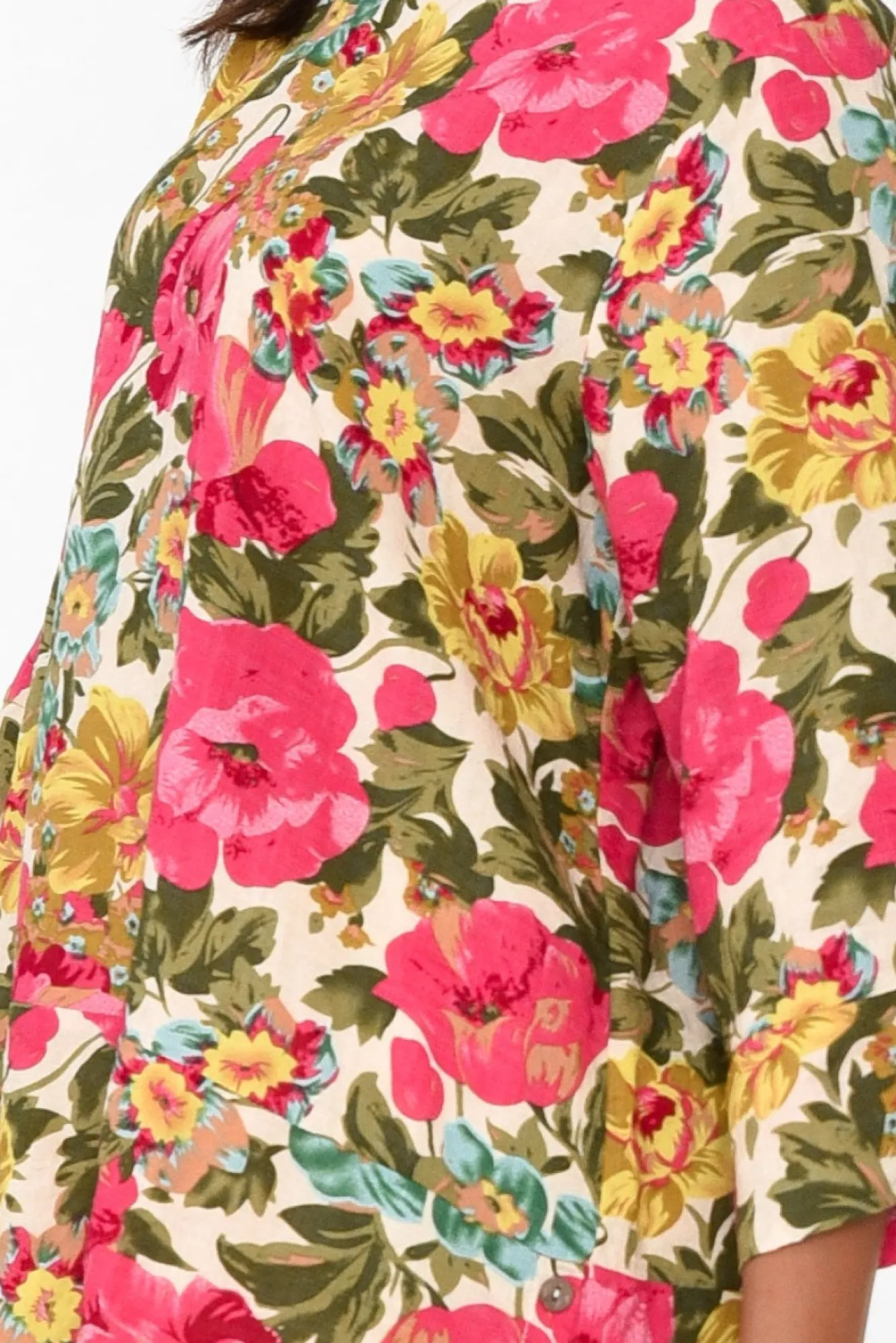 Fit: True To Size. Refer To Size & Fit Tab Below For Specific Size RecommendationNNfabric: Cotton/PolyesterNbreezy, Lightweight And Non-Stretch Cotton Blend Fabric With A Smooth Woven Hand Feel NNsimple Round Neckline Skims The Collarbones NNstraight 3/4 Length Sleeves With Fixed Button Details At The Cuff NNversatile A-Line Silhouette With Subtle Flaring At The Hips NNhemline Falls To The Hips And Features Fixed Wooden Buttons At The Side Seams NNcare: Cool Gentle Hand Wash RecommendedNNcolour: Lush Floral Print In Pink And Olives Hues